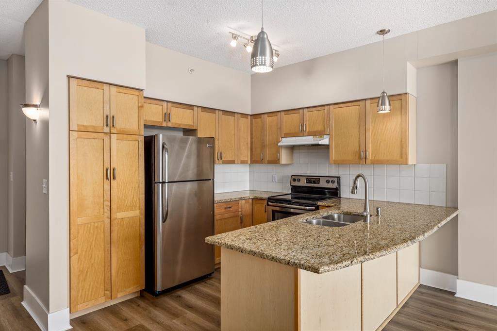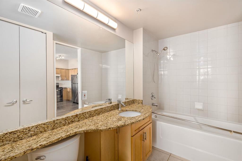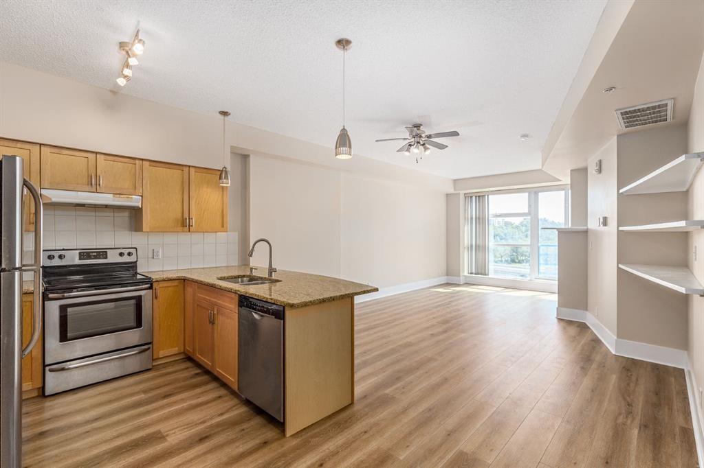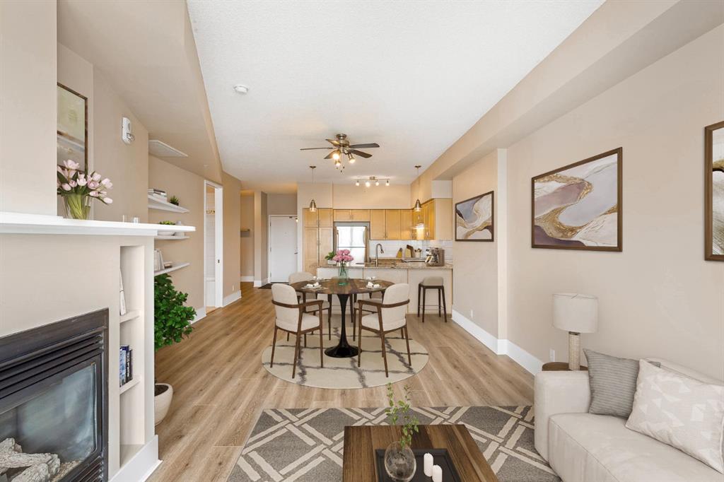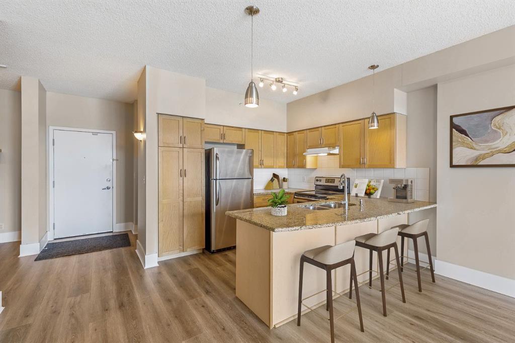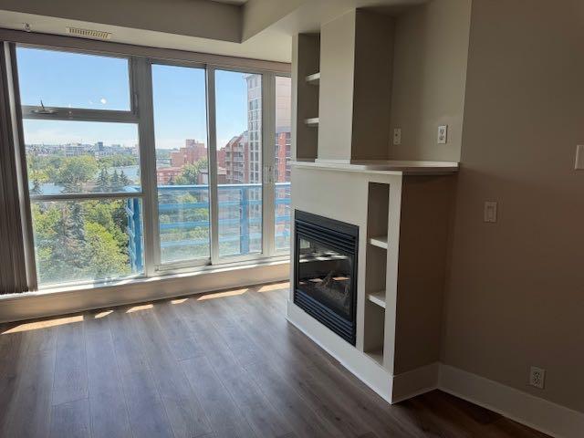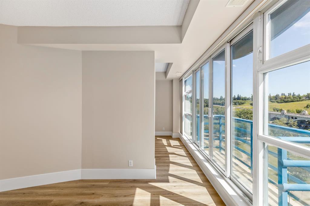 Welcome to 205 Riverfront: an immaculate condo building overlooking the Bow River and situated in the heart of Chinatown. Indulge in a rare opportunity to own a beautifully appointed 8th floor suite in one of Calgary’s most desirable downtown addresses. This spacious and light-filled 1 Bed 1 Bath offers nearly 800 square feet of stylish urban living, highlighted by floor-to-ceiling windows that frame captivating views of the Bow River, Centre Street Bridge, and the vibrant city skyline. The thoughtfully designed open concept layout features a modern kitchen with granite countertops and stainless-steel appliances, seamlessly flowing into the living and dining areas—perfect for both entertaining and everyday living. A cozy gas fireplace and custom built-ins add warmth and character, while the expansive private balcony invites you to relax and take in sweeping views of the stunning surroundings. The serene bedroom retreat includes a walk-through closet and luxurious 4-piece ensuite. A versatile den upon entering is the perfect home office, fitness area, reading nook, or bonus storage space. Additional highlights include fresh paint and brand new laminate flooring throughout, central A/C and heat, in-suite laundry, and an underground parking stall in the heated parkade. Positioned directly across from the Bow River Pathway system and Sien Lok Park, and mere steps to shops in Eau Claire, Chinatown, East Village, and the Downtown Core, this location offers unmatched convenience. Enjoy 24-hour concierge service, secure concrete construction, and easy access to the LRT, bountiful restaurants, cafes and lounges, entertainment venues, and Calgary’s +15 network. Whether you’re a professional, an investor, or looking to integrate into the heart of the city, this is your chance to live in a truly iconic location where comfort, style, and walkable city living meet.