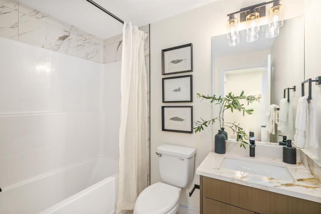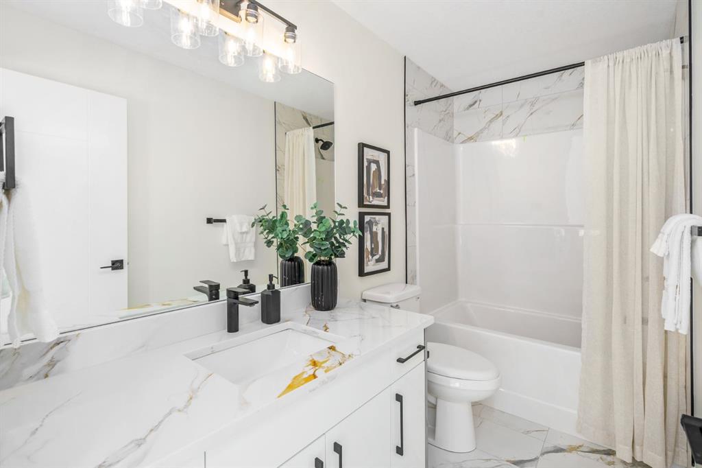 Upstairs, a vaulted bonus room offers a bright family retreat. The upper laundry room includes tile flooring and a quartz folding counter. The primary suite features large windows and a spa-inspired ensuite with dual quartz vanity, soaking tub, fully tiled shower, separate toilet room, and walk-in closet. Two additional spacious bedrooms — one with a walk-in — share a beautifully finished four-piece bathroom.