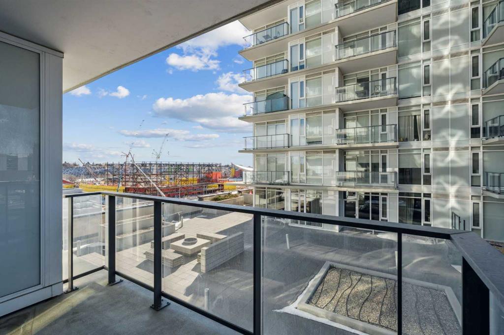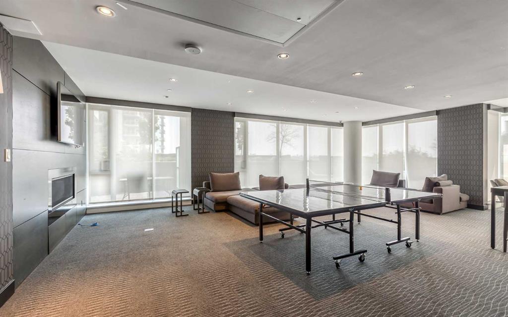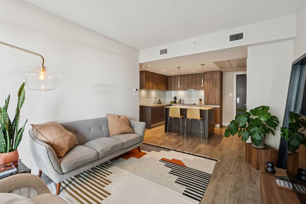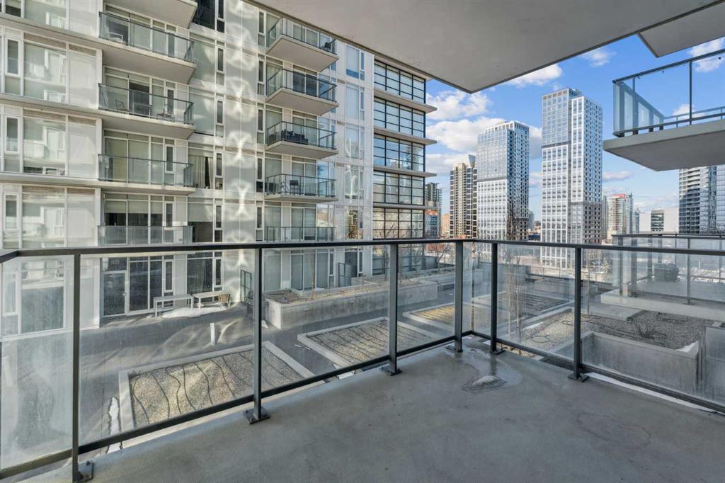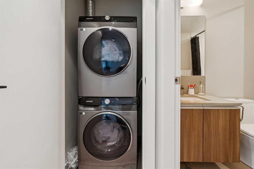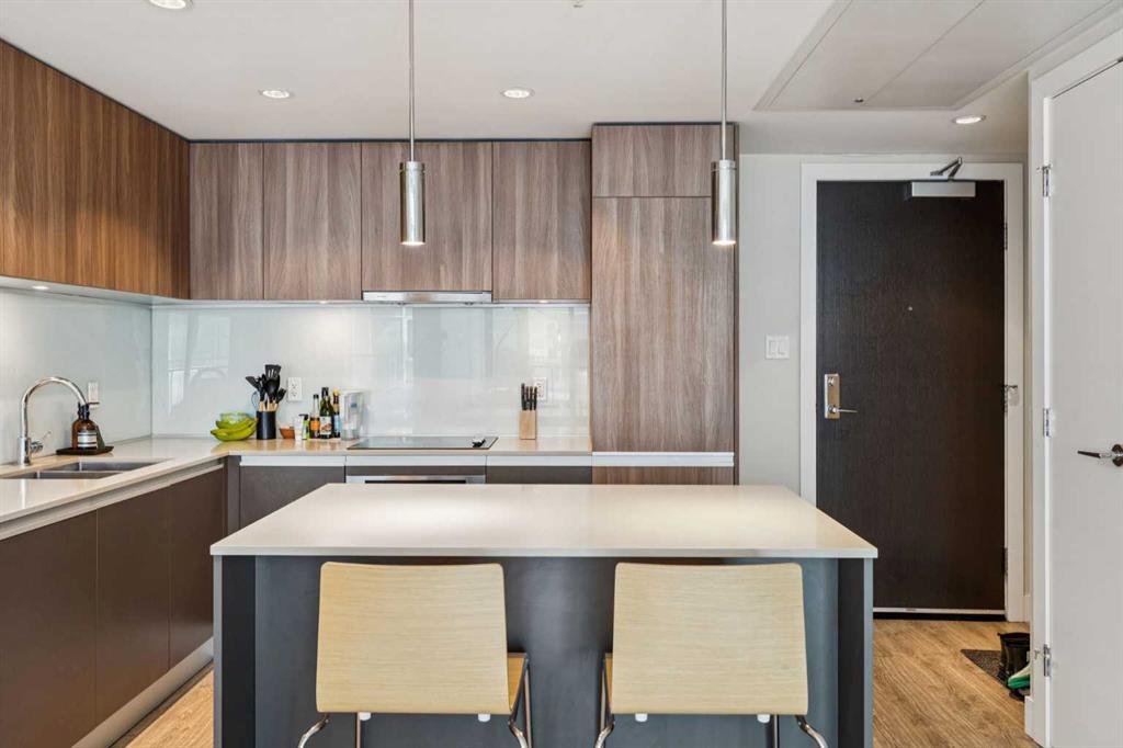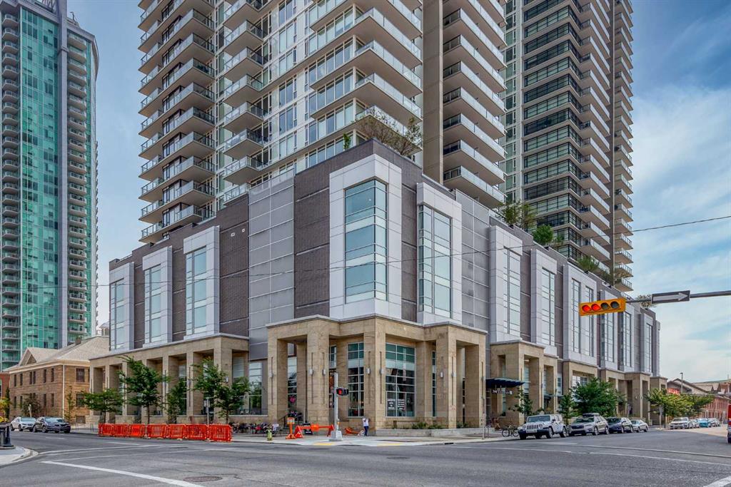 Undeniable Value with this impeccably maintained one bedroom suite at The Guardian North tower. Immersed in Calgary’s evolving Culture + Entertainment District you are steps from the action and a stones throw from the new Flames arena and Stampede Grounds. The European inspired designer kitchen features custom two tone cabinetry, a built-in fridge, Miele cooktop, built-in dishwasher and quartz countertops with undermount sink. A solid slab quartz backsplash is featured throughout the kitchen. The convenient island accentuated by pendant lighting is home to a microwave nook and seating nook for barstools. The unit is bright with floor to ceiling windows throughout. Laminate hardwood floors extend throughout the living area and anchor the spacious living room with ample room for a couch and chairs. The living room offers access to the large covered patio with views. The primary bedroom also features floor-to-ceiling windows and allows easy access to the refined 4-piece bathroom. The bathroom features a soaker tub and tiled shower combo. The pedestal sink carries through the European styled cabinets from the kitchen and quartz countertops with undermount sink. Rounding out this incredible offering is a full blinds package, newer Samsung stackable washer and dryer unit, assigned storage locker and low condo fees. The Guardian North Tower offers an incredible amenity package including fully equipped commercial sized fitness centre, a Workshop equipped with workbench and hand tools, a 1,350 square foot Social Club that opens onto the spacious Garden Terrace. Parking in the building available for lease. An amazing opportunity at an unbeatable price to become part of Calgary’s exciting entertainment district.
