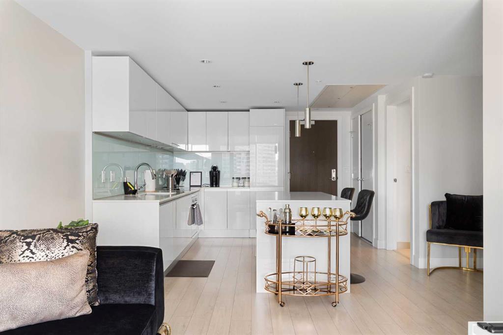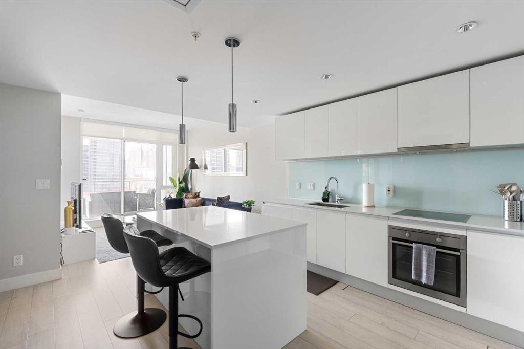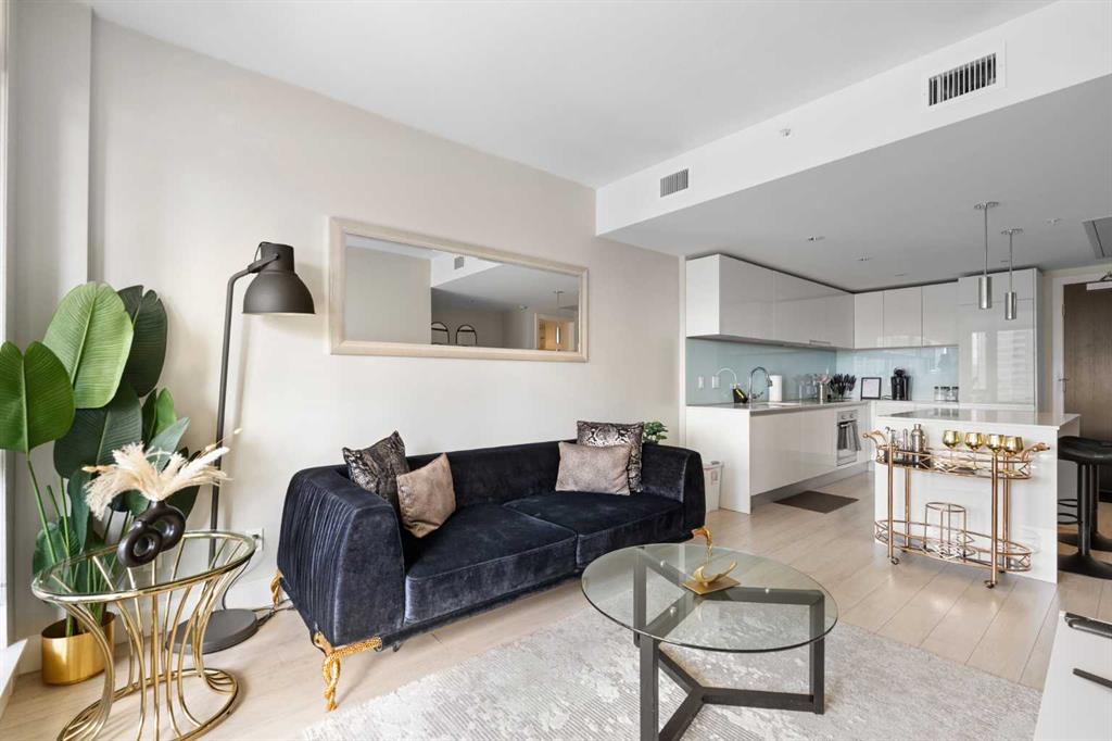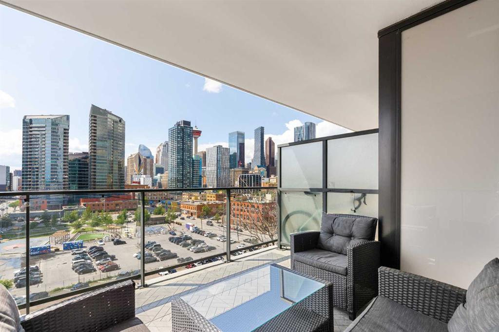 Enjoy upscale downtown living in this stylish 1-bedroom condo perched on the 8th floor of The Guardian, one of Calgary’s most recognizable residential towers. Showcasing west-facing skyline views through expansive floor-to-ceiling windows, this home blends contemporary design with functional comfort. The open-concept layout features a modern kitchen with a centre island, quartz countertops and sleek cabinetry, perfect for everything from quick meals to evening entertaining. The bright living room opens to a generous balcony, creating a seamless flow between indoor and outdoor space. The bedroom offers full-height windows, a walk-through closet and convenient access to the well-appointed 4-piece bathroom. Stay cool with central air conditioning, enjoy the ease of in-suite laundry, and benefit from titled underground parking. This secure, amenity-rich building includes 24-hour concierge service, a state-of-the-art fitness centre, yoga room, workshop, lounge with TVs and kitchen and a landscaped rooftop terrace with BBQs, fire tables, and panoramic views. Located in the heart of Calgary’s urban core, The Guardian puts you steps from the C-Train, Stampede Grounds, East Village, Repsol Centre, river pathways, and the restaurants, boutiques, and nightlife of 17th Avenue. Whether you’re a professional, investor, or first-time buyer, this is your chance to own a sophisticated retreat in one of the city’s most vibrant communities.