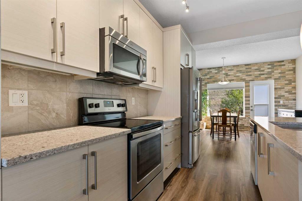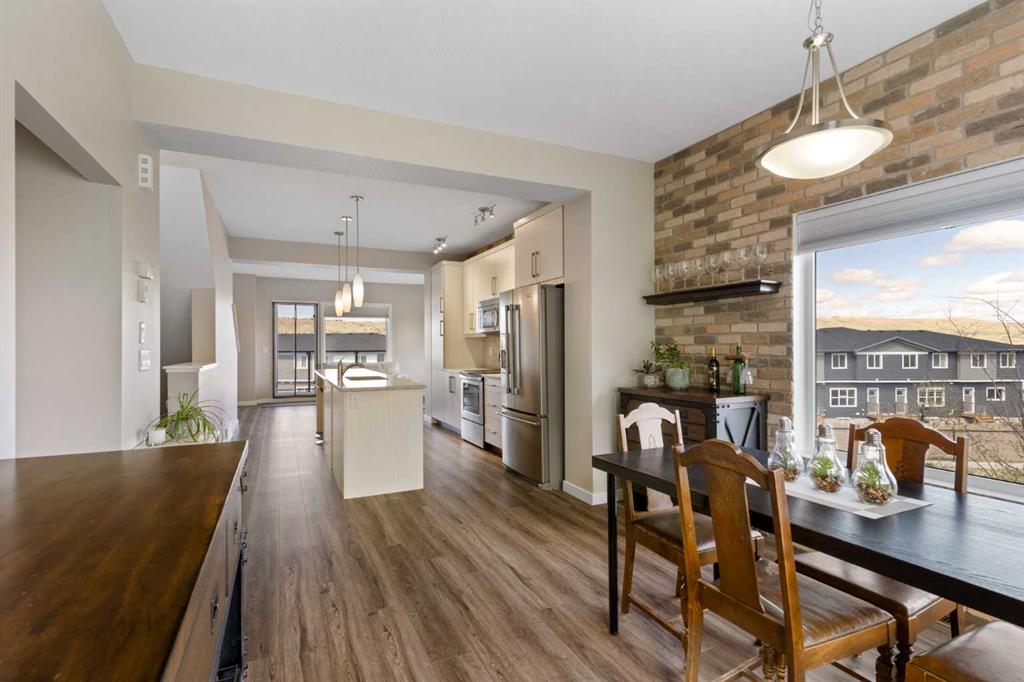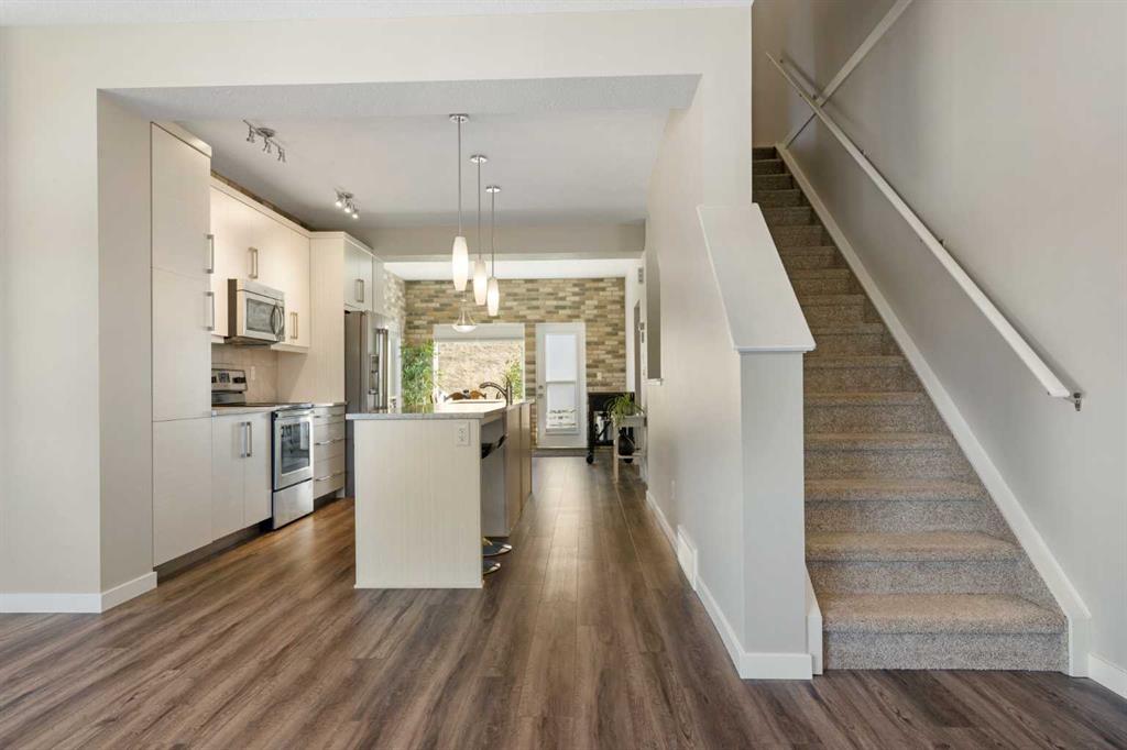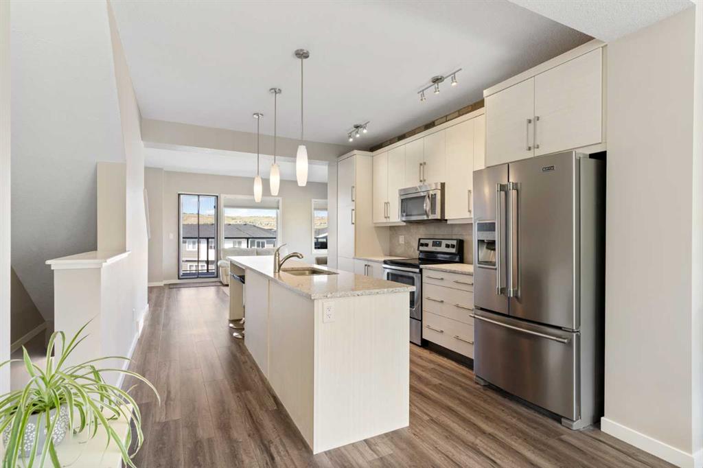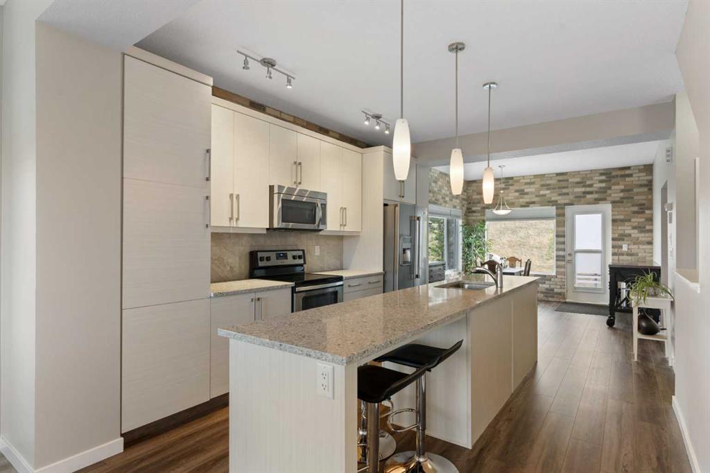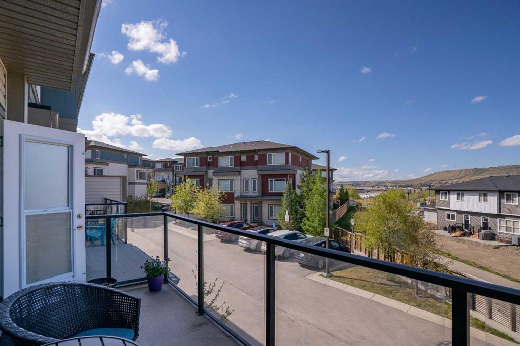 Upstairs offers 3 bedrooms and 2.5 bathrooms, creating one of the most functional layouts in the complex, with elevated views toward Cochrane. The oversized tandem garage comfortably fits two vehicles with extra room for storage.