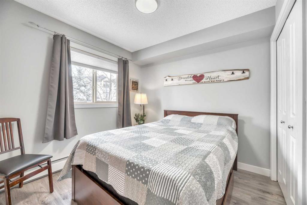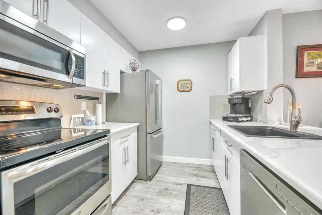 Ground floor unit backing onto Greenspace! Easy access to this well and updated maintained bedroom condo. Open floor plan. Gleaming white kitchen with stainless steel appliances and breakfast bar open to bright and open living room with access to ground floor patio. 2 spacious sized bedrooms. The primary has a walkthrough closet and 3 piece ensuite. Additional space ideal for small office. Insuite laundry. Very functional immaculateunit. Condo fees incude heat and water, one parking stall. Close to Shopping, Dining, Gas, Tim Horton’s. Great location near all amenities, very walkable! Great commuting to Calgary from the heart of Airdre!
