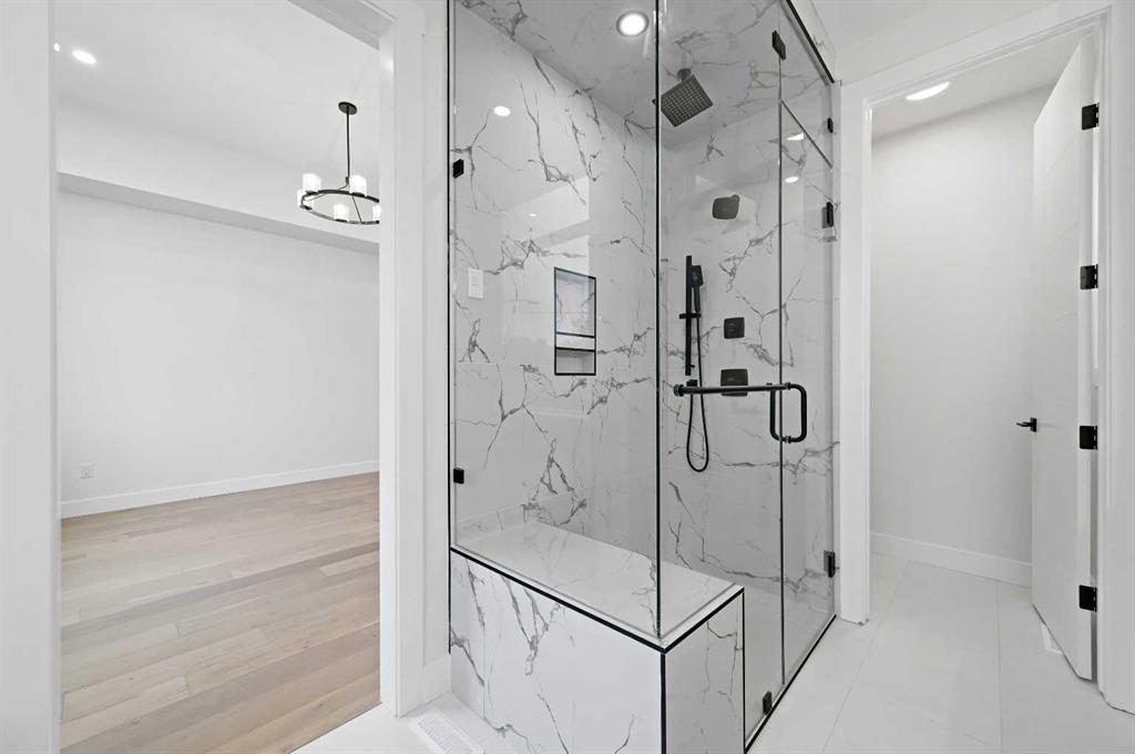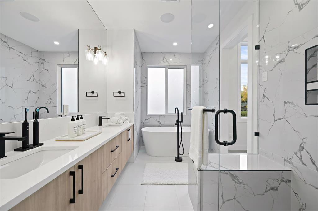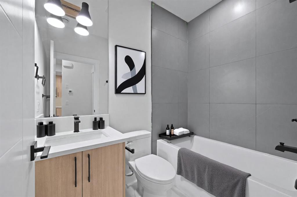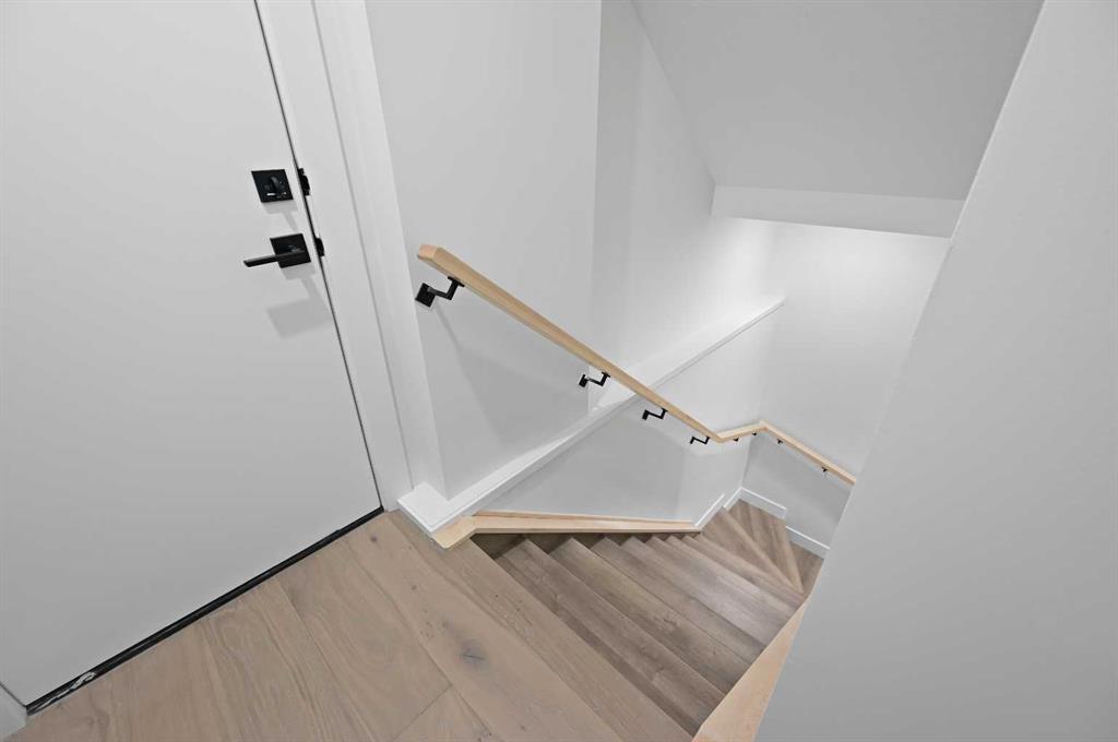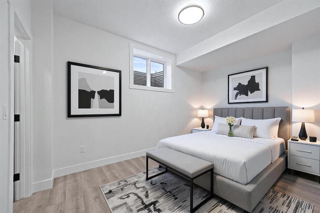 Calling all Investors! Looking for a brand new SXS Duplex with legal basement suites? This 8112 unit can be sold together with attached 8114 to provide an excellent cash flowing opportunity with the convenience of having all construction materials and components still under New Home Warranty. Both 8112 and 8114 are rented on long term leases with tenants who would prefer to stay. This unit rents monthly at $2900 for the upper suite + 70% util. and $1250 + 30% util. for the lower suite. Amazing home boasting elevated design and incredible functionality, featuring a legal 2-bedroom basement suite and a sunny south exposed front with expansive valley views from the upper floor. Every detail was thoughtfully selected, from the wide-plank modern floors to the curated lighting and premium finishes throughout. Step inside to a bright, open-concept main floor with 10′ ceilings, oversized windows and neutral tones that create an airy, inviting vibe. The large, well-lit dining room is perfect for bigger families and/or hosting guests and shows off a vibrant and colourful feature wall, which flows seamlessly into a designer kitchen featuring modern warm toned cabinetry, paired with beautifully coloured glass backsplash, quartz countertops, matte black hardware, a huge walk-in pantry with built-in shelving, and a perfect-sized center island with bar seating with more natural wood tones, bringing everything together beautifully. The upgraded stainless steel appliance package includes an oversized sub zero fridge with french doors, a gas cooktop with stylish hood fan, and a thoughtfully placed wall oven and microwave. The rear living room is wide and spacious featuring additional large windows plus a cozy gas fireplace with stone surround and custom mantle, and which leads you out to the large backyard, which features an oversized concrete pad, perfect for end of the day BBQ’s and lounging. An enclosed mudroom with a large closet area and a sleek powder room that comes with a raised matte black sink complete the mainfloor. Upstairs contains the three large bedrooms, all with trayed ceilings, including the primary bedroom which is a true retreat that features a large walk-in closet with several custom built-ins plus a hotel like ensuite. Enjoy heated tile flooring, dual sinks, quartz countertops, matching tile surrounds, plus a free standing soaker tub and an oversized glass shower with rain shower head and roughed-in for steam. The upper laundry room comes with a sink, quartz countertops, additional wood toned cabinetry, and is situated beside the stylish full bathroom which features a tiled tub/shower combo. Downstairs features the thoughtfully designed legal 2 bedroom suite and features 9′ ceilings, luxury vinyl plank flooring, wonderfully warm toned cabinetry, stainless steel appliances and lots of pot lighting. A full bathroom with elegant tile is also featured plus a dedicated laundry room, separate side entrance and storage, making this perfect for rental income.