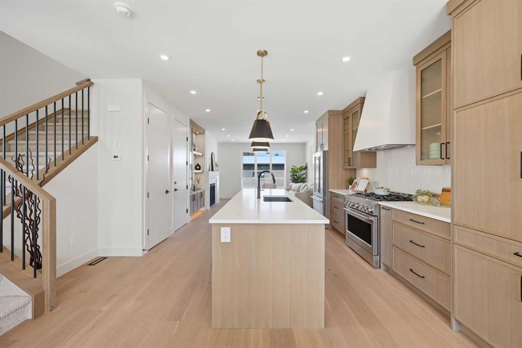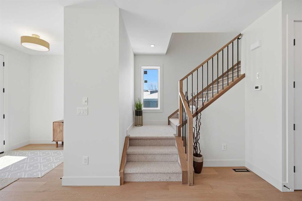 SOLID Built with Luxury in Mind on a quiet street – Another project from Sarai Custom Homes -A Builder you can trust. Located in the vibrant community of Bowness, this semi-detached home blends modern design with practical living and a prime inner-city lifestyle close to parks, schools, and everyday amenities. The main floor features a bright, open layout with a stylish OAK kitchen offering full-height cabinetry, a large island, and thoughtful storage, flowing into a warm living room anchored by a gas fireplace and large windows that fill the space with natural light. A functional mudroom, powder room, and a lot of storage for daily convenience.