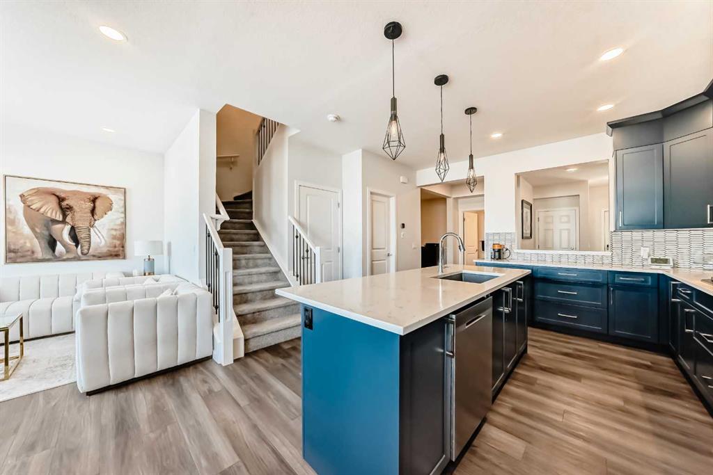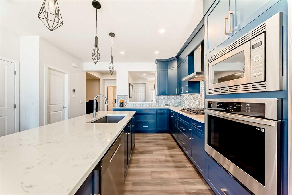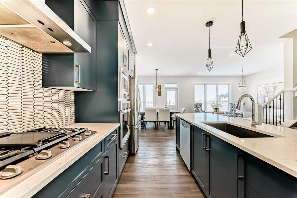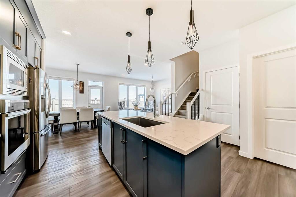 Move in before the school year starts and enjoy lake living all summer in the sought-after community of Mahogany. This beautifully designed 3-bedroom, 2.5-bath home offers 2,252 sq ft of stylish and functional living space, featuring an open-concept main floor with a standout kitchen complete with built-in appliances, a gas range, ceiling-height cabinets with crown moulding, a large island with ample storage, and an oversized pantry. The main floor also includes a convenient office, elegant open railings, and electric blinds throughout. Upstairs, all bedrooms are generously sized, with the secondary rooms offering walk-in closets and extra windows, while the primary suite boasts a luxurious 5-piece ensuite with a deep soaker tub and oversized shower. The basement is ready for future development with 9-foot ceilings and a bathroom rough-in. Outside, enjoy a fully fenced and landscaped yard with low-maintenance stone pathways and no rear neighbors, all just steps from parks, pathways, Mahogany Village Market, and with quick access to 88 Street and Stoney Trail for ultimate convenience.