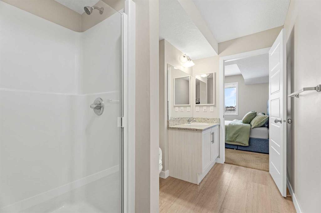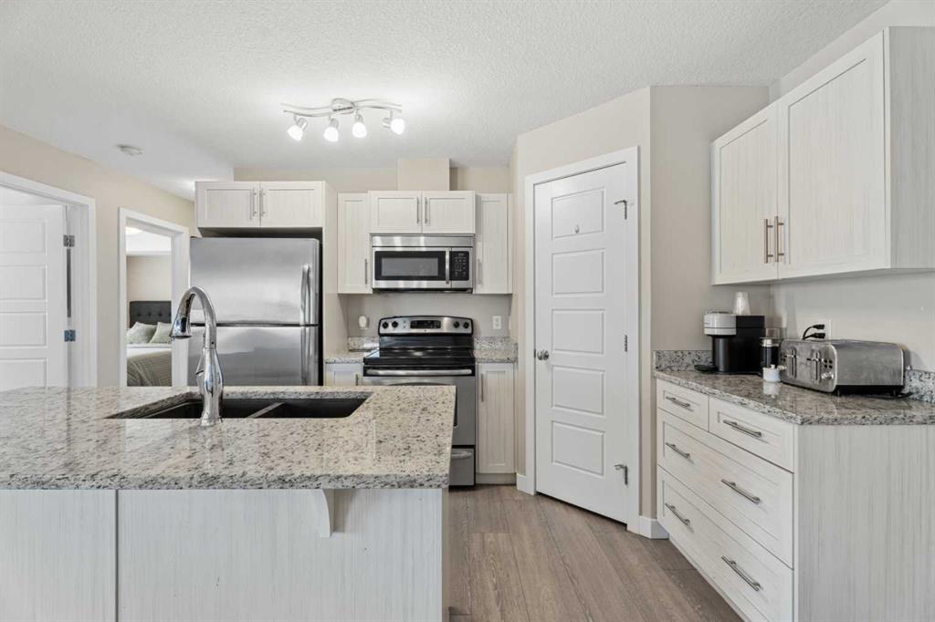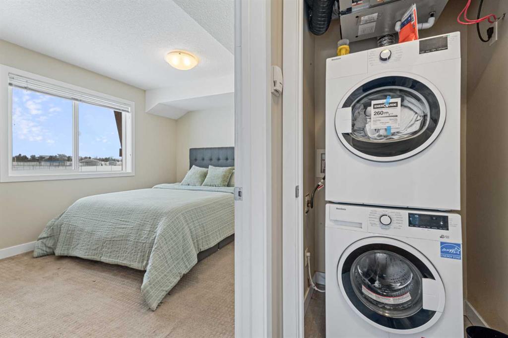 Located in the Chinook Crossing complex in Prairie Springs, this 2 bedroom, 2 bathroom stacked townhouse offers low-maintenance living with an upscale feel perfectly positioned beside Chinook Winds Regional Park. A private entry leads up to a bright, open-concept main level with a comfortable living area and a stylish kitchen featuring white cabinetry, stainless steel appliances, a corner pantry, and a centre island with breakfast bar, as well as plenty of space to style a dining area to suit your lifestyle. The full 4-piece bathroom serves the main living space and has direct access to the second bedroom, while the primary bedroom is tucked at the back with its own 3-piece ensuite and generous walk-in closet. In-suite laundry and extra storage keep daily living streamlined. Outside, you’re within walking distance of Chinook Winds Regional Park—with its spray park, playgrounds, sports fields, skate park, and pathways—and just a short drive to tennis courts, schools, shopping, restaurants, and major routes like Yankee Valley Boulevard and the QEII, creating a refined yet functional home base in SW Airdrie.