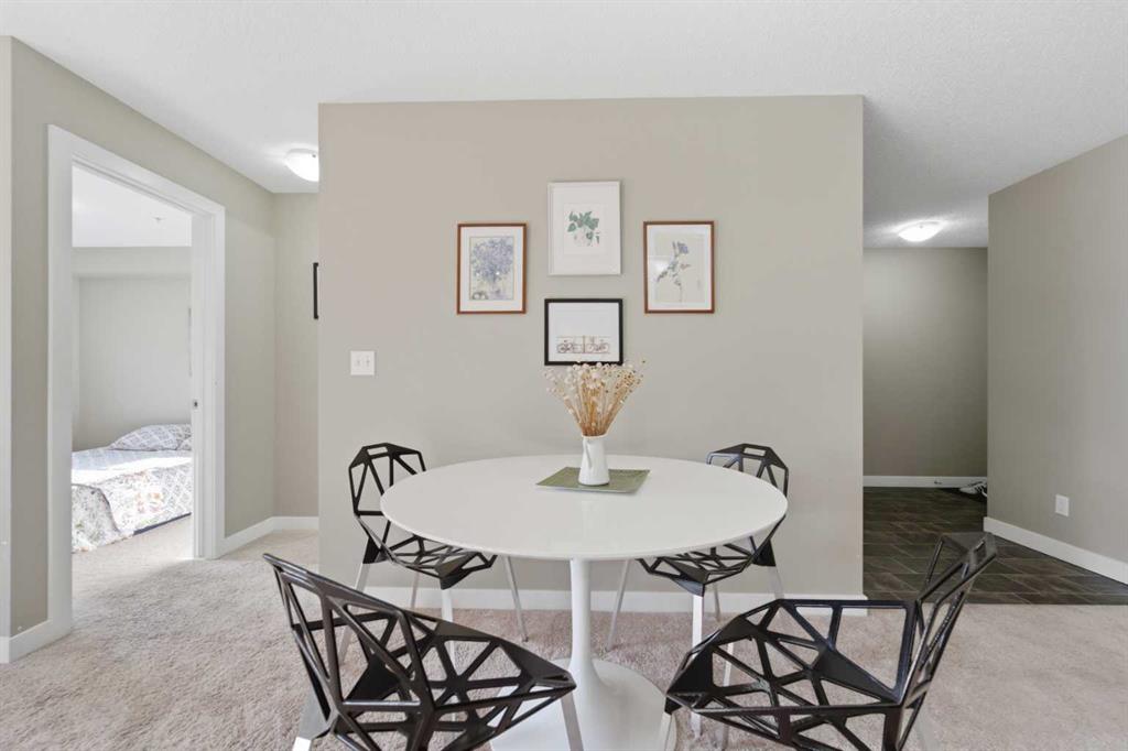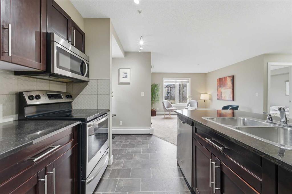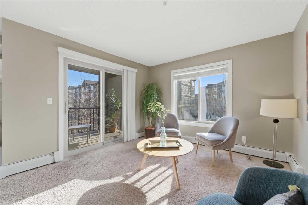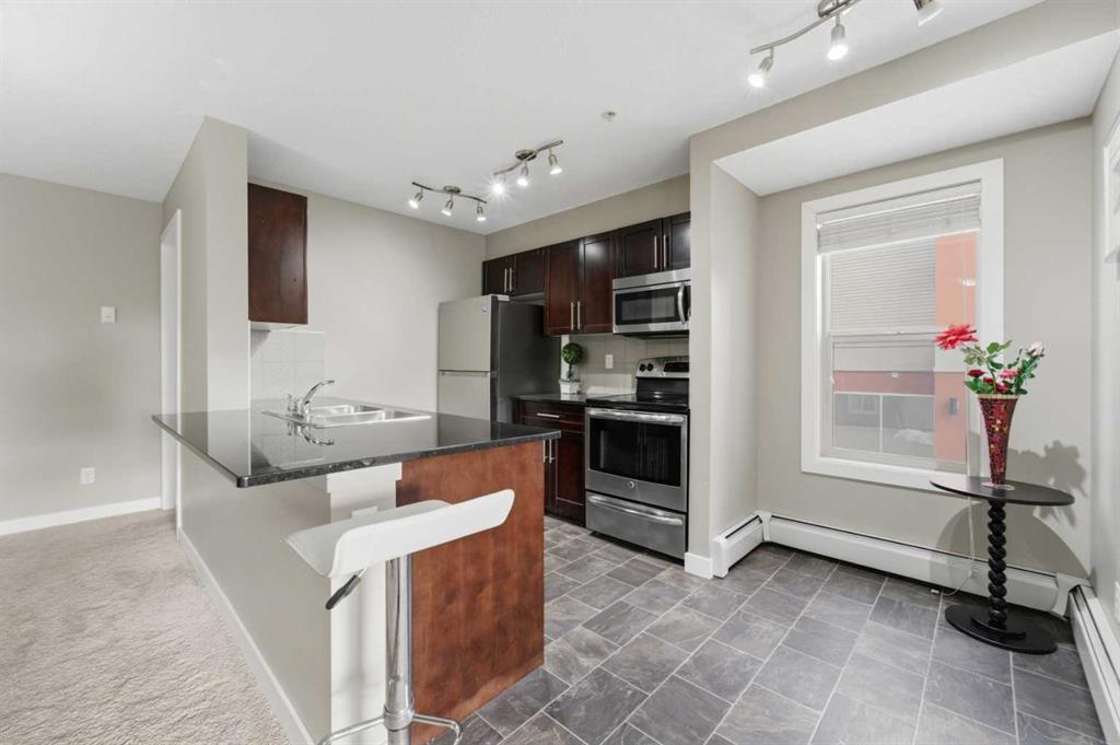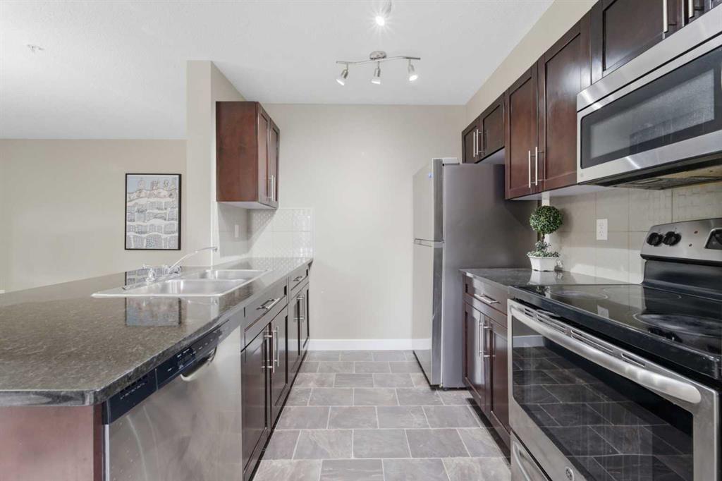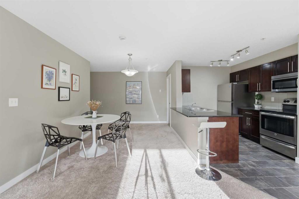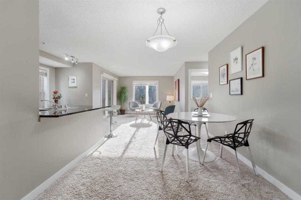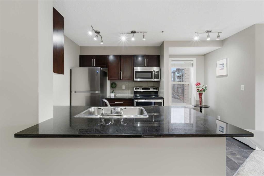 OPEN HOUSE: this Saturday and Sunday (May 2-3) 11 AM to 1:30 PM. Welcome home to this two-bedroom, two-bathroom corner unit in the highly sought after Creekside Crossing community. Located on the second floor with north and east exposure, to be cool in summer and provide a lovely cross breeze. The corner balcony, provides additional living space and a great place to relax after a long day. This open concept layout, has room for a home office near the entry, large living and dining area with 2 bedrooms, with their own ensuites located on the opposite end of suite, perfect for privacy and ideal for sharing with a room mate. Upgraded kitchen with granite counter tops, steel appliances and breakfast bar. Additional conveniences include in suite laundry, ample storage, and a heated, titled underground parking stall for year round comfort. Located in Downtown Airdrie; with a walk score of 82… — steps from grocery stores, cafés, restaurants, fitness facilities, medical services, parks, pathways, and transit. Available for immediate occupancy! Why rent when you can own? Book your private showing today .
