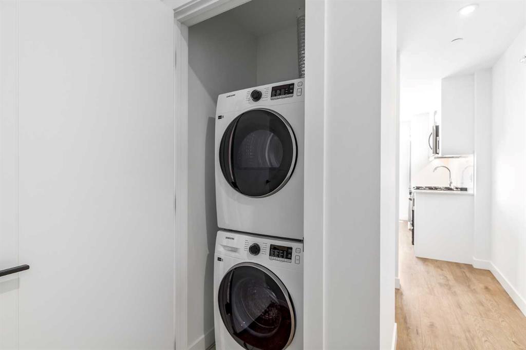 The bedroom provides a comfortable retreat alongside a contemporary four-piece bathroom. Everyday living is simplified with in-unit laundry and central air conditioning.