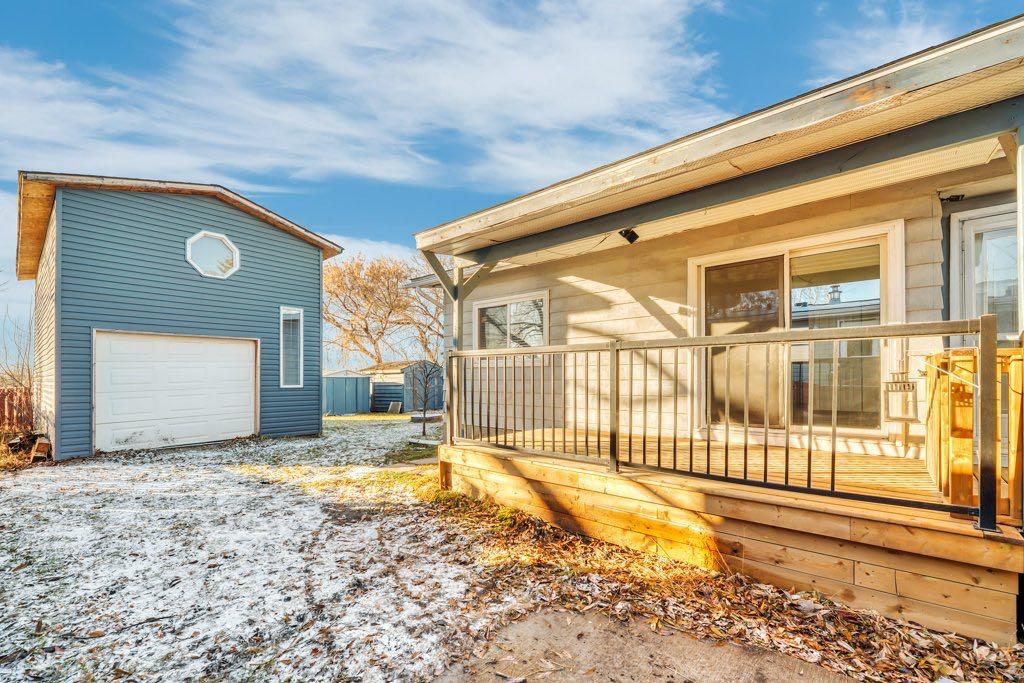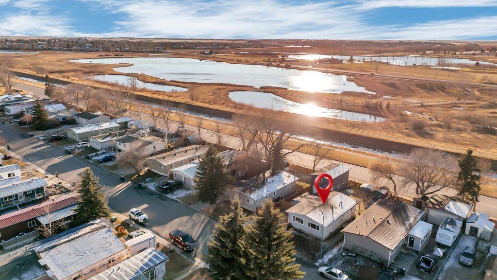 Think you can’t get an updated home with a fenced backyard, detached garage and a lake view in this price range?? Think again – this updated 2 bedroom home is spacious, open and absolutely bathed in natural light. The main living area is totally open concept with huge windows and there is newer luxury vinyl plank flooring throughout the whole home. You’ll feel inspired in this well equipped kitchen complete with stainless steel appliances, granite counters, cheery backsplash and a center island with extra seating. The 2 bedrooms are located at the end of the hall. The primary has popular sliding barn doors on the closet for a cozy farmhouse feel. The other bedroom is perfectly suited as a kids room or maybe a home office. A 3 pc bath with nice sized walk in shower is conveniently located close to the bedrooms but also easily accessed from the main living area for guests. The laundry room is nicely tucked to the side and offers an additional exterior door. Step out onto your side deck from the dining room where you’ll enjoy a view of Gray’s Lake. A fully fenced back yard comes with a covered patio area, 2 storage sheds and plenty of room for kids and pets to play. There is plenty of parking and a double gate leads to the single detached garage allowing for storage for a small RV if needed. The ceiling in the garage is super high creating the opportunity to add mezzanine storage. This terrific home is ideally located close to Brentwood Elementary School as well as the Strathmore Family Centre Arena and is just steps from Gray’s Park and its picturesque walking paths. If you’re looking for an affordable & adorable home in Strathmore don’t miss out on this little gem!