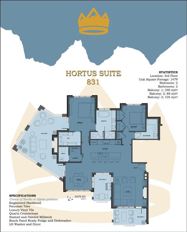 ** BOOK YOUR PRIVATE TOUR OF THE SHOW SUITE TODAY! ** Luxury Mountain Living with 3 Private Balconies – Welcome to Unit 831, located on the third floor of the newly released Hortus Building by The Canmore Renaissance, in the heart of Three Sisters Mountain Village. This spacious 2-bedroom, 2-bathroom residence offers an impressive 1,376 sq ft of interior living space, paired with three private balconies, including a massive 340 sq ft outdoor retreat—perfect for soaking in the surrounding mountain views. Inside, you’ll find a thoughtfully designed layout featuring a luxurious primary suite with a spa-inspired 5-piece ensuite, a spacious guest bedroom, and a second full 4-piece bathroom. The chef’s kitchen boasts quartz countertops, panel-ready Bosch appliances, stained and painted millwork, and “Nordic” design palette. Elegant finishes include engineered hardwood, porcelain tile, luxury vinyl tile, and an LG washer and dryer. This pet- and kid-friendly building offers access to exceptional amenities in the nearby Abruzzo Building, including underground parking, a fitness centre, and a shared recreation lounge. With only 8 luxury residences available in the Hortus Building, each offering a unique layout and view, this is a rare opportunity to secure a premier home in one of Canmore’s most sought-after developments. Contact us today for more information and full availability!
