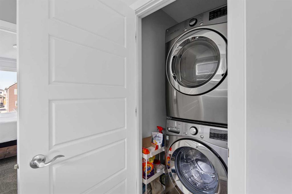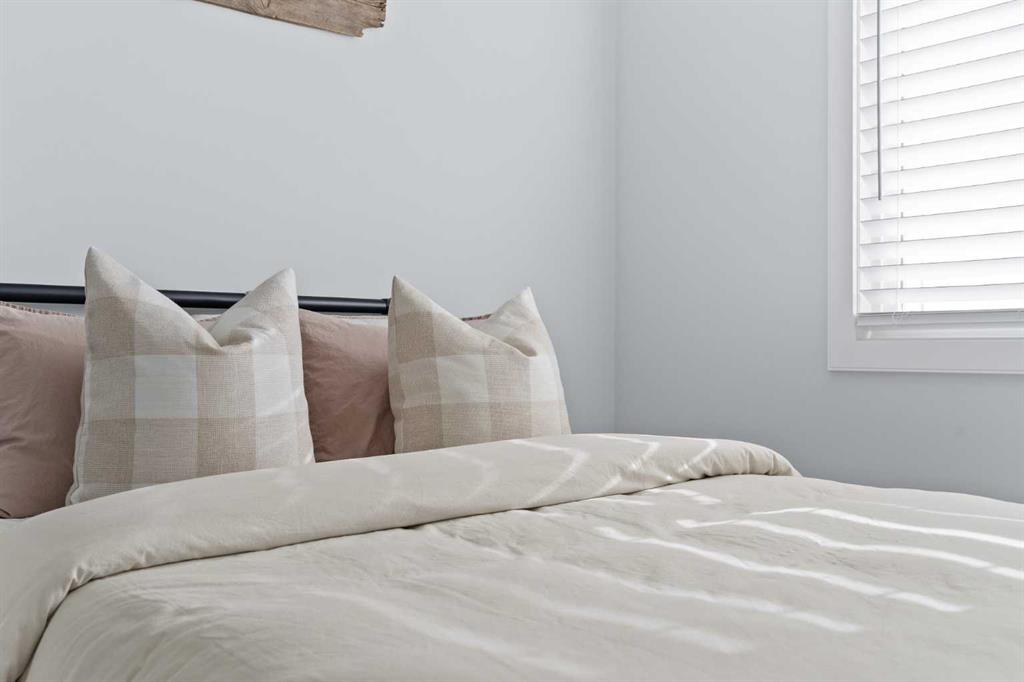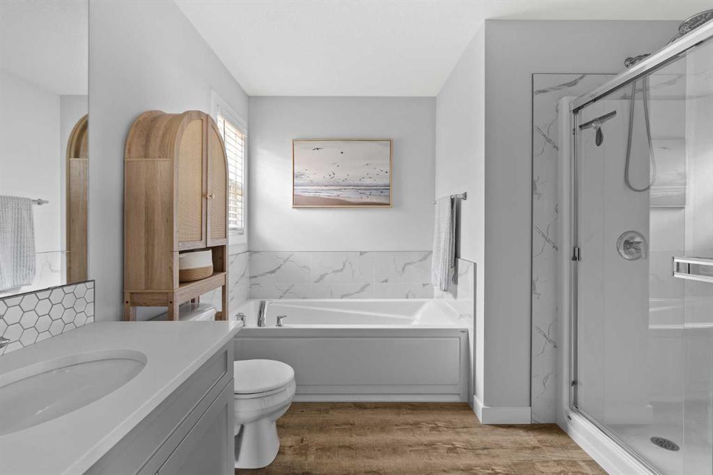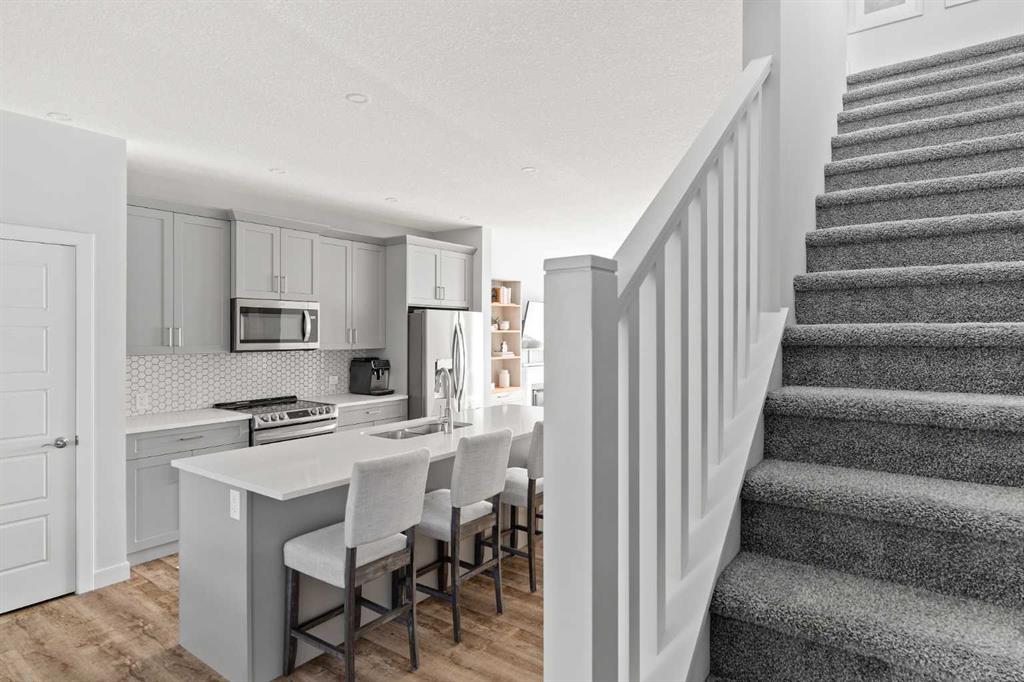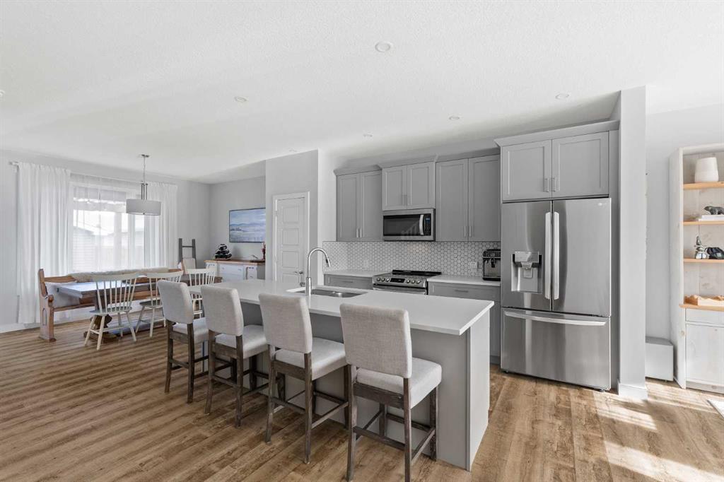 A pristine original-owner home in the heart of Chelsea, Chestermere – showcasing true pride of ownership and presenting as close to new as it gets. With nearly 1,650 sq. ft. of thoughtfully designed living space, this is the ideal family home offering 3 bedrooms, 2.5 bathrooms, a fully landscaped yard, a private double detached garage, and an undeveloped basement with rough-ins ready for your future vision. The open-concept main level is anchored by a stunning central kitchen, creating the perfect flow for both everyday living and entertaining. Finished with timeless light grey shaker cabinetry, an oversized quartz island, and a full suite of upgraded stainless-steel appliances, this kitchen is as functional as it is beautiful. A south-facing front great room is bathed in natural light through a wall of windows, while the expansive ~14′ x 10′ dining area at the rear comfortably accommodates any dining setup and overlooks the private backyard. A convenient powder room and large closets at both the front and back entrances complete the main level. On the upper level, the impressive ~14′ x 12′ primary suite easily fits a king-sized bed and additional furniture. It’s complete with a luxurious 5-piece ensuite featuring dual sinks, a soaker tub, a walk-in shower, and a generous walk-in closet with space for two. Two comfortable secondary bedrooms sit at the opposite end of the home, separated by a large main bathroom and an upper-level laundry room – an ideal layout for privacy and practicality. Outside, the property is fully landscaped, fenced, and completely move-in ready – saving you the time and cost typically associated with new construction. Enjoy multiple outdoor living spaces, including a charming full-width covered front porch to capture the south sun, and a large rear deck with gas line and pergola overlooking the private yard. The double detached garage provides secure parking and extra storage year-round – an especially appreciated benefit during the winter. Perfectly positioned within walking distance to parks, schools, and local amenities, while still only a quick drive to Calgary, this home delivers convenience, comfort, and exceptional value in the vibrant community of Chelsea in Chestermere. A truly move-in-ready home that combines thoughtful design, modern finishes, and unbeatable location – this is one you won’t want to miss.