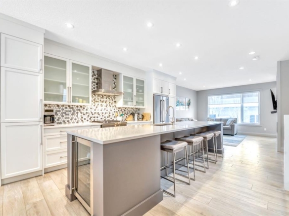The elegant Formal Dining Room features a Skylight and a Modern Batten Wall Design that adds warmth and character. The Gourmet Kitchen is truly the heart of the home, complete with Quartz Countertops, Custom Cabinetry, and a Large Island designed for both cooking and connection.