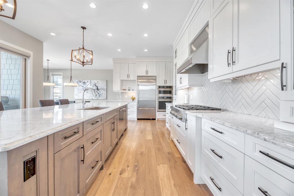 The main floor showcases an open-concept design with soaring ceilings, 8-foot doors, gorgeous hardwood flooring, and a seamless flow for everyday living and entertaining. At the heart of the home is the chef-inspired kitchen, beautifully appointed with upgraded built-in stainless steel appliances, granite and quartz countertops, an oversized island, and elevated cabinetry. Adjacent the kitchen, is a sizable dining room with an additional bank of cabinets, great for cocktails or coffee bar. A main floor den adds flexibility for a home office or quiet retreat.