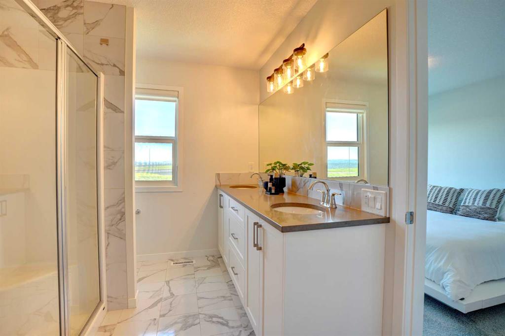 Upstairs, the spacious primary bedroom includes a dual-sink ensuite and a large walk-in closet. Two additional generously sized bedrooms and a full bathroom complete this level.