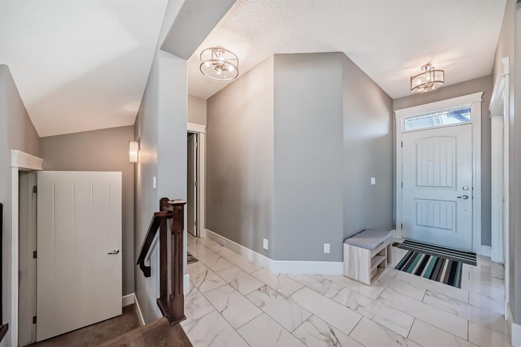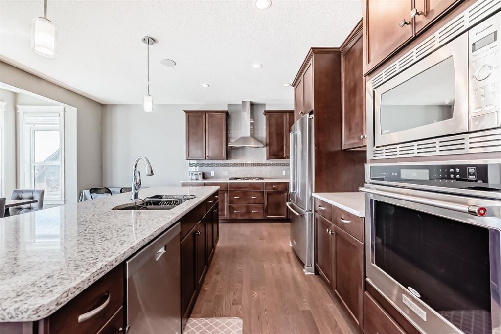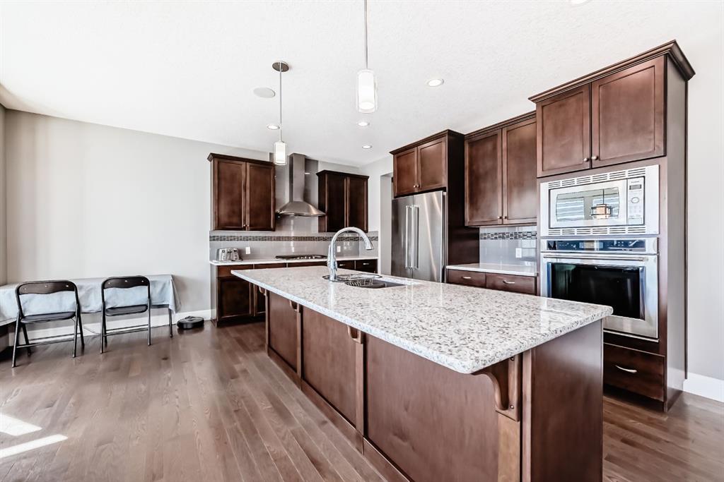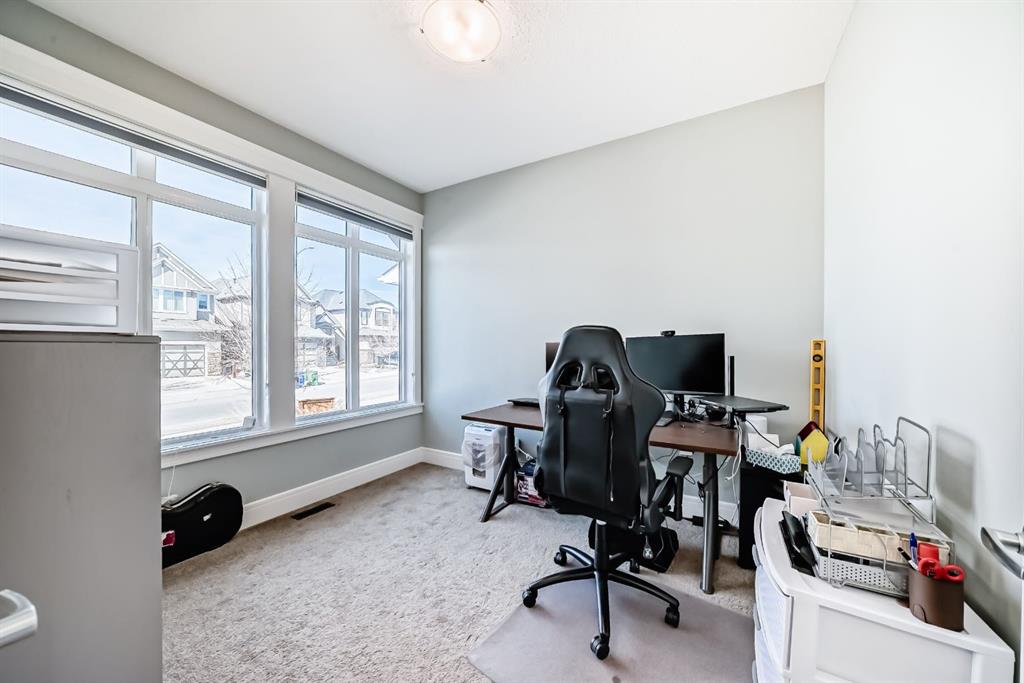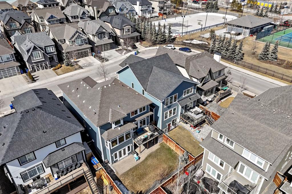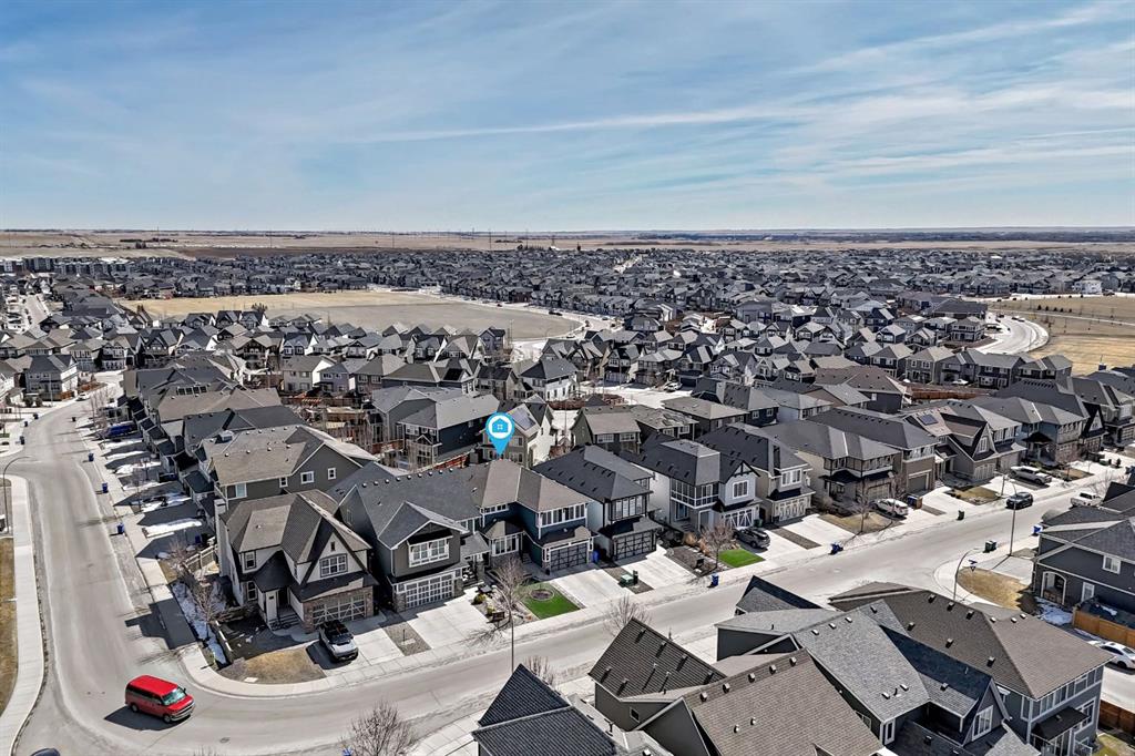 Exceptional 3077 sq. ft. 4-bedroom home in the award-winning lake community of Mahogany offering rare semi-private gate access just a 5-minute walk to the Main Mahogany Beach Club, 63-acre lake and extensive beachfront. This is a premier Mahogany location with tennis and pickleball courts and a dedicated skating rink directly across the street, plus basketball, playgrounds and the beach house all just steps away. The home features a spacious open-concept main floor with bright breakfast area, dedicated office and a well-appointed kitchen with large island ideal for entertaining. Functional mudroom with custom bench and walk-in cloakroom adds everyday practicality. Upstairs, a striking spiral staircase leads to a generous family/TV room. The primary bedroom offers a comfortable retreat while two west-facing bedrooms capture beautiful sunset views. Built-in speakers throughout the main floor, patio and upper ensuite enhance the living experience. Oversized double garage with high ceilings and epoxy finished flooring provides excellent storage or workspace potential. The walkout basement is undeveloped and ready for future customization, ideal for additional living space or income potential. Enjoy an east-facing backyard with sunrise views, plus a landscaped front yard with artificial turf, stone patio and raised flower bed. Located close to Mahogany wetlands, pathways, shopping and dining, and minutes from multiple gyms, golf courses and Calgary’s largest YMCA, this home combines space, functionality and one of the most desirable amenity-rich locations in Mahogany.