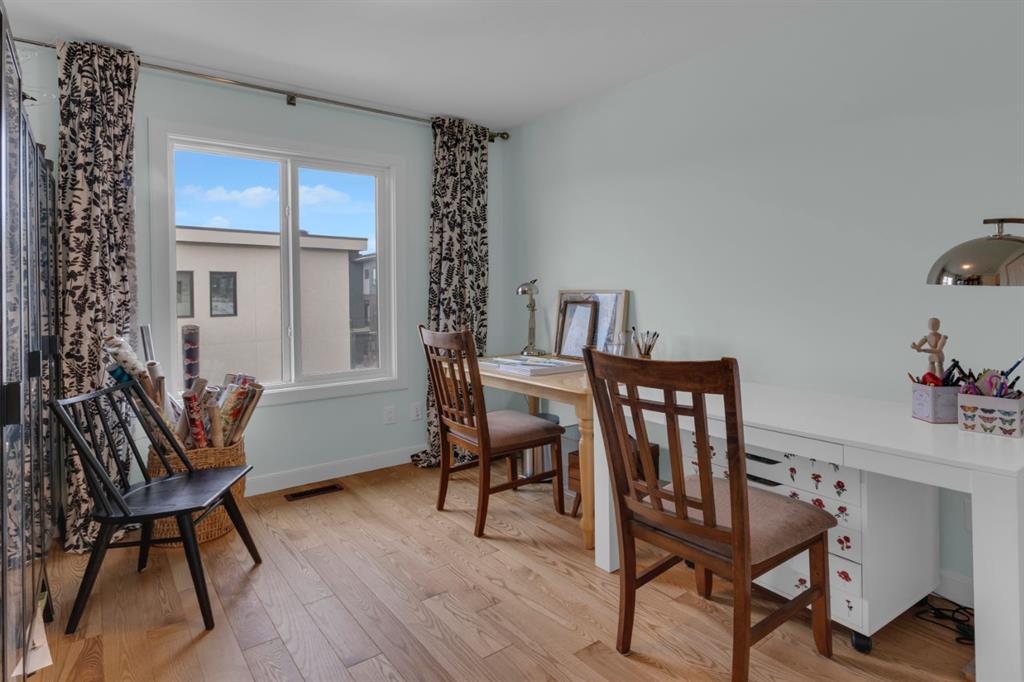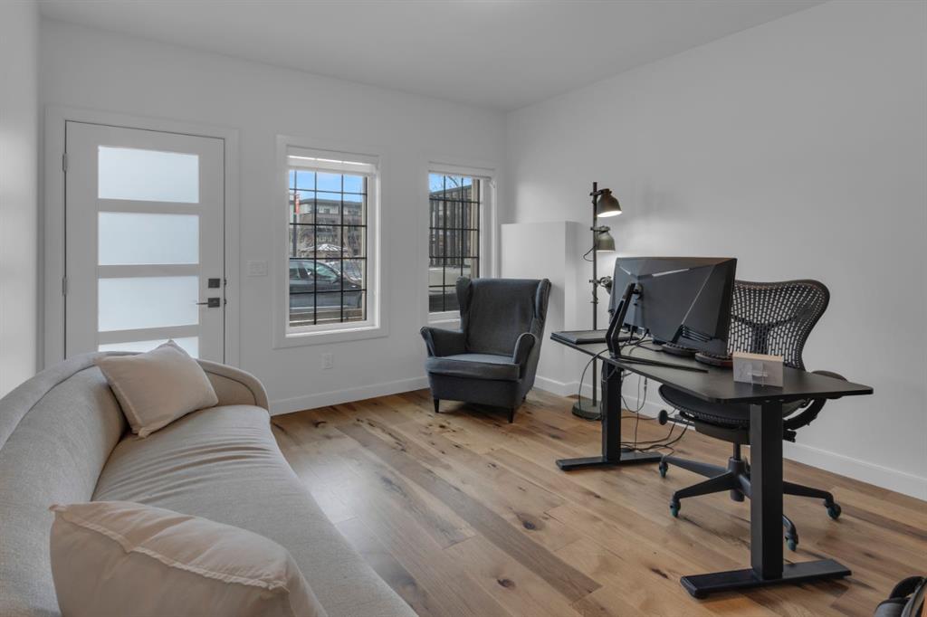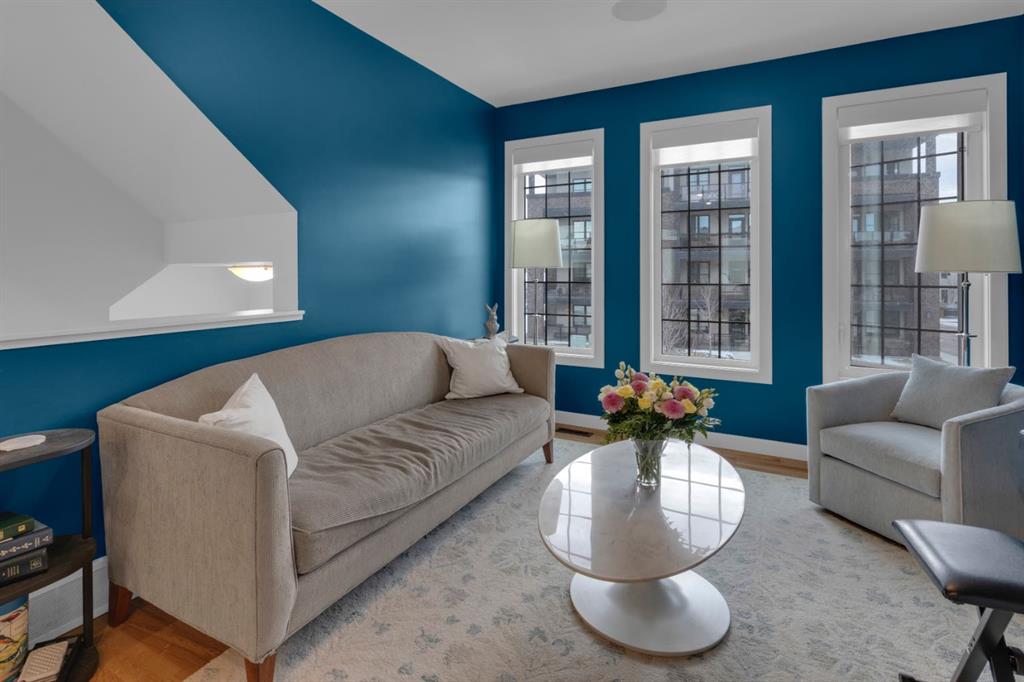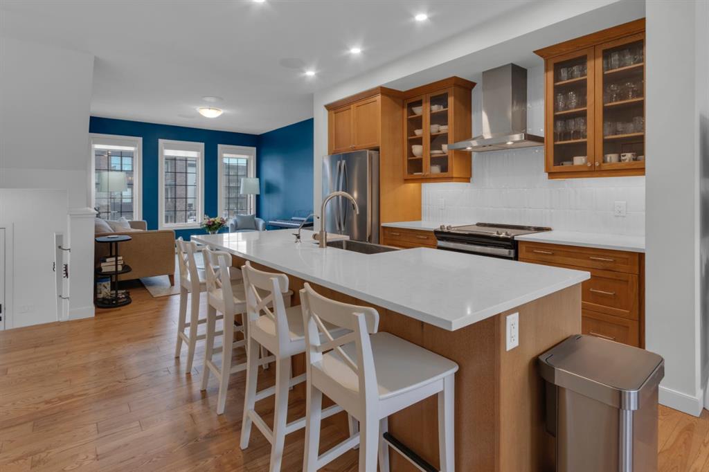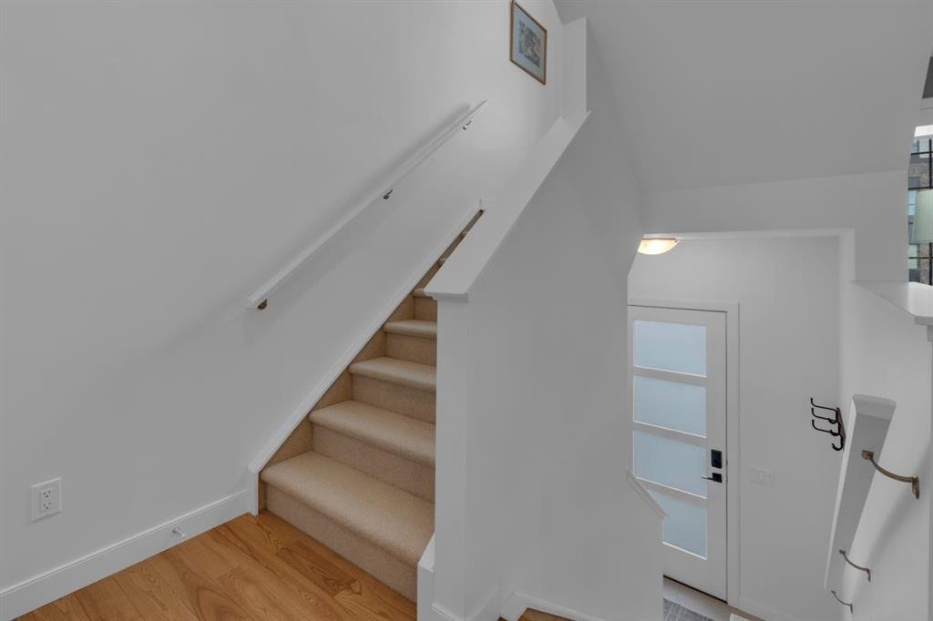 Timeless design and modern comfort come together in this beautifully finished 1,719 sq.ft. three-storey townhouse, showcasing a striking New York–inspired exterior and a thoughtfully designed interior. The lower level boasts the highly sought after double-wide attached garage option and a bright, versatile space ideal for a family room, home office, or flex area. Large windows fill the space with natural light, and engineered hardwood flooring extends throughout all three levels, creating a cohesive and refined feel. The main living area showcases a stunning kitchen that combines modern design with warmth and functionality. Wood cabinetry, quartz countertops, a farmhouse sink, white tile backsplash, and a practical mix of tile and engineered hardwood create a space ideal for both daily living and entertaining. The kitchen flows into a spacious dining area and a sun-filled living room that opens onto a large balcony, extending the living space to the outdoors. The upper level offers convenient laundry, three generously sized bedrooms, including a primary bedroom with a walk-in closet and a beautifully finished four-piece ensuite with porcelain tile flooring. With approx. $60,000 in upgrades, beyond an already high-end build, this home showcases smooth ceilings, quality craftsmanship, built-in ceiling speakers on the main level with included Sonos control system, excellent soundproofing between units, and a separate lower-level entrance. Additional features include central A/C, a 60-gallon hot water tank, a home that has never been smoked in or housed pets, and an outdoor gas line perfect for grilling. The location truly elevates this home, being close to WinSport, Calgary Farmer’s Market, and Bowness Park, residents enjoy nearby trails, quick access to Kananaskis, easy downtown commuting, and a variety of shopping, restaurant, and grocery options. This neighbourhood offers the perfect balance of outdoor adventure with everyday convenience, and this home combines modern sophistication, thoughtful upgrades, and an unbeatable location to deliver a living experience that is both comfortable and inspiring.