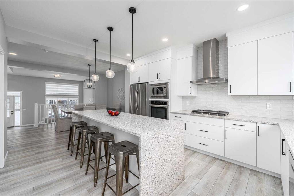 You’re getting a 10-foot quartz island with a waterfall edge, upgraded gas cooktop, built-in wall oven + microwave, chimney hood fan with tile backsplash going all the way to the roofline and a full-height slab profile cabinetry with pull-out garbage & recycling.