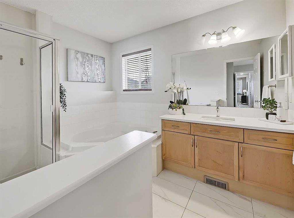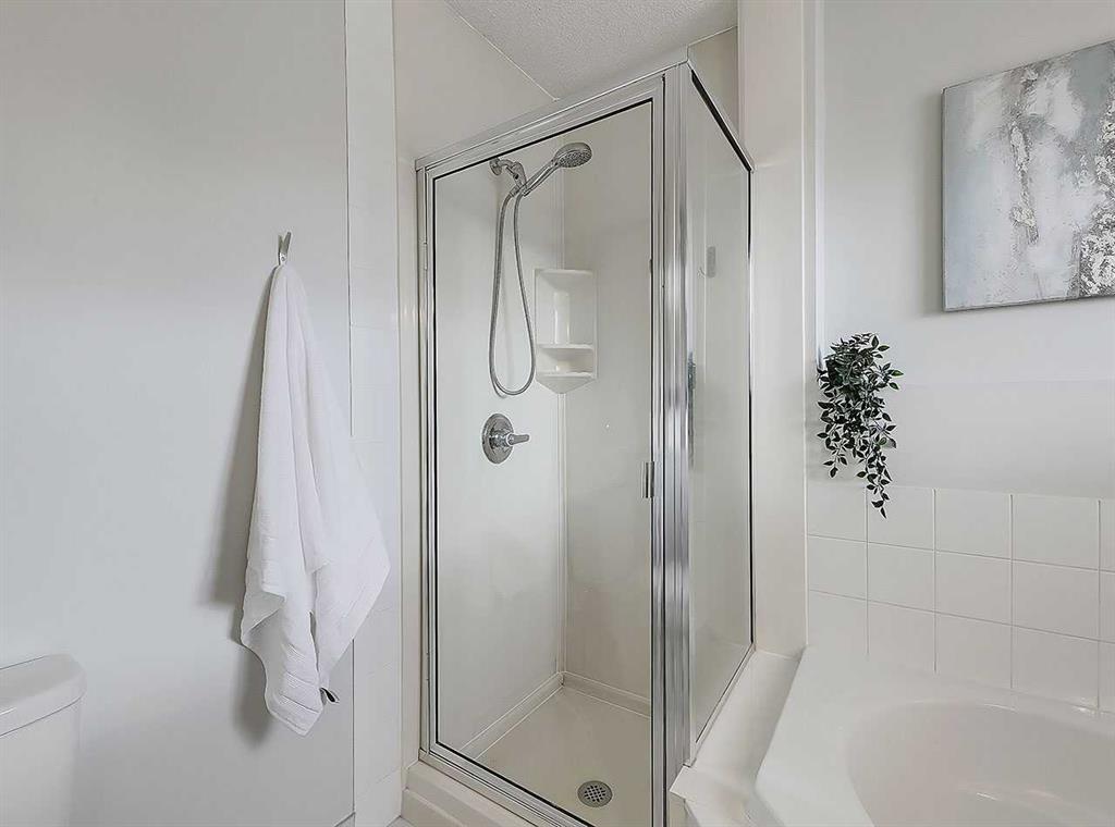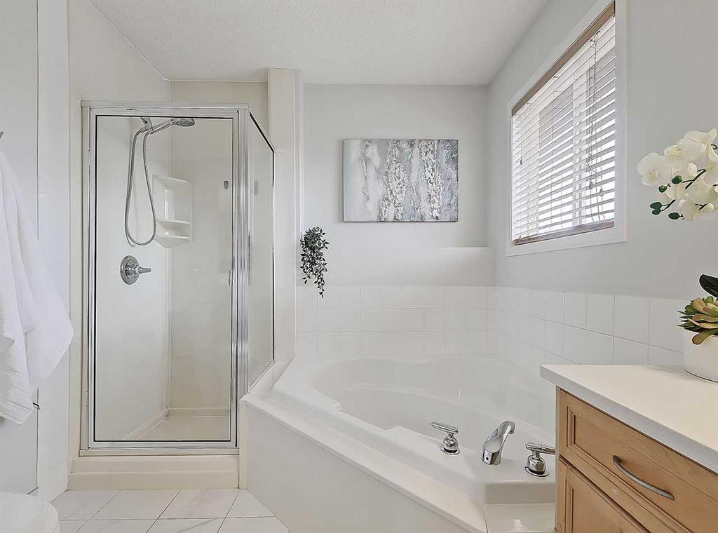 Upstairs a generous bonus room awaits, giving a reprieve from the direct sun & an ideal place for movie nights or to curl up with a good book. The primary bedroom is found at the back of the home, giving full views of the backyard & letting in more of that wonderful south sun. It’s complimented with a walk-in closet plus a renovated 4-pc ensuite oasis feat. a separate shower, deep corner soaker tub, & quartz countertop w/undermount sink. Finishing this upper level are two additional bedrooms, a shared (and also renovated) 4-pc bathroom w/matching quartz counter, undermount sink, & an actual laundry room w/side-by-side washer/dryer and shelving.
