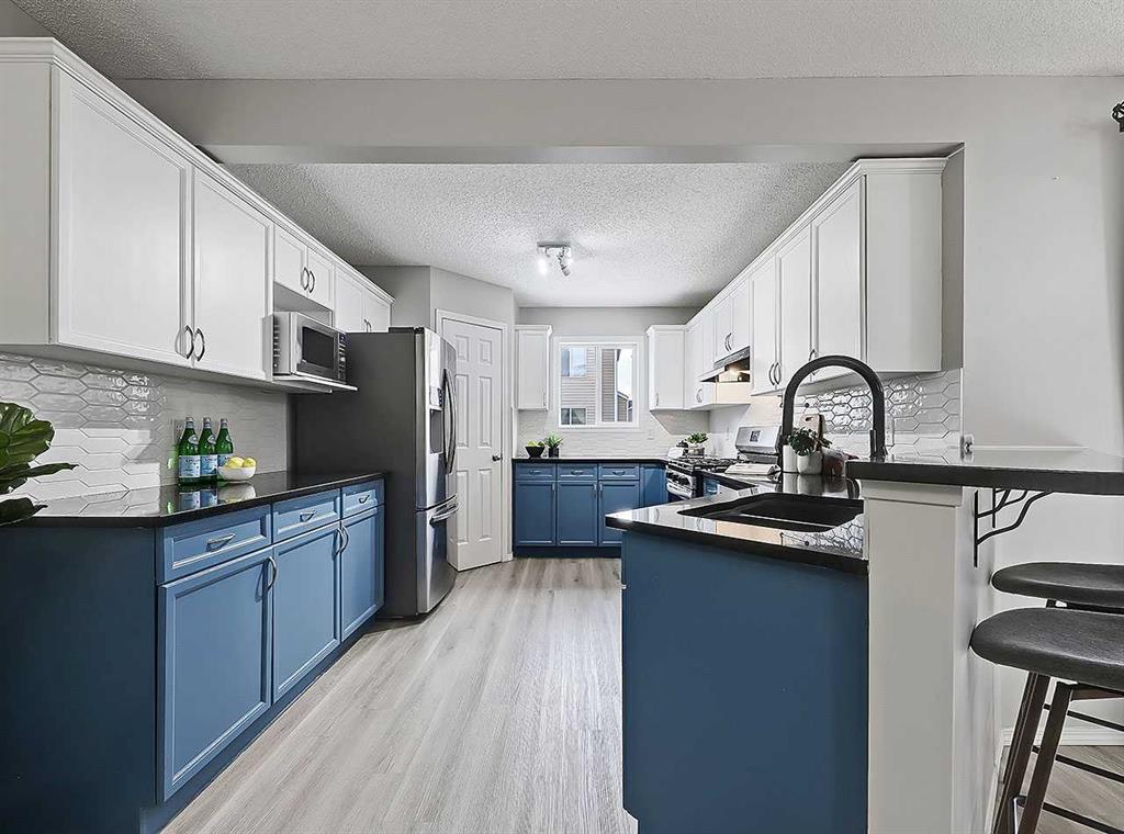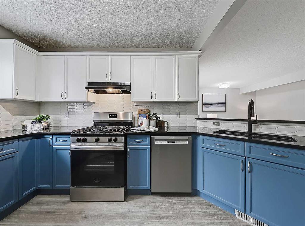 *OPEN HOUSE SUNDAY APRIL 12, 1:00-3:00pm* Here’s your incredible opportunity to own a rare gem in this sought-after NW community: An AIR-CONDITIONED fully finished 2-storey home with LEGAL, PERMITTED, BASEMENT SUITE – Complete with separate SIDE ENTRANCE! Nestled into one of the quiet cul-de-sacs of the community, this home has been lovingly updated & renovated. Step inside off the front porch & you’re first greeted with a den perfect for anyone working from home or needing a dedicated work space. Continue on and the home opens up to reveal a spacious living area complete w/dining room & totally filled with BRIGHT NATURAL LIGHT thanks to its ideal SW exposure. A cozy natural-gas fireplace is a wonderful treat for those cold winter days. Flowing throughout you’ll notice the quality vinyl plank flooring installed only a few years ago, offering years of resilient wear & beautiful modern neutral tones. The kitchen gives views to the backyard & has been updated with quartz countertops, a suite of stainless steel appliances & contemporary navy blue lower cabinets. The sink is located below the peninsula eating bar that looks out over the living room. Take a step outside through the sliding glass door and you’ll find a huge 16×17 deck, beckoning for days spent lounging in the sun & cooking steaks on the BBQ. The backyard just beyond is a gardener’s dream come true offering all the sunlight every plant could need, & endless growing potential!