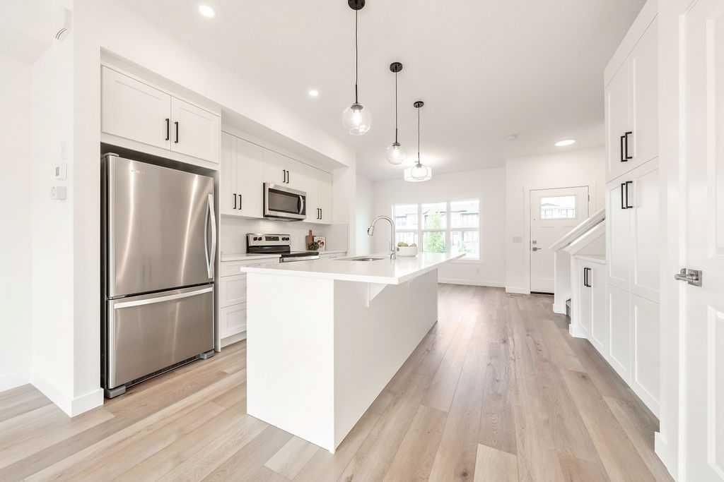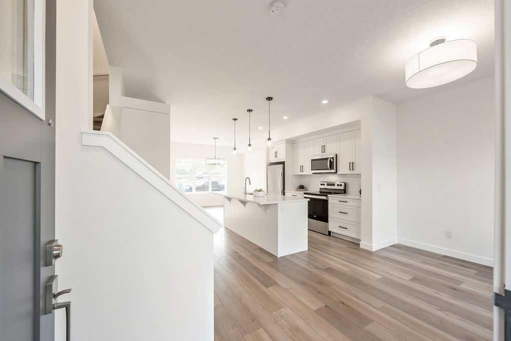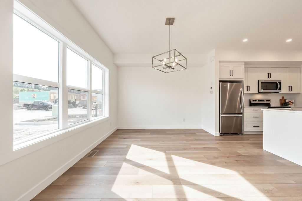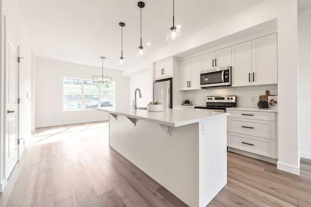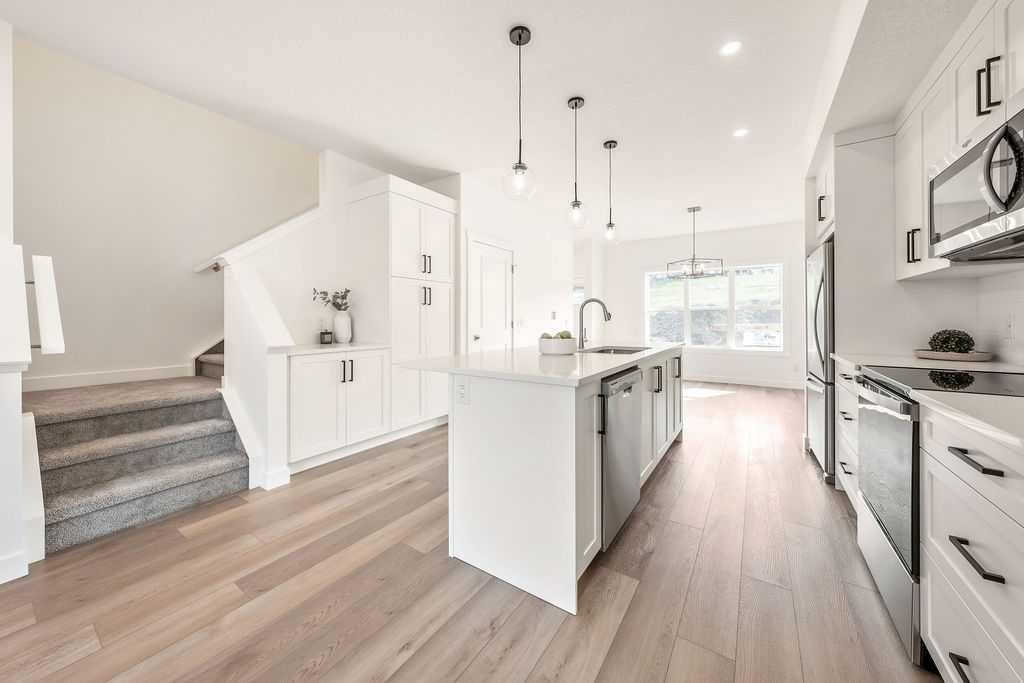Welcome to this STUNNING, like-new townhome nestled in the sought-after community of River Song! Surrounded by Cochrane’s scenic rolling hills and natural beauty, this thoughtfully designed and impeccably maintained, this home offers the perfect blend of style, comfort, and functionality. The main floor showcases a bright and modern aesthetic, featuring sleek white cabinetry, elegant quartz countertops, stainless steel appliances, and stylish lighting. A large central island anchors the space, while the added coffee bar with extra cabinetry and pantry storage creates a perfect spot to start your mornings. Warm, natural-toned vinyl plank flooring flows throughout, enhancing the open-concept layout that seamlessly connects the kitchen, dining, and living areas—ideal for both everyday living and entertaining. Upstairs, the spacious primary retreat offers a walk-in closet and a well-appointed 4-piece ensuite. Two additional bedrooms provide flexibility for family, guests, or a home office, complemented by a full main bathroom and the convenience of upper-level laundry. The unfinished lower level presents a fantastic opportunity to customize the space to suit your needs. Additional features include central air conditioning for year-round comfort and two parking stalls conveniently located just outside your back entrance. Enjoy the lifestyle this location offers with easy access to the Bow River, nearby pathways, parks, and endless outdoor recreation. River Song is ideally situated with quick access to Highway 22, making mountain getaways effortless, and is just a short drive to Calgary. With schools, amenities, and the Spray Lakes Recreation Centre nearby, everything you need is within reach. Complete with a New Home Warranty, this exceptional home is truly move-in ready. Welcome home!