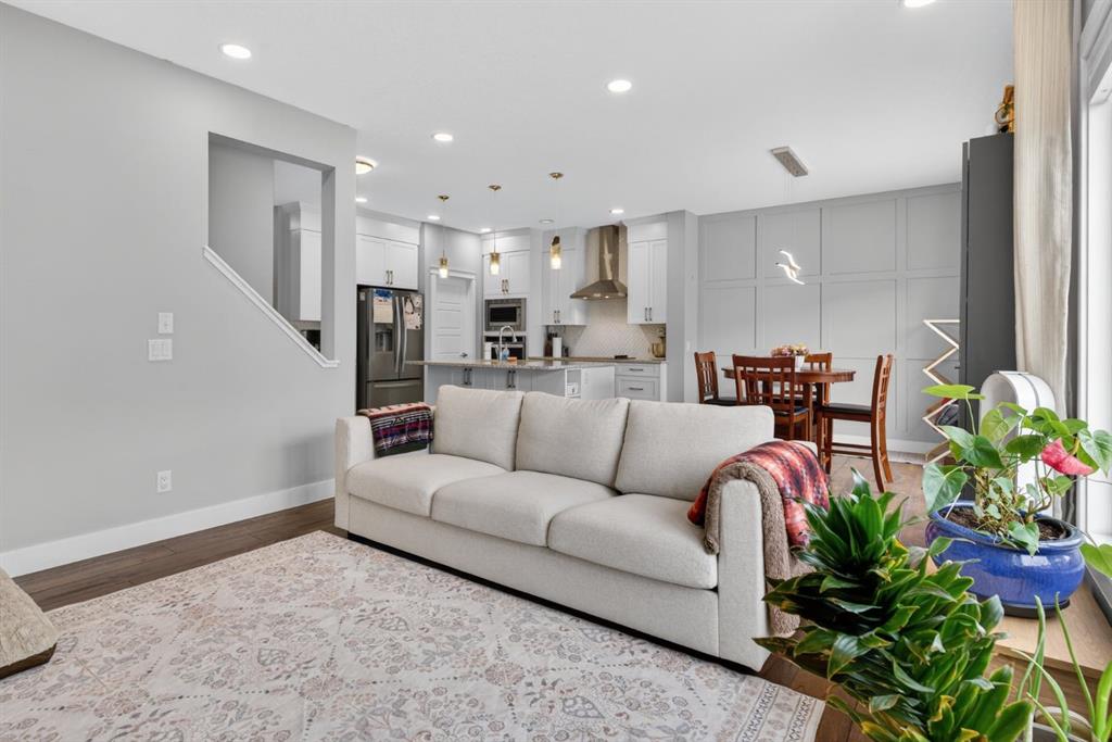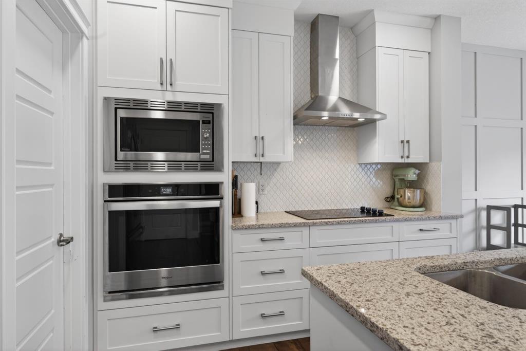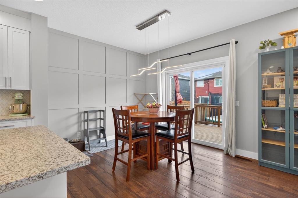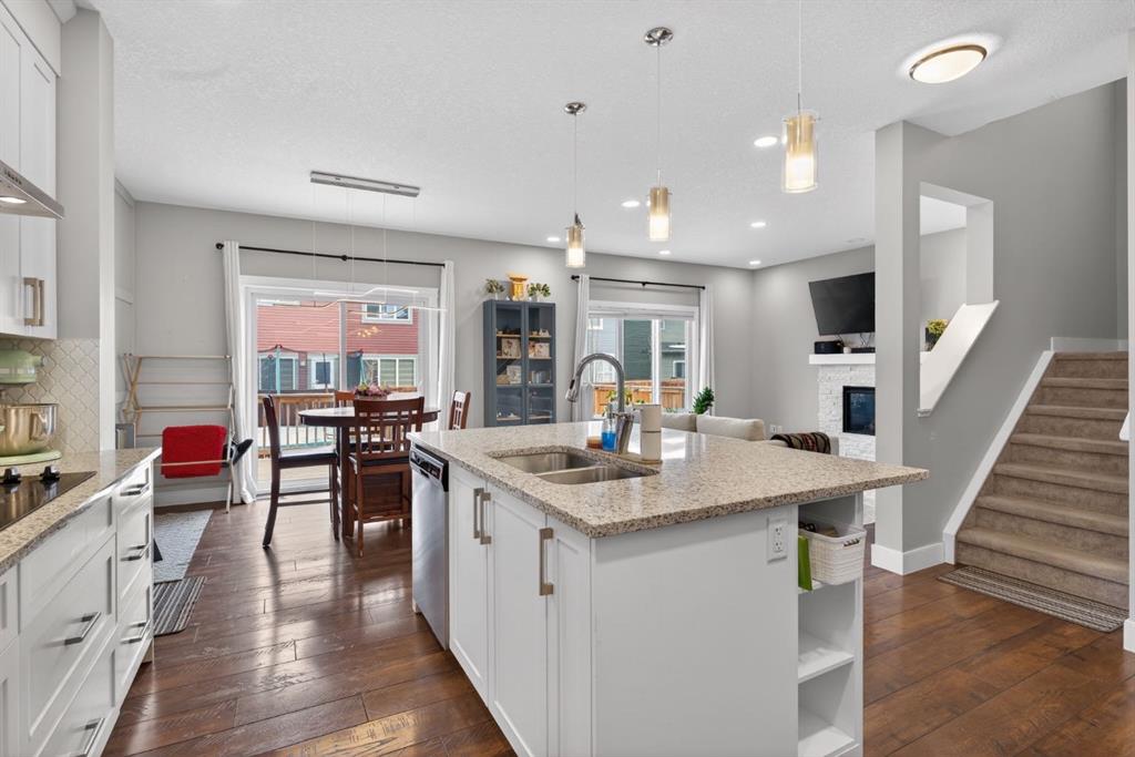 The home features white shaker-style kitchen cabinetry, quartz countertops, and a large central island. Premium built-in stainless steel appliances and a walk-in pantry complete this gourmet kitchen. The open-concept family room is ideal for entertaining family and friends, while the dining area opens onto a raised deck overlooking a beautifully finished yard with a striking fence.