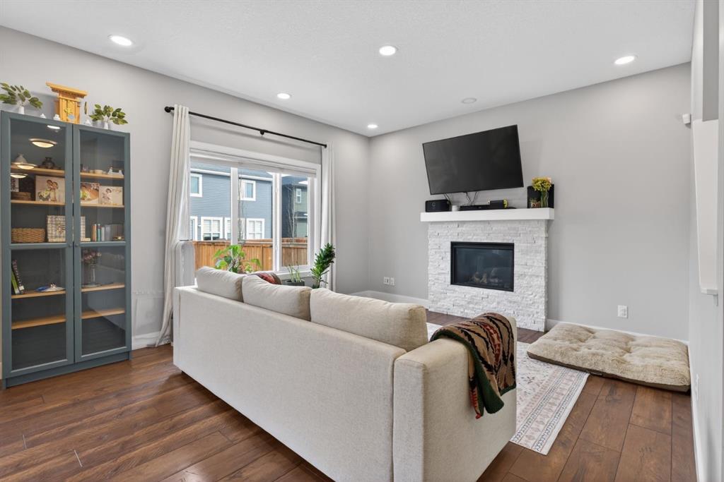 The bright living room offers an oversized window and a cozy, child-safe ledgestone fireplace with cool-to-the-touch glass. Durable hand-scraped laminate flooring runs throughout the main floor — perfect for busy households. A standout feature is the enclosed main-floor office with etched-glass French doors, providing a private workspace. A tiled mudroom off the garage adds practical storage, including a full closet for organized family living.
