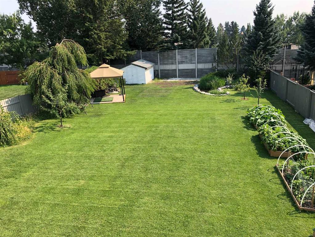 Outdoor living is truly exceptional on this oversized property. The south-facing backyard is your private orchard and garden paradise, featuring maturing apple trees, blueberry bushes, strawberries, rhubarb, and five raised garden beds. The massive fully fenced yard also includes a water pond feature, a large concrete patio, and an open gazebo with a swing.