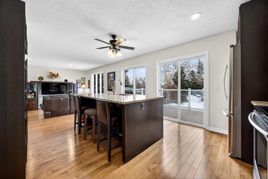 The open and bright main floor features 9-foot ceilings and rich maple hardwood flooring throughout. A true heart of the home, the renovated kitchen is outfitted with custom 42-inch soft-close cabinetry, granite countertops, and a massive 4×8 foot island. Two upgraded patio doors lead directly to the elevated south-facing deck, featuring a manual retractable awning and a natural gas BBQ hookup—ideal for summer entertaining while taking in the mountain views. The main level also includes a spacious living room with a gas-insert fireplace, a formal dining area, and a functional laundry/mudroom with custom storage.