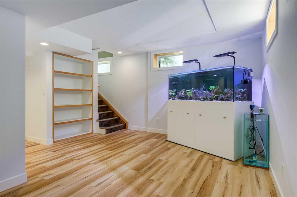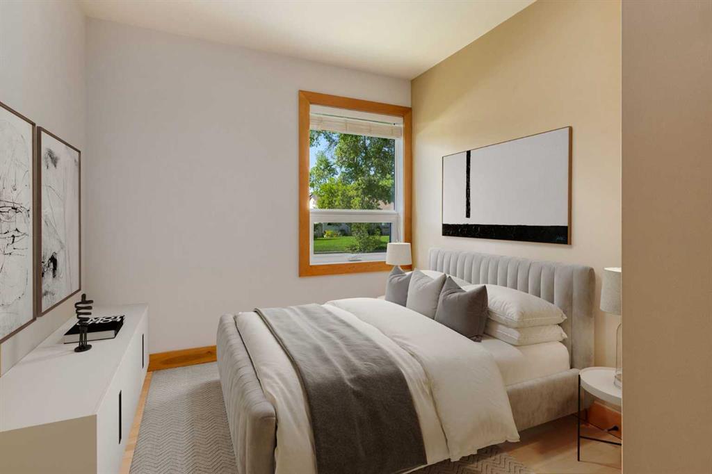 The large primary bedroom easily accommodates a king-size bed and offers flexibility, it can be converted back into two separate rooms, transforming the home into a four-bedroom layout. A full bathroom with custom maple cabinetry completes the main floor.