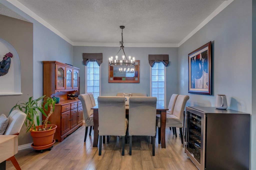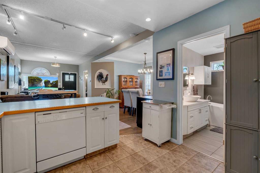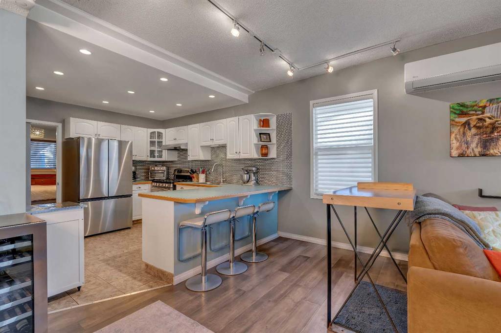 Lovingly updated over the years, the home features an inviting open-concept layout with the kitchen at the centre of the home. The kitchen offers tile flooring, a nearly new stainless steel fridge, gas range, updated backsplash, and convenient seating. A large dining room sits just off the kitchen, offering a functional and inviting space for gatherings, while the front living room is warm and welcoming.
