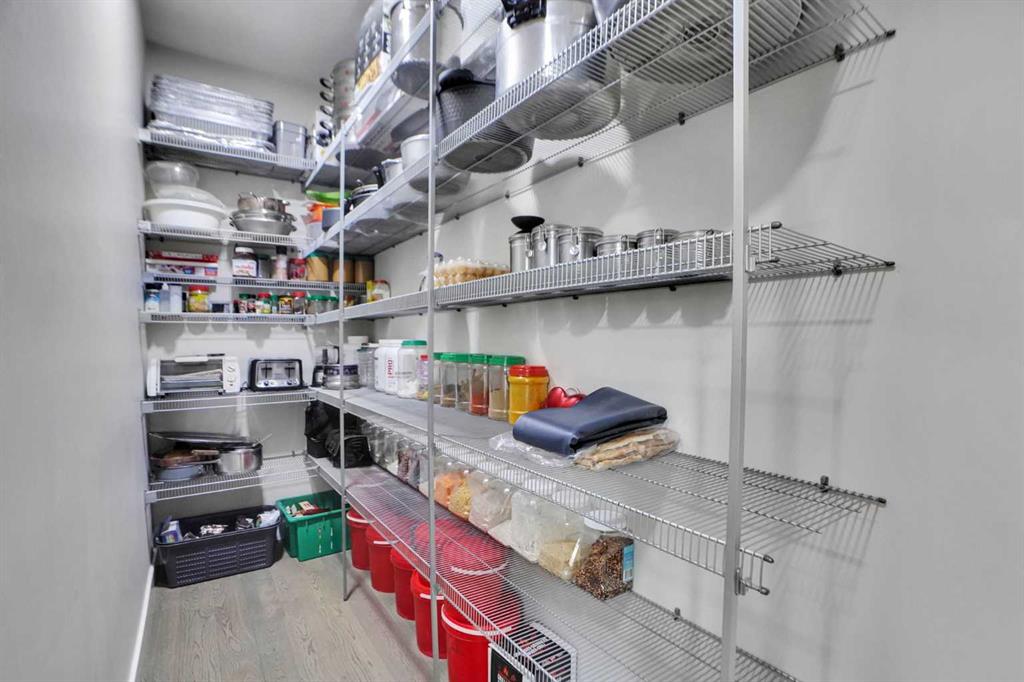 The kitchen is designed to impress, featuring quartz countertops, stainless steel appliances, and ample cabinetry. A separate spice kitchen adds extra flexibility for cooking, especially for larger families. The oversized walk-in pantry with extensive shelving provides exceptional storage space that is rarely found.