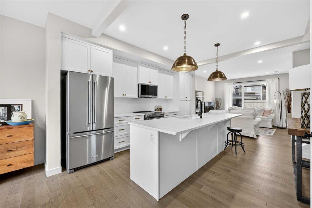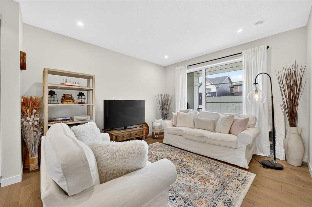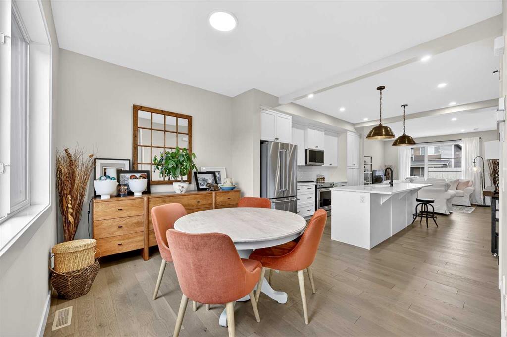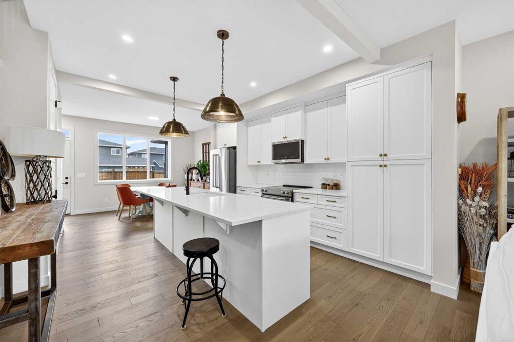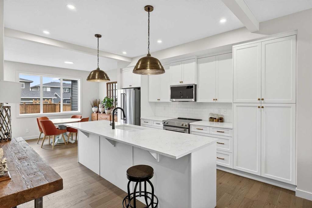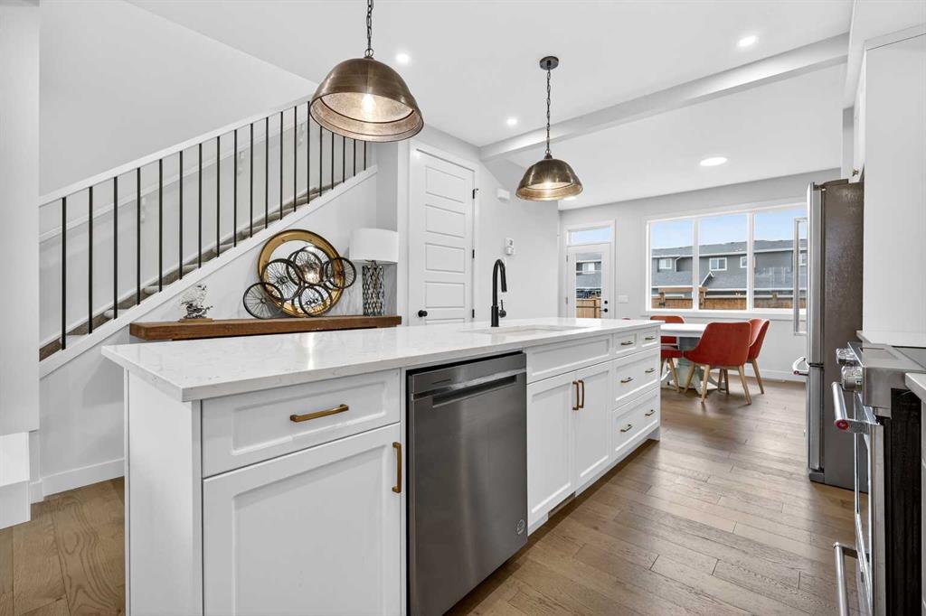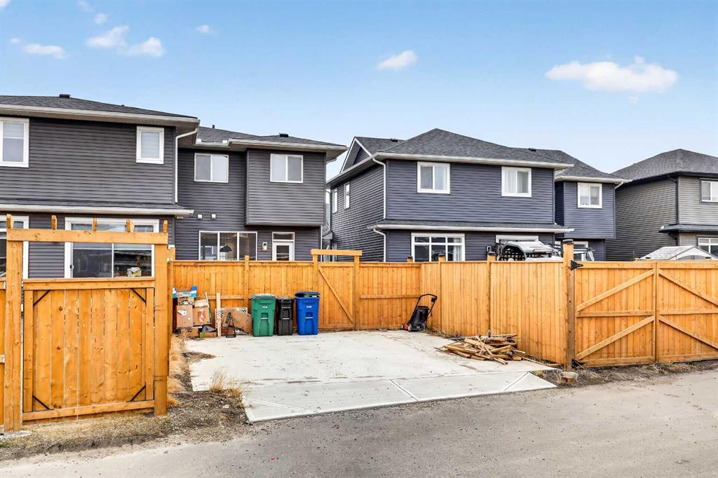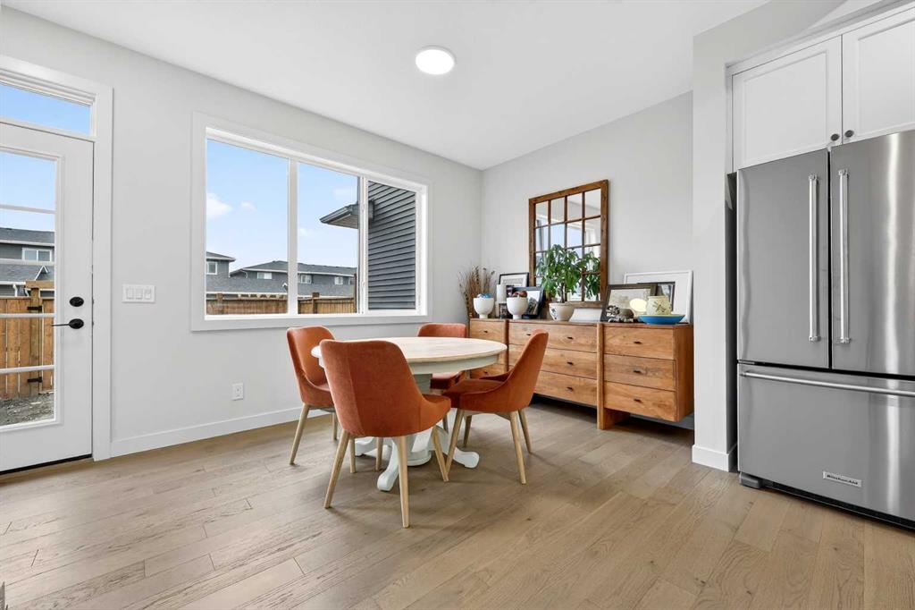 Modern design meets everyday function in this thoughtfully upgraded duplex located in one of Airdrie’s growing southwest communities. A covered front patio sets a welcoming tone while creating a comfortable space to enjoy morning coffee or unwind at the end of the day. Inside, an open-concept layout with 9′ ceilings and 8′ doors balances connection and separation, allowing daily routines and entertaining to flow with ease. Engineered hardwood flooring runs underfoot, bringing warmth and durability to the main level. Natural light pours through oversized windows, brightening the living area and drawing attention toward the heart of the home. Culinary creativity finds its place in a well-appointed kitchen where crisp white cabinetry, quartz countertops, timeless subway tile and an upgraded stainless steel appliance package come together around a central island designed for casual meals and conversation. Adjacently, the dining area keeps gatherings connected while maintaining a defined space for everyday use. A powder room completes the main level with practical convenience for guests. Upstairs, a calm and comfortable primary retreat delivers both style and function with dual sinks, an upgraded comfort-height vanity, chic tilework and an oversized shower that enhances daily routines. Two additional bedrooms provide flexibility for family, guests or a dedicated workspace. A full bathroom on this level carries through the same thoughtful finish selections, while upper-level laundry eliminates the need to carry loads between floors. Out back, a fully fenced yard creates privacy and room to enjoy outdoor living, whether relaxing, gardening or letting pet’s roam. Rear lane access leads to a concrete 2-car parking pad, offering convenient off-street parking without compromising yard space. Life here connects you to a quieter pace without giving up access to everyday essentials. Parks, pathways, nearby pickleball, tennis, and basketball courts add options for recreation and community connection.