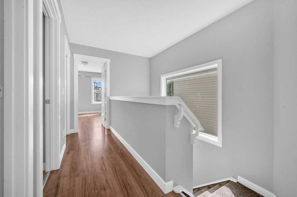 The main floor features a bright and functional layout with a spacious living room, dining area, and a kitchen complete with modern cabinetry and a convenient bonus serving station. A side window along the staircase adds beautiful natural light, creating a warm and inviting feel throughout the home.