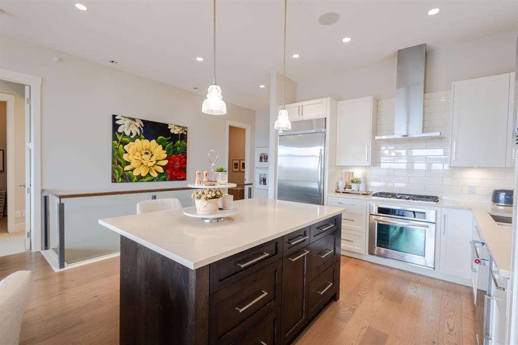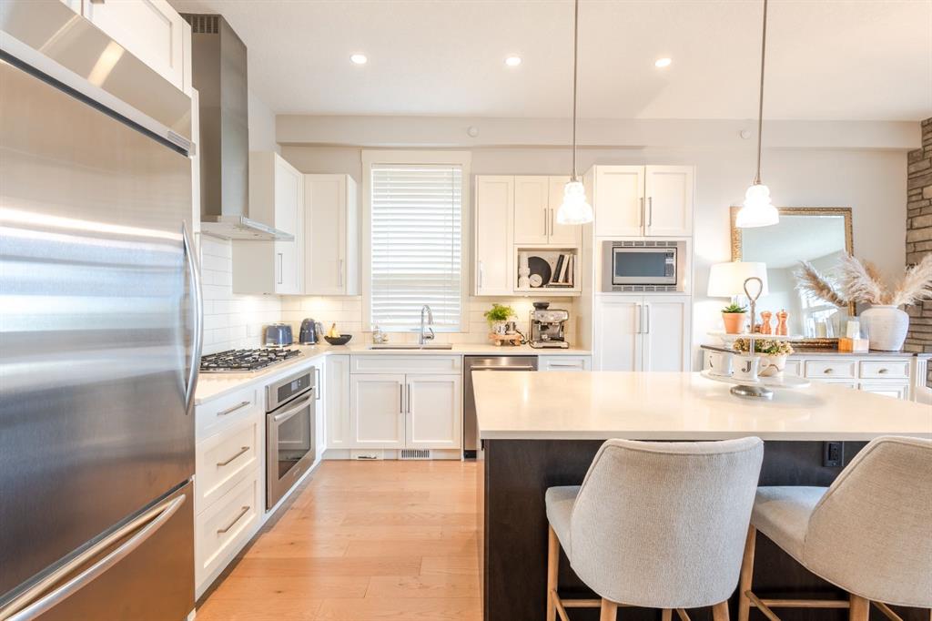Step into upscale villa-style living with this exceptional 3-bedroom, 2.5-bath home showcasing sweeping panoramic mountain views. Inside, soaring 10-foot ceilings span both the main and lower levels. Expansive windows flood the space with natural light, creating an airy, open feel throughout. The chef-inspired kitchen features stainless steel appliances, a gas cooktop, a subway tile backsplash, quartz countertops, and a large island with breakfast bar seating—plus plenty of cabinetry for storage. The open-concept layout flows seamlessly into the dining area and living room, making it ideal for entertaining while enjoying the stunning scenery from every angle. The living room is anchored by a striking gas fireplace with a full-height stone surround and wood mantle, and it offers direct access to a spacious rear deck overlooking breathtaking views. The primary suite serves as a peaceful retreat, complete with a generous walk-in closet with custom built-ins and a luxurious 5-piece ensuite featuring a dual vanity, standalone shower, soaking tub, and private water closet. The main level also includes a well-equipped laundry room with a sink and storage, a 2-piece powder room, and entry to the heated double attached garage, which features epoxy flooring, high ceilings, and extensive shelving. Downstairs, in-floor heating adds comfort throughout the lower level, which includes two spacious bedrooms and a 4-piece bathroom with a double vanity and a large shower. A secondary family and entertainment area features a stylish wet bar with seating, a dishwasher, a sink, ample cabinetry, and dual beverage fridges. This area also has walkout access to the lower patio. Additional highlights include a Kinetico water system with a softener and reverse osmosis, a Sonos sound system, a phantom screen door, blackout blinds in the primary suite, a newer tankless hot water system with a backup tank, and central vacuum. Ideally located near shopping, amenities, and Lynx Ridge Golf Course, this home is also just steps from the community clubhouse and an extensive network of scenic walking paths. This beautifully designed walkout bungalow offers the perfect blend of comfort, style, and natural beauty—ready to welcome you home.