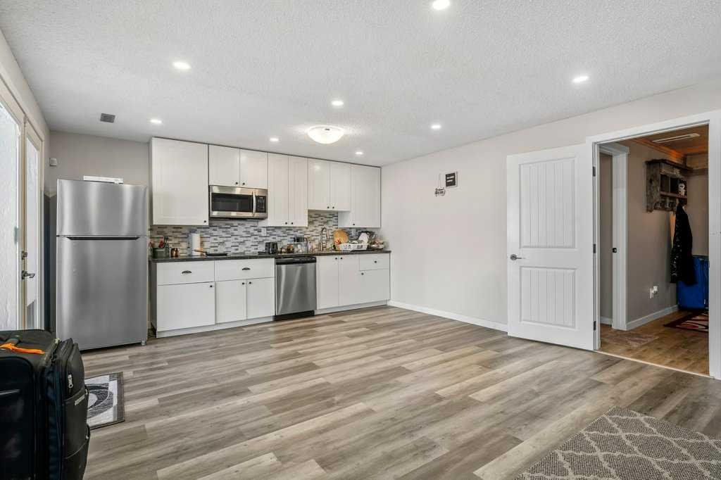 The walkout lower level is fully finished and filled with natural light from a wall of windows, offering a second living space, kitchen area with a full appliance package, fourth bedroom, and a 3-piece bathroom—ideal for extended family or supplemental living. Outside, the yard is fully fenced and landscaped, complete with a lower concrete patio, synthetic grass putting green, and a wrap-around walkway from front to back.