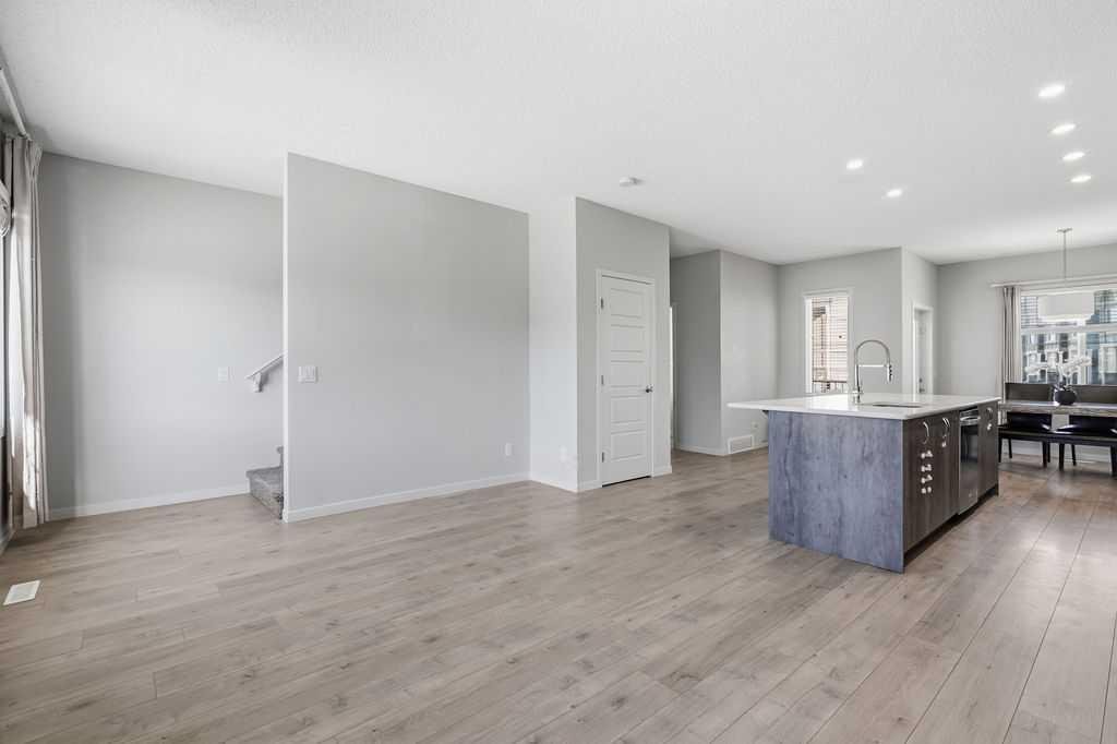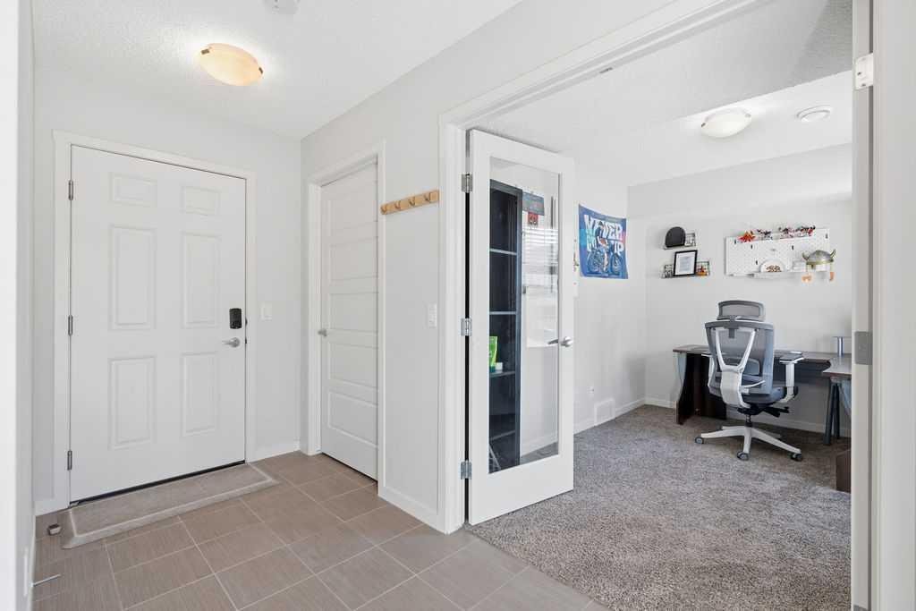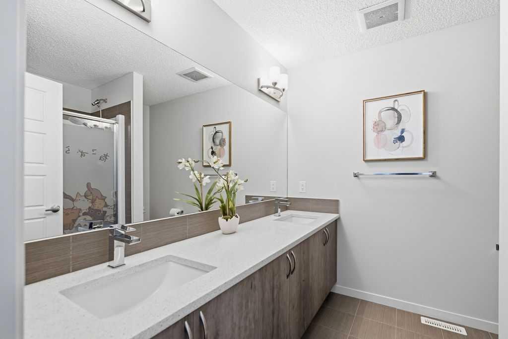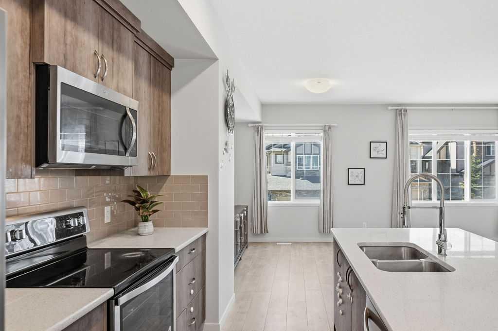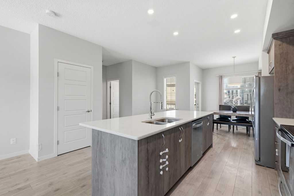 Open house On April 26th From 2pm-4pm. Welcome to this bright and spacious 3 level townhouse offering over 1,700 sq ft of stylish living space with a double attached garage, ideally located in the highly sought-after community of Nolan Hill. Designed for comfort and style, this beautifully finished home offers 3 bedrooms, 2.5 bathrooms, and a versatile ground-level den/flex space—perfect for small families, downsizers, or young professionals. The bright, open-concept main level is filled with natural light from large front and rear windows, enhanced by 9-ft ceilings, recessed lighting, and contemporary hardwood flooring throughout. Patio doors lead to an oversized private balcony, ideal for summer barbecues and relaxing evenings. The chef-inspired kitchen overlooks the dining and living areas, making it perfect for entertaining or keeping an eye on kids. It features full-height warm-tone cabinetry with exposed shelving, rich quartz countertops, a large central island with storage, a built-in pantry, and stainless steel appliances, including a fridge with a water line. Upstairs, the spacious primary bedroom includes a walk-in closet and a 4-piece ensuite with dual vanities and a walk-in shower. Two additional well-sized bedrooms, a full bathroom with tile flooring and quartz counters, and convenient upper-level laundry complete this floor. On the entry level, the den offers flexible space for a home office, gym, guest room, or play area. The double attached garage provides secure year-round parking and extra storage for an active lifestyle. Steps from walking paths and a children’s park, and just across the boulevard from a convenient shopping plaza with groceries, banks, restaurants, and more, this home offers the perfect balance of comfort and convenience. Move in and enjoy maintenance-free living in this family-friendly Nolan Hill community!