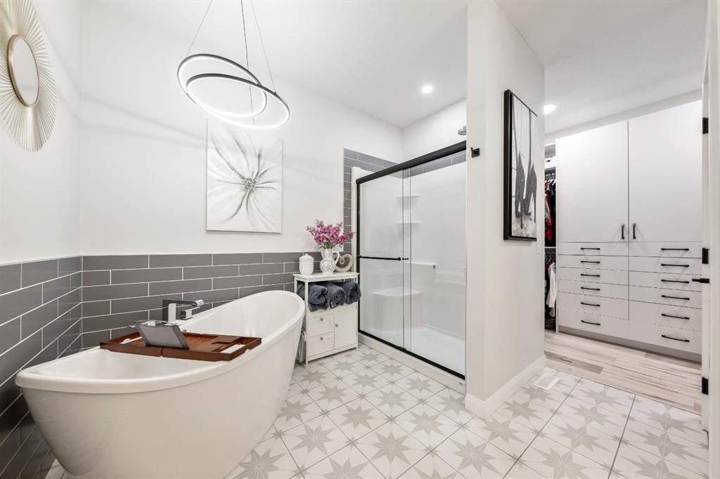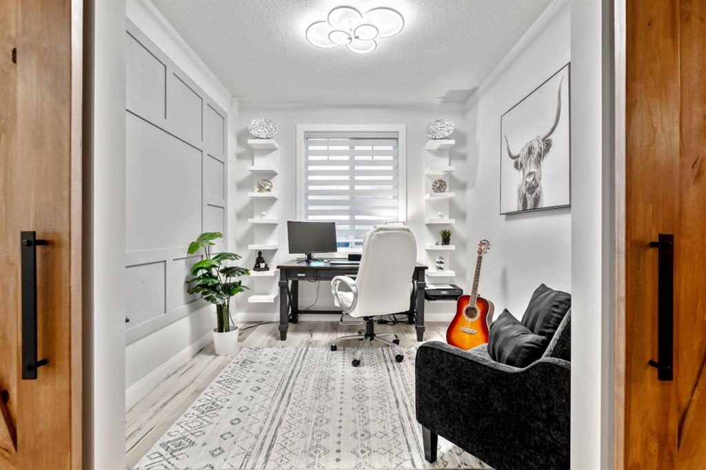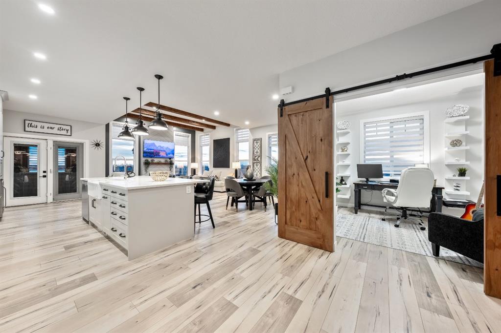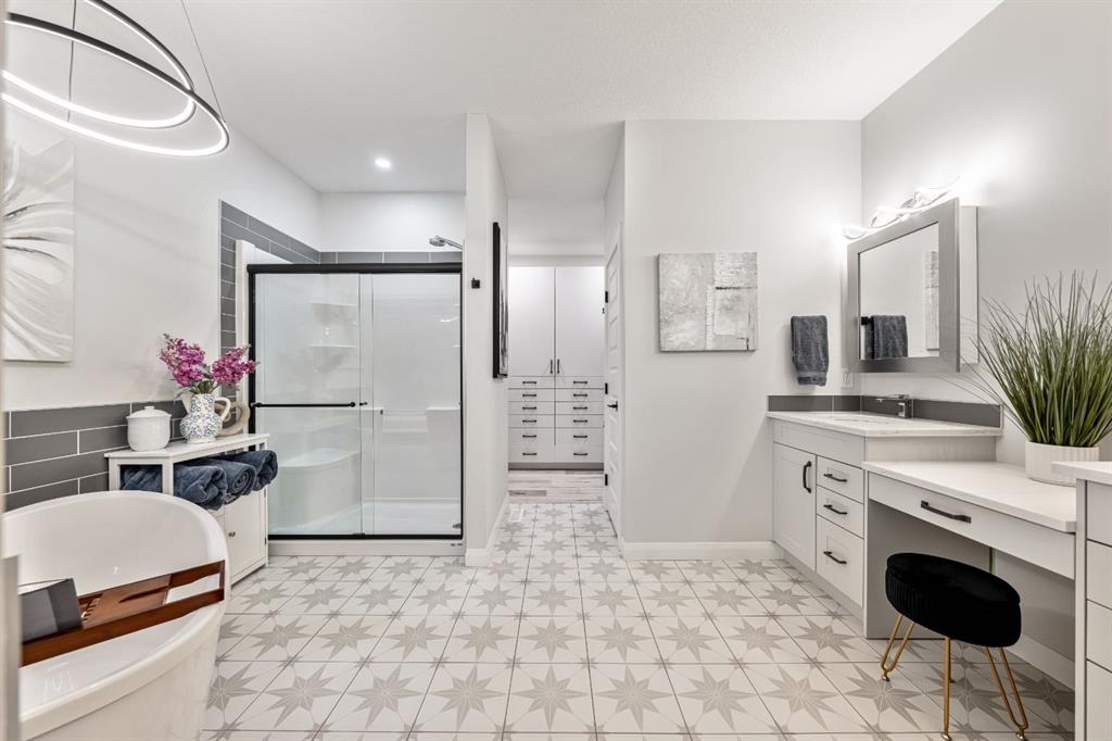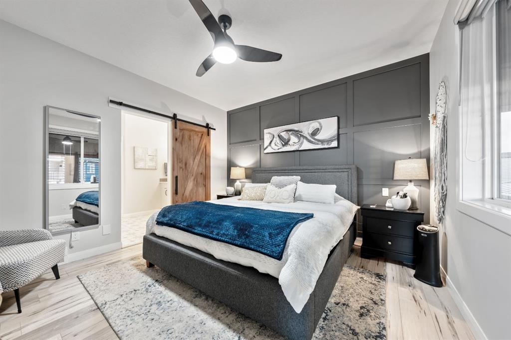 Sliding BARN DOORS reveal a beautifully appointed OFFICE/DEN complete with a feature wall—perfect for working from home or creating a stylish flex space. The spacious PRIMARY SUITE offers a peaceful retreat with 9-FOOT CEILINGS, an accent wall, and a CUSTOM WALK-IN CLOSET with extensive built-ins. The SPA-INSPIRED ENSUITE elevates everyday living with DUAL SINKS, a MAKE-UP STATION, FREESTANDING SOAKER TUB, and HIS AND HERS VANITIES.