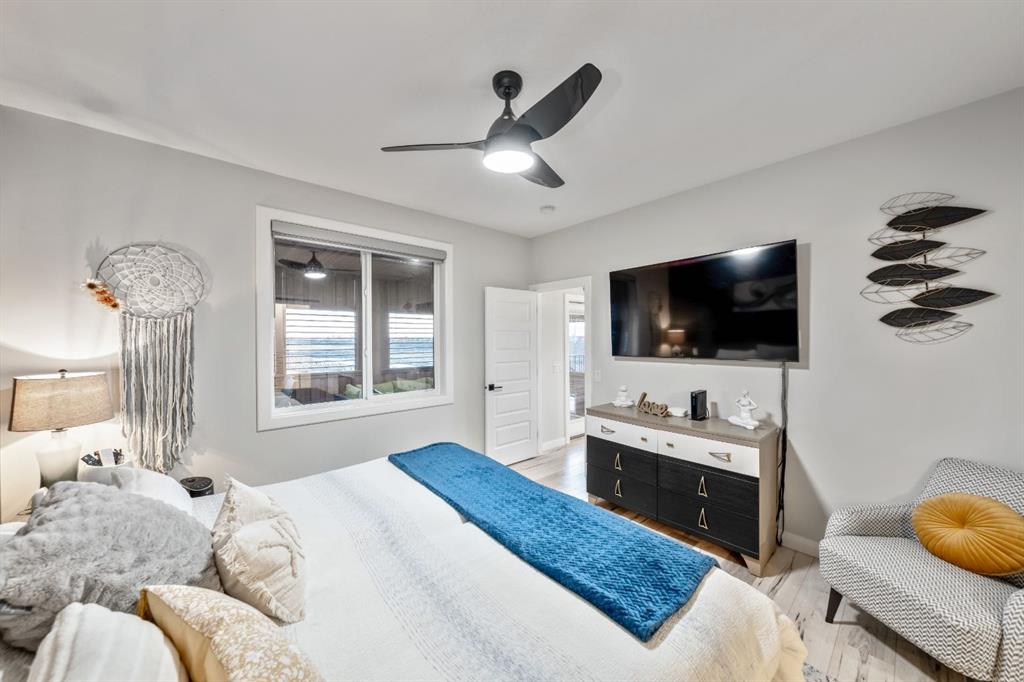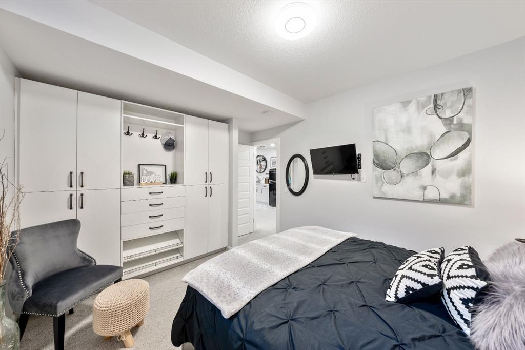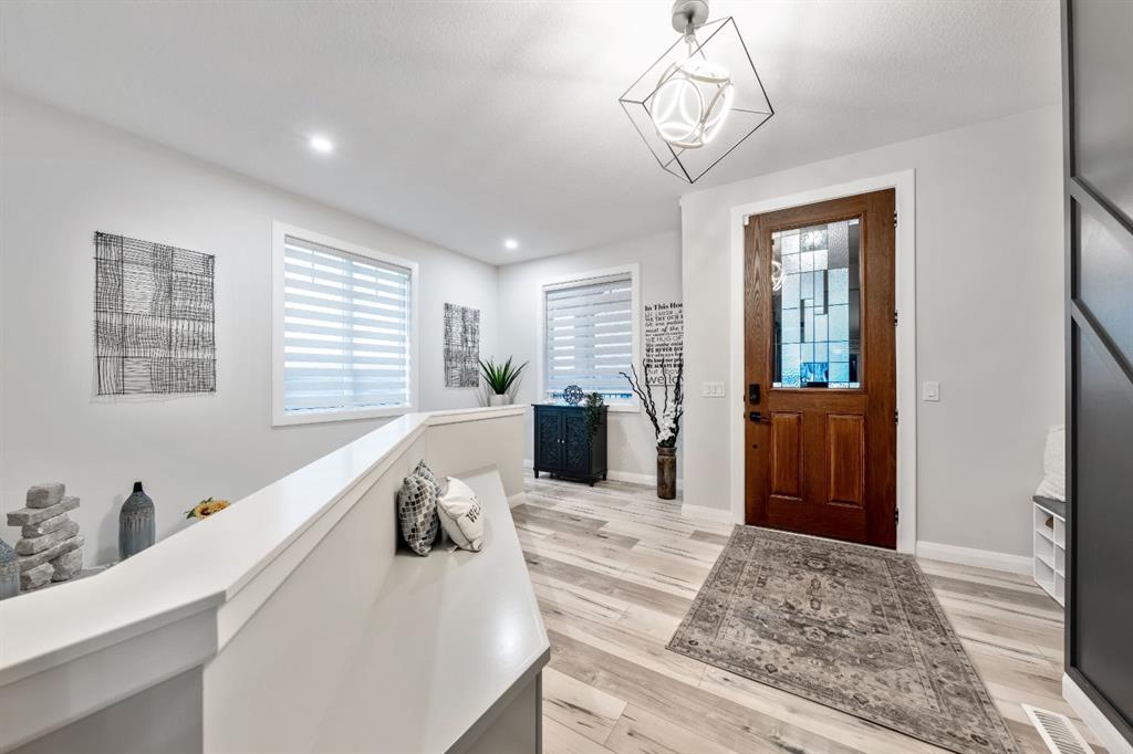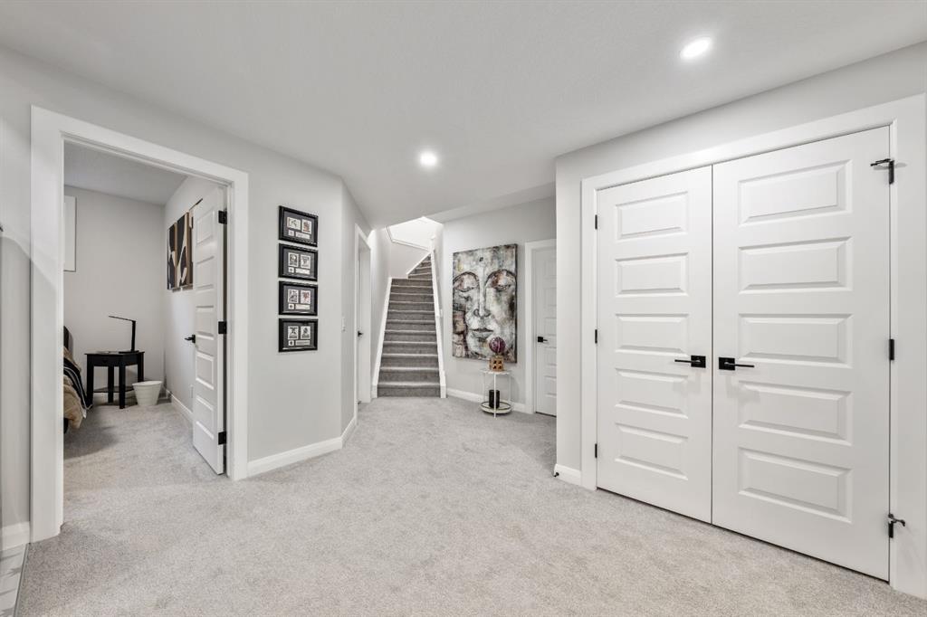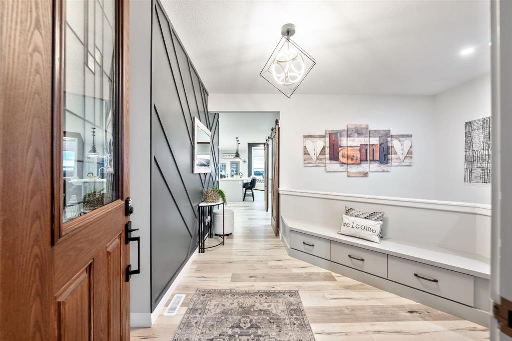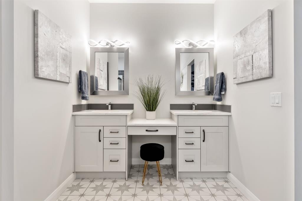 Sliding BARN DOORS reveal a beautifully appointed OFFICE/DEN complete with a feature wall—perfect for working from home or creating a stylish flex space. The spacious PRIMARY SUITE offers a peaceful retreat with 9-FOOT CEILINGS, an accent wall, and a CUSTOM WALK-IN CLOSET with extensive built-ins. The SPA-INSPIRED ENSUITE elevates everyday living with DUAL SINKS, a MAKE-UP STATION, FREESTANDING SOAKER TUB, and HIS AND HERS VANITIES.