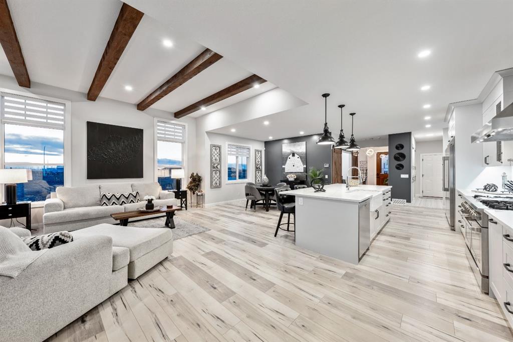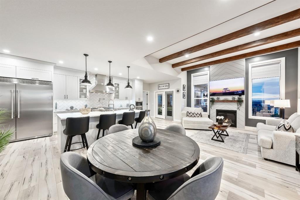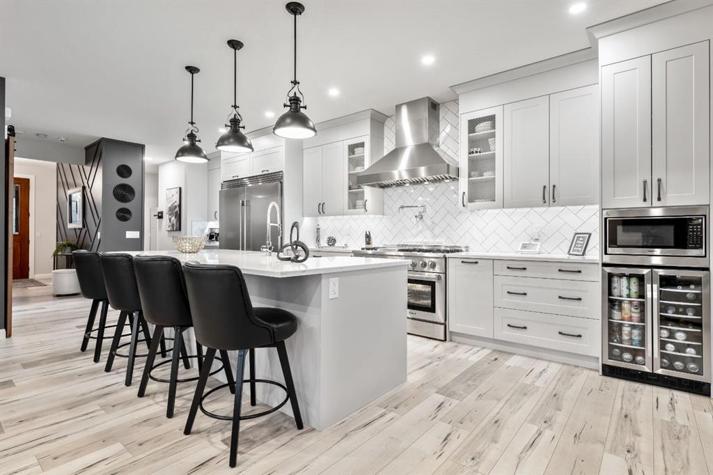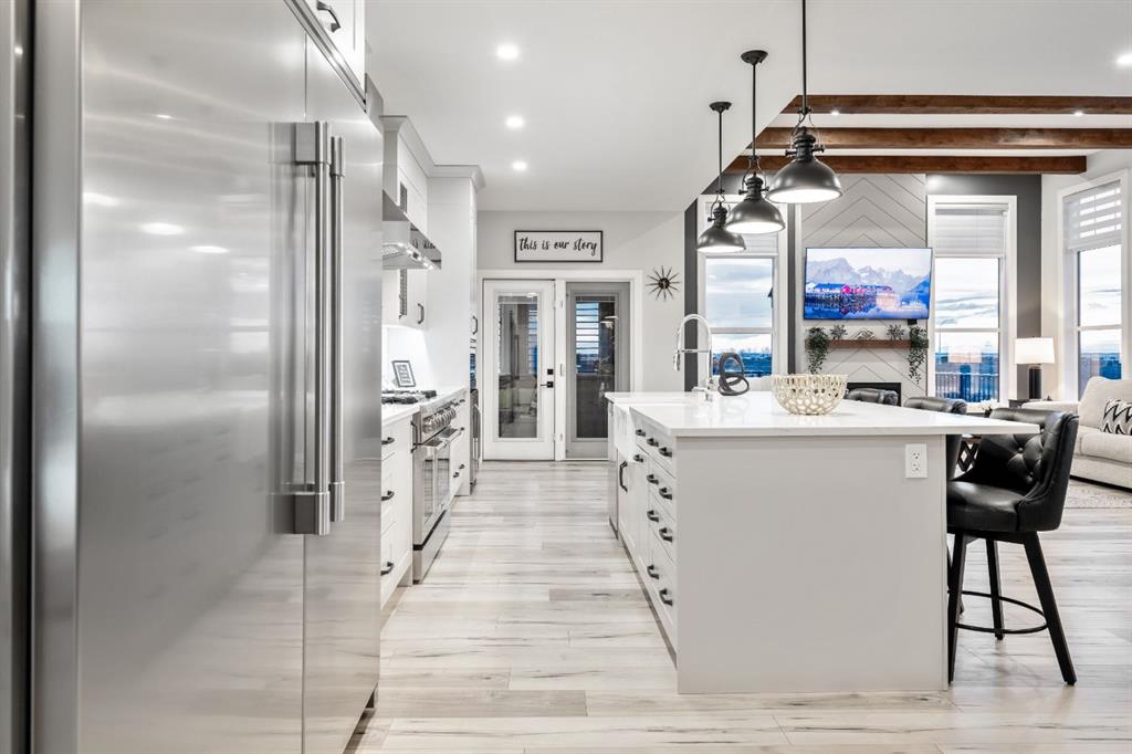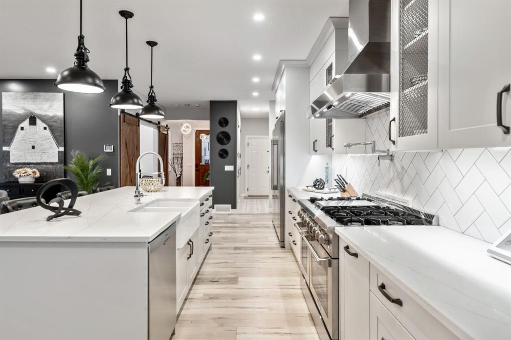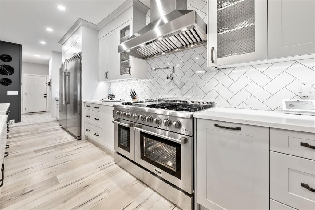 The kitchen is truly the CENTREPIECE of the home, designed to impress and built for everyday living. A substantial QUARTZ ISLAND with FARMHOUSE SINK, DESIGNER PENDANT LIGHTING, CUSTOM HOOD FAN, and a full STAINLESS STEEL APPLIANCE PACKAGE—including a SIDE-BY-SIDE FULL FRIDGE AND FREEZER and a THOR GAS STOVE with POT FILLER TAP—make this a dream space for cooking and entertaining. Crisp CABINETRY and carefully selected backsplash finishes provide a clean, sophisticated aesthetic. Double patio doors open seamlessly to the REAR COVERED DECK, offering effortless INDOOR-OUTDOOR LIVING.