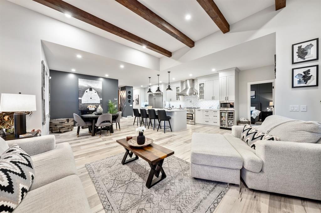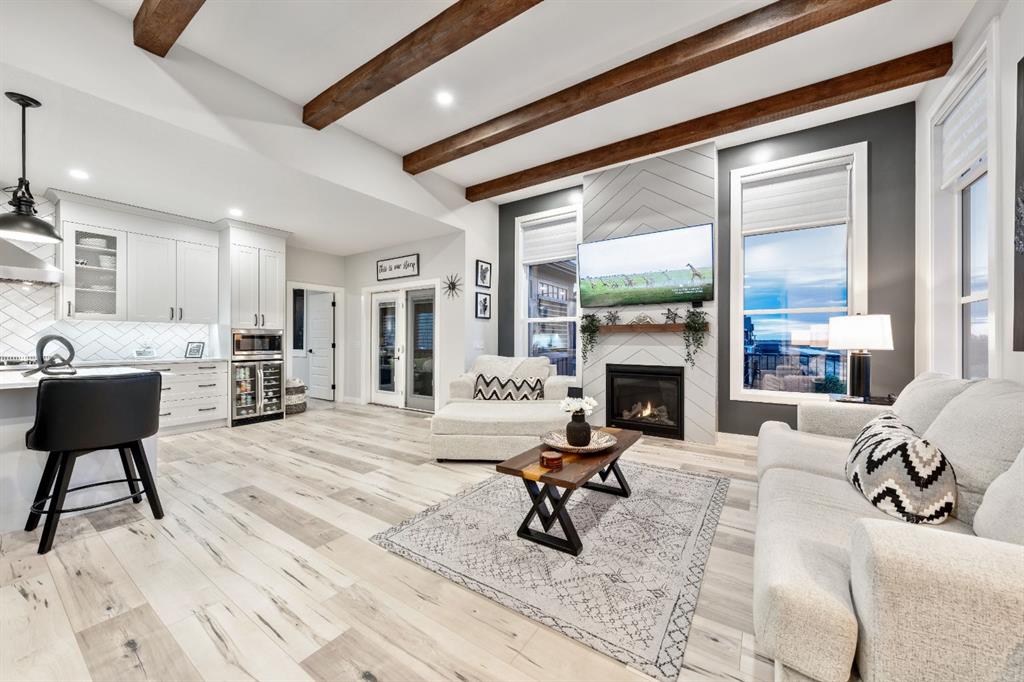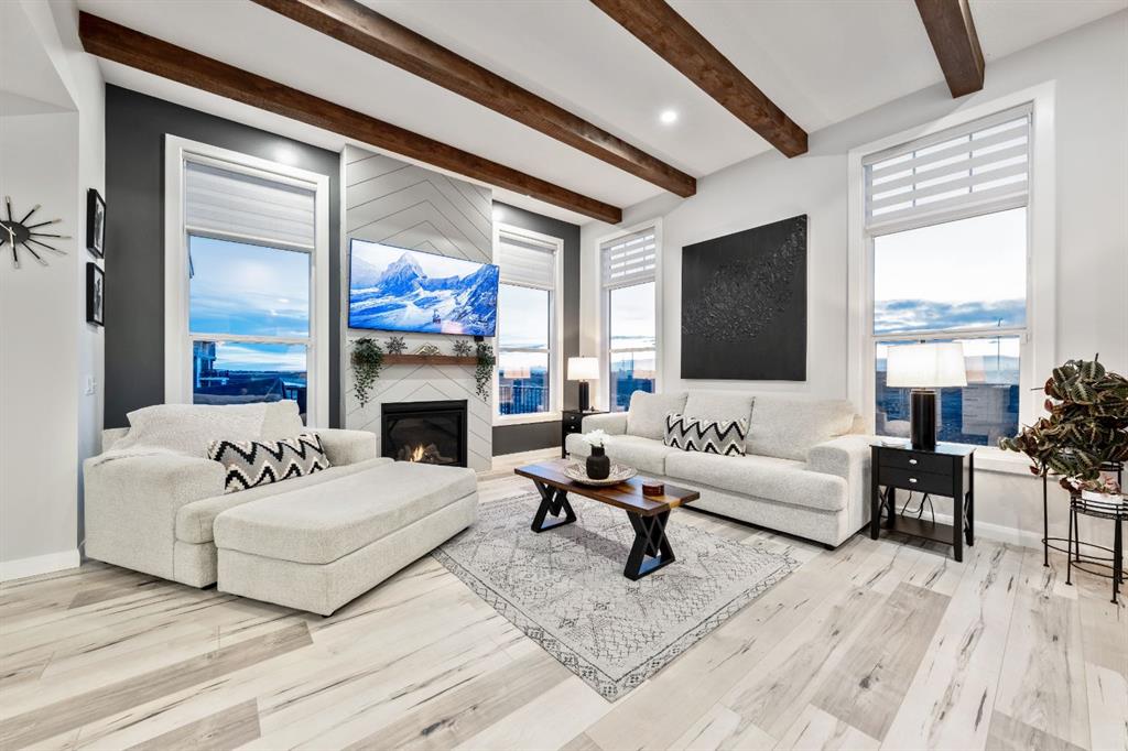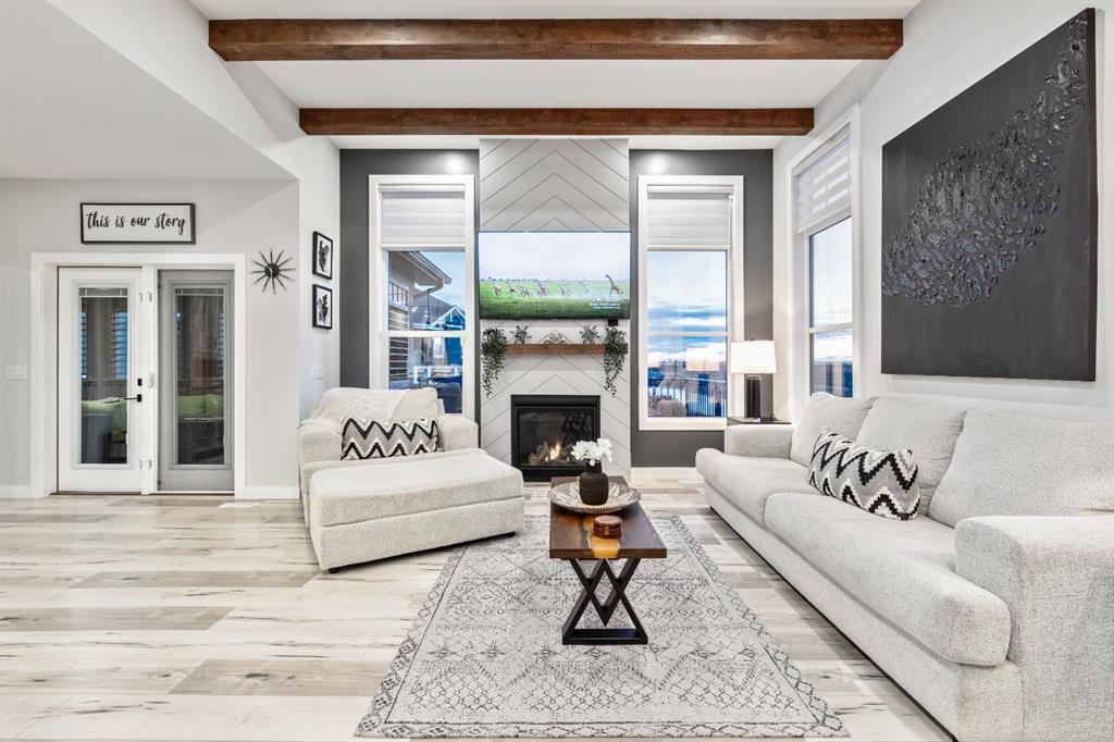 Inside, this CUSTOM-DESIGNED home showcases an EXPANSIVE, FUNCTIONAL LAYOUT enhanced by VAULTED CEILINGS, DESIGNER LIGHTING, and beautiful LAMINATE FLOORING across the bright, open-concept main level. Large WEST-FACING WINDOWS flood the living space with natural light, drawing your eye to the inviting GAS FIREPLACE that anchors the room and creates a warm, welcoming atmosphere.