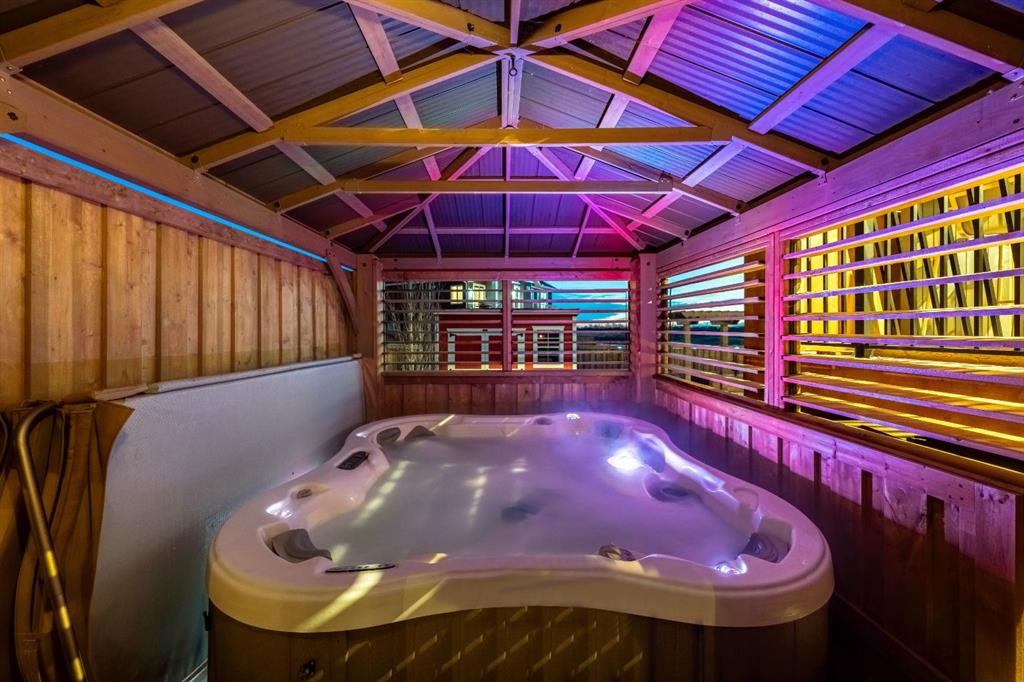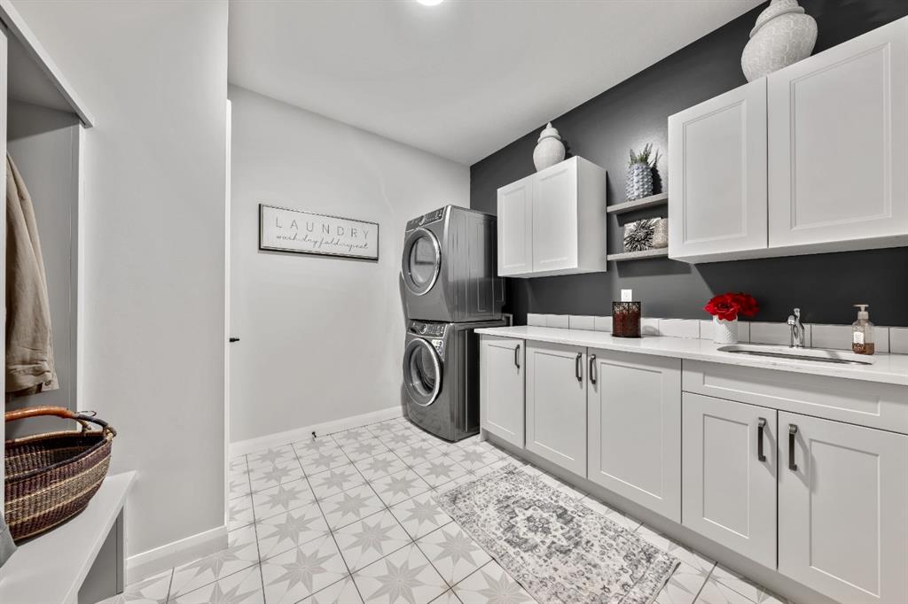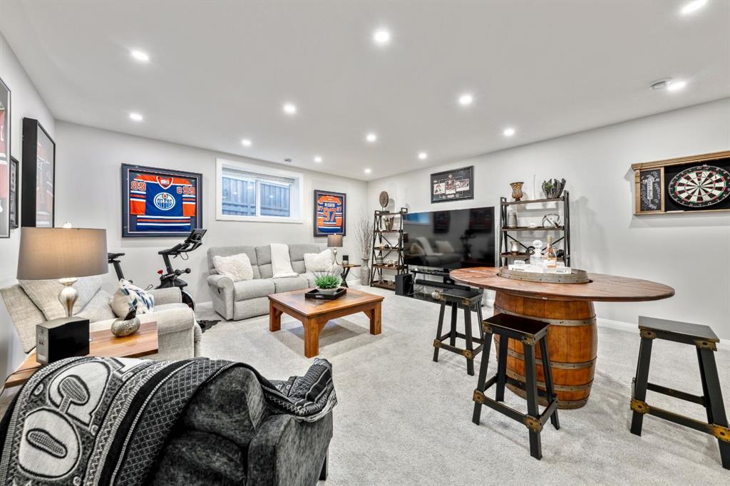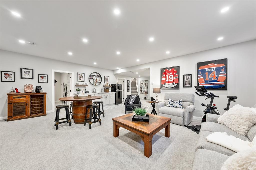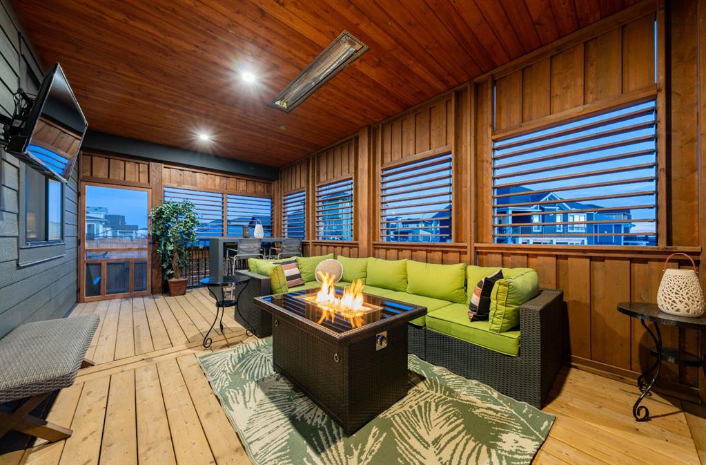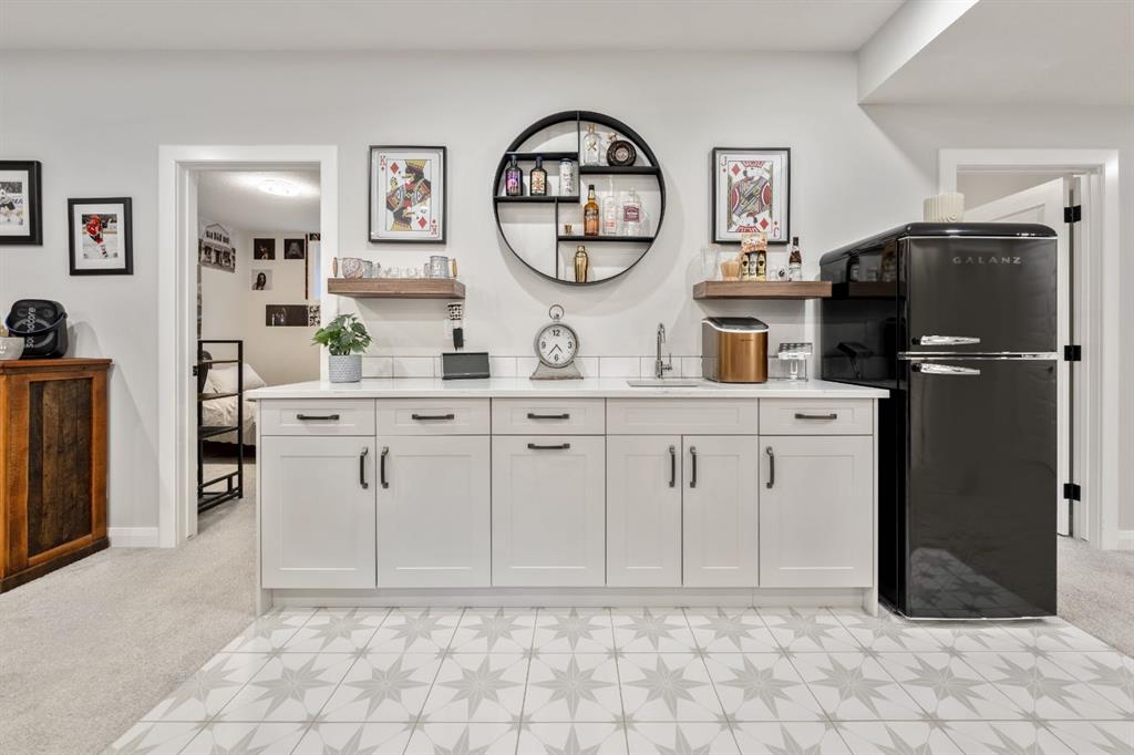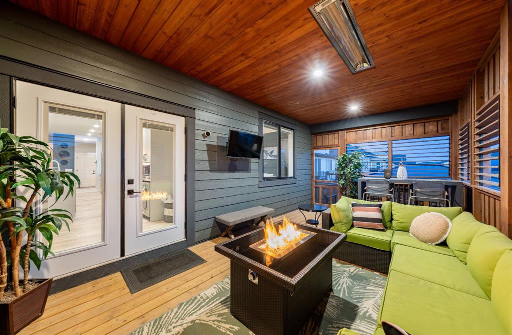 The main level is completed by a generous LAUNDRY ROOM featuring DESIGNER TILE, cabinetry, and a sink for added convenience. Downstairs, the FULLY DEVELOPED BASEMENT offers a comfortable lounge atmosphere with IN-FLOOR HEATING, plush carpeting, a spacious recreation area with WET BAR, THREE ADDITIONAL BEDROOMS with CUSTOM BUILT-IN CLOSETS, a SECOND FULL BATHROOM, and a ROUGHED-IN FUTURE LAUNDRY SPACE. An extension to the home is the closed in exterior deck, this is a true retreat area with the option to open or close the shutters, enjoy family and friends around a cozy fireplace while watching your favorite game on the exterior TV! Finish off the evening with a quick soak in the HOT TUB!
