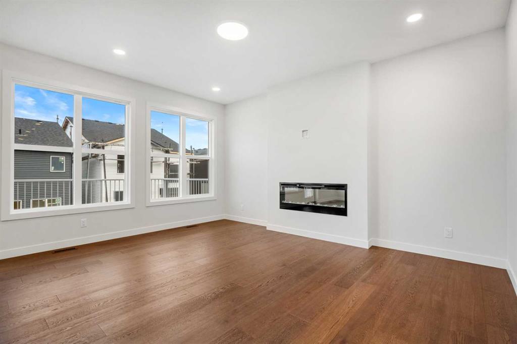 Step inside and be greeted by soaring 9’ ceilings on the main floor, rich LVT flooring, and an open-concept layout designed for both everyday living and entertaining. The main floor flex room provides a versatile space that can be used as a home office, playroom, or study. At the heart of the home is a chef-inspired kitchen featuring 1¼” quartz countertops, 42” upper cabinets with crown moulding, a walk-in pantry, gas line to the kitchen range, and upgraded lighting that highlights the elegant finishes. The adjacent living area is anchored by a 50” electric fireplace, creating a warm and inviting space.
