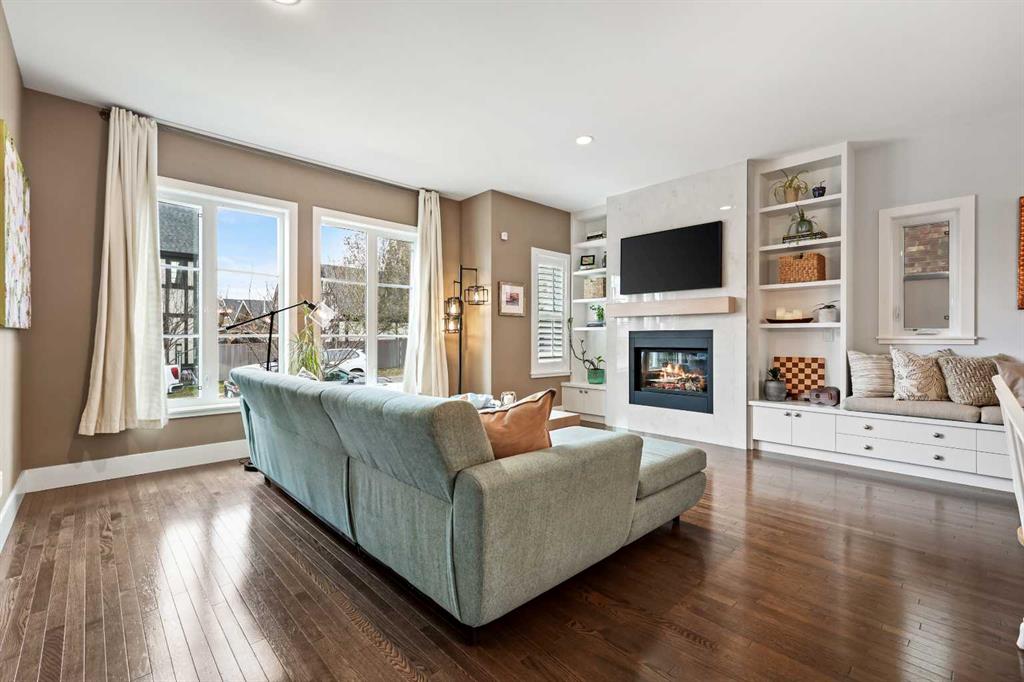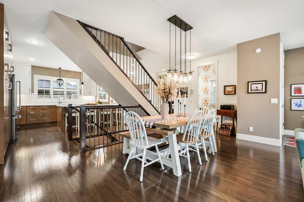 Welcome to this exceptional Custom-Built home, perfectly situated in one of Calgary’s most sought-after inner-city communities. Boasting over 2,600 sq. ft. of meticulously designed living space, this home blends refined craftsmanship with modern elegance — all just minutes from downtown. Step through the welcoming front entrance into an open-concept main level featuring 9-ft ceilings, rich hardwood floors throughout, and a designer staircase that seamlessly connects the home’s beautiful living spaces. The living room exudes warmth and style, anchored by a floor-to-ceiling tiled gas fireplace — a perfect focal point for cozy evenings. Custom built-in cabinetry adds both charm and functionality, creating a space designed for comfort and connection. The dining area offers an elegant setting for gatherings, while the chef-inspired kitchen is truly a showpiece -complete with a massive quartz island, premium stainless steel appliances, extended cabinetry, and abundant storage. Whether you love to entertain