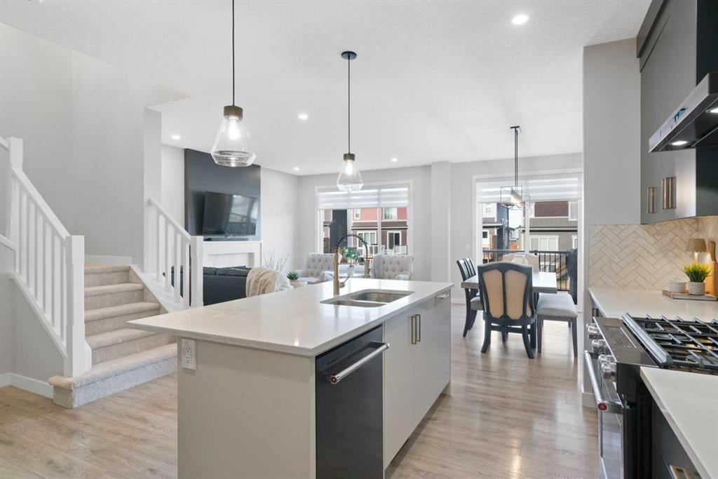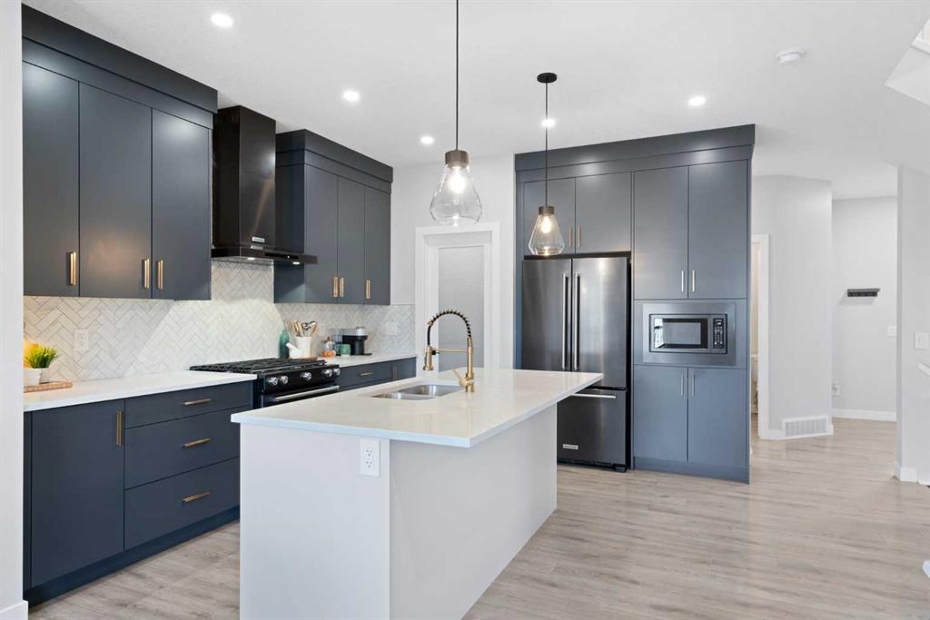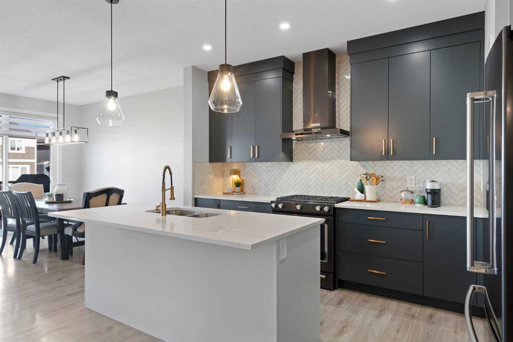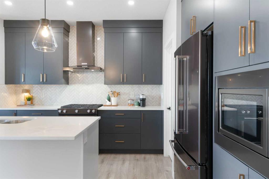 Welcome to this beautifully finished and thoughtfully upgraded Calbridge-built home backing onto a pathway and offering a blend of style, comfort, and functional living across all three levels. From the triple-pane windows to the fully developed sunshine basement, every detail has been selected to enhance everyday life. The main floor features a spacious front entry, 9 ft ceilings, fresh paint, a convenient 2pc bath, and an open-concept layout that is ideal for both family living and entertaining. The kitchen stands out with full-height dark grey/blue cabinetry, quartz countertops, herringbone tile backsplash, a large island, and KitchenAid dark stainless steel appliances including a gas range, and built-in microwave. The walk-in pantry provides exceptional storage with tons of shelving. The bright living room offers a gas fireplace with conduit to keep media wiring hidden and large windows that capture serene views of the backyard and pathway. The dining area comfortably fits a full-size table and leads to the back deck with BBQ gas line, stairs down to an exposed concrete patio, fresh mulch landscaping, storage under the deck, and a built-in cast iron firepit, perfect for relaxing or hosting. Upstairs, brand new carpet leads to a central bonus room with tray ceiling and pot lights. The primary suite feels like a retreat with vaulted ceilings, gimbal pot lights, a feature wall, a large walk-in closet, and a 5pc ensuite including comfort-height double vanity with quartz counters, a soaker tub, and a tiled shower with niche. Two secondary bedrooms (one with a walk-in closet), a full 4pc bathroom with quartz countertops, and an upper laundry room with folding shelf complete this level. The fully finished sunshine basement is warm and inviting thanks to double-insulated walls and a dual-zone furnace, and includes a spacious recreation room, large bedroom with walk-in closet, 4pc bath with quartz counters, storage space, sump pump, and rough-in for radon. The double attached garage is plumbed and ready for utility use, making it ideal for future workshop needs. This is a move-in ready home where thoughtful upgrades, practical design, and location come together, set in a quiet, family-friendly area with direct pathway access right out your back door.