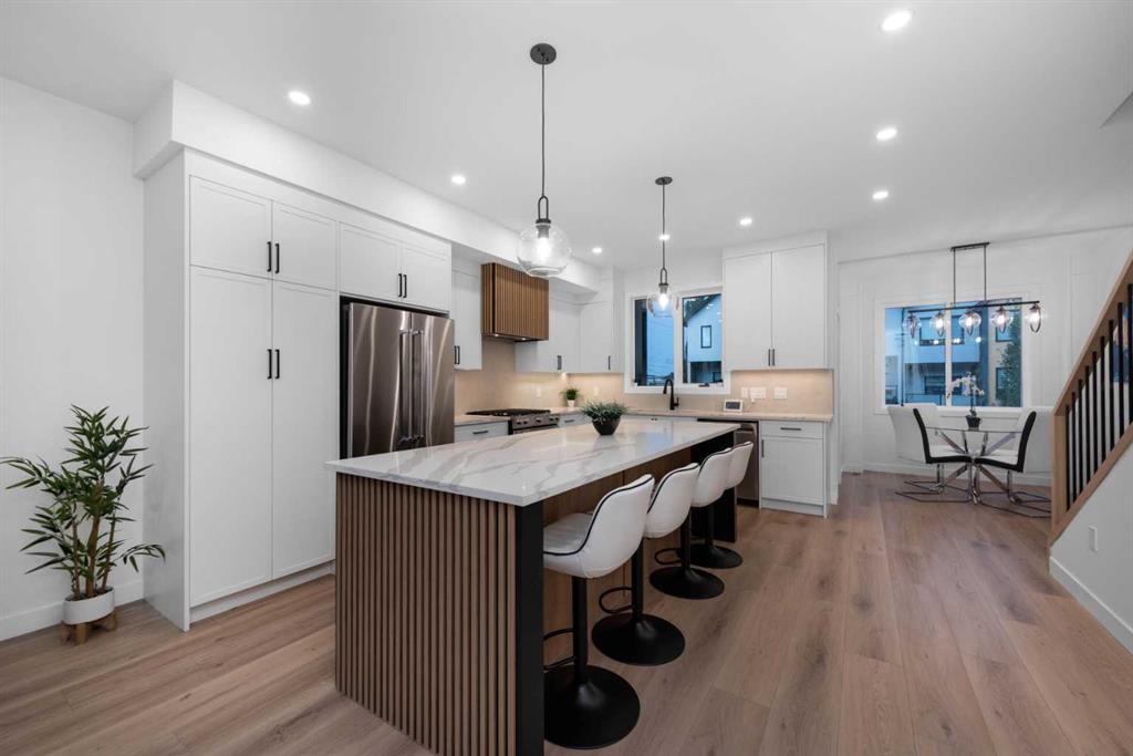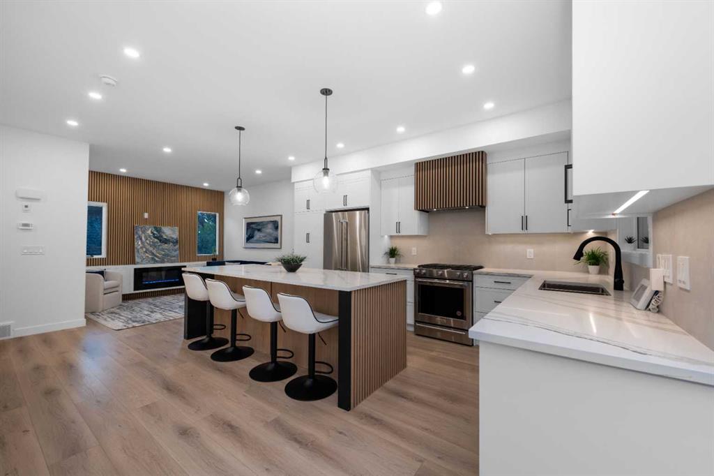 READY TO MOVE IN, BRAND NEW. The Opal on Westmount – Redefining luxury living in West Hillhurst. A modern contemporary 3-story row home just steps from shops and cafés, the Bow River pathway, and the vibrant amenities of Kensington. Designed for those who value elegance, functionality, and convenience, The Opal on Westmount offers a lifestyle that’s deeply connected to nature and city life, all within walking distance to great schools, churches, and outdoor recreational spaces. Situated on the corner of 23 Street and Kensington Road, this home offers unmatched convenience with quick access to downtown, Memorial Drive, and Crowchild Trail. Spanning 1,746 square feet of living space, this townhome is meticulously designed to accommodate active and professional lifestyles. The entry level features a versatile flex room with access to the garage and backyard storage; ideal for a home gym or storing bicycles, skies, and sporting equipment. The main floor has an open-concept layout, starting with a beautiful open living room that features an electric fireplace and wood slate acoustic feature wall. Beside that is a luxurious powder room draped in wallpaper. The gourmet kitchen is designed for entertaining with an unobstructed 9 ft island that can easily seat 4, shaker-style cabinets, a custom wood-slate hood fan, upgraded kitchen aid appliances, a gas range, double sized pantry, and an east facing sink that looks out the window towards the city skyline. Lastly, the main floor features a spacious dining area leading to a private 70 sq ft balcony that has a gas line perfect for a BBQ set up. The top floor is designed for comfort. The primary bedroom has a vaulted ceiling and features the custom wood slate panelling that is used throughout the home. A walk-in closet is hidden behind a pocket door, while the 4-piece ensuite boasts a standing shower and double sinks on an 7 ft vanity, with custom double mirrors on a upgraded wallpaper. Two additional well-sized bedrooms, a 4-piece main bathroom, and a convenient top-floor laundry complete the space. Throughout the home, contemporary finishes and premium materials add a touch of understated elegance. Sustainability meets convenience as the home is fully roughed-in for solar panelling and electrical vehicle charging, providing future-forward solutions for today’s homeowners. Outside, the low-maintenance landscaping is practical as it is beautiful. Move in ready! Book your private showing today.