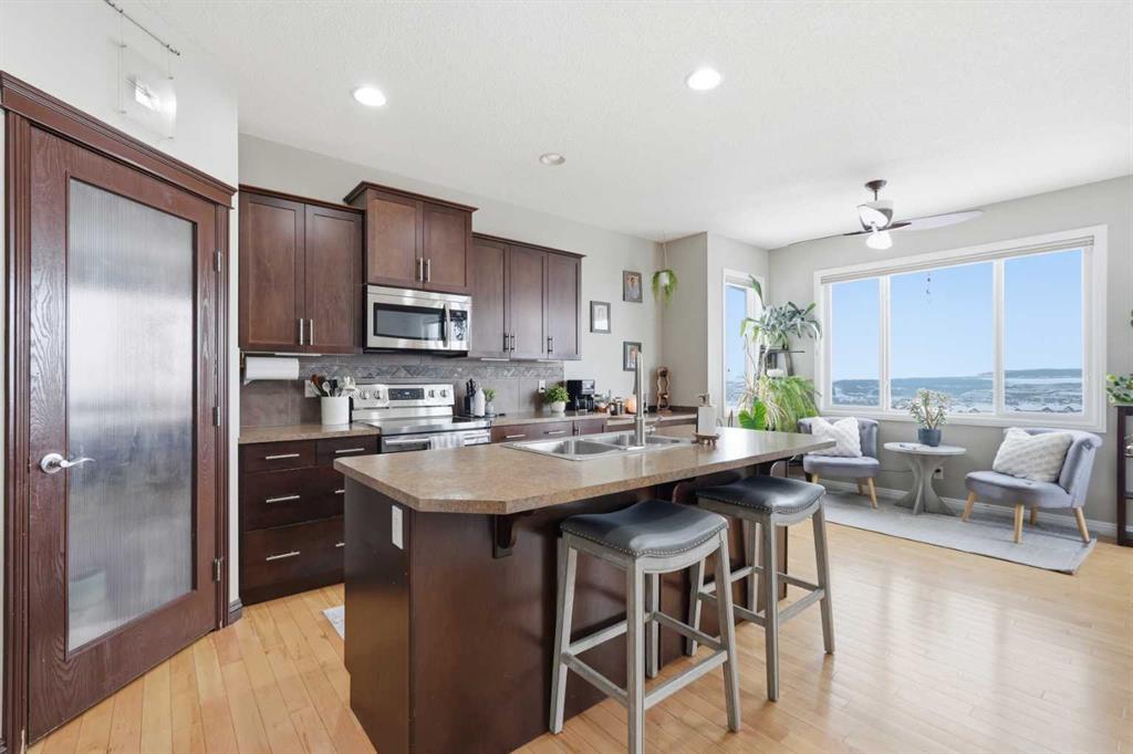 Properties like this don’t come along often. Situated on a quiet street in Sunset Ridge, this exceptional home rests on a sprawling PIE-SHAPED lot BACKING ONTO PATHWAYS AND GREEN SPACE, with UNOBSTRUCTED VIEWS of the Rocky Mountains. Inside, you are welcomed by a bright foyer with vaulted ceilings that leads into the open-concept kitchen, living, and dining area. This Jayman-built home features hardwood and tile flooring, maple cabinetry, upgraded appliances, a corner pantry, and a kitchen island, perfect for family gatherings. With a SOUTH FACING exposure, enjoy stunning views from all three levels all day long. Relax on the patio with a cool beverage or a BBQ while taking in the gorgeous mountain backdrop. The main floor also includes a home office with french doors, a half bathroom, and a mudroom. Upstairs, the freshly painted bonus room is perfect for family movie nights or a kids play area. The large primary suite offers breathtaking mountain views, a large walk-in closet, and a spa-inspired ensuite with a dual vanity, shower, and soaker tub. Two additional bedrooms and a full bathroom complete the upper level. The fully finished walk-out basement adds versatility with a fourth bedroom, 3pc bathroom, spacious rec/games area, and a fully finished laundry room with tons of storage. Direct access to the backyard makes it ideal for guests, teens, or multi-generational living. A double attached garage adds to daily convenience. Recent upgrades include: two A/C units, newer basement carpet and underlay, a newer stainless steel fridge, and hot tub wiring already in place. Solar panels provide long-term energy savings that significantly reduce electricity costs. Enjoy access to scenic walking paths, parks, schools, and local amenities, all while being just a short drive to the mountains and an easy commute to Calgary. Known for its elevated views, family-friendly atmosphere, and connection to nature, this is a community you’ll love coming home to. Imagine summer evenings here… the sun setting behind the mountains, kids playing in the yard, friends gathered on the patio, and nothing but open sky and nature behind you. This is the kind of backyard people wait years for.
