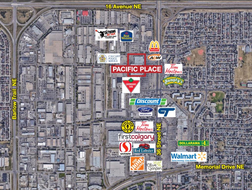 Pacific Place Mall has tremendous opportunities for businesses looking for temporary or longer term leases from 322-2,646 square feet. With over 60 shops and services including T&T Supermarket, Pacific Place Mall has become one of the busiest shopping destinations in the NE and has developed into one of Calgary’s favourite multi-ethnic shopping centres; offering customers a variety of Asian products and services. This vibrant and dynamic retail centre is conveniently located near the Marlborough LRT Station with excellent exposure and visibility to 36th Street (approx 39,000 vehicles per day). Anchored by a busy T&T Supermarket with Canadian Tire next door, Pacific Place Mall caters to a growing NE Calgary neighbourhood and beyond as customers seek a shopping and dining experience not found elsewhere in Calgary. Other major businesses include Jollibee Restaurant, Oomomo Japan Living, Fit 4 Less Gym, Prime Health Clinic, Canada Diagnostics Centre and Bianca Amor Liquidation Centre.