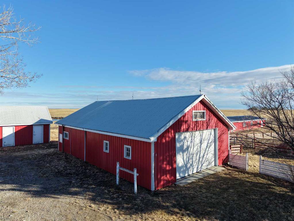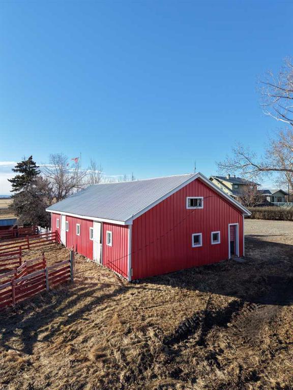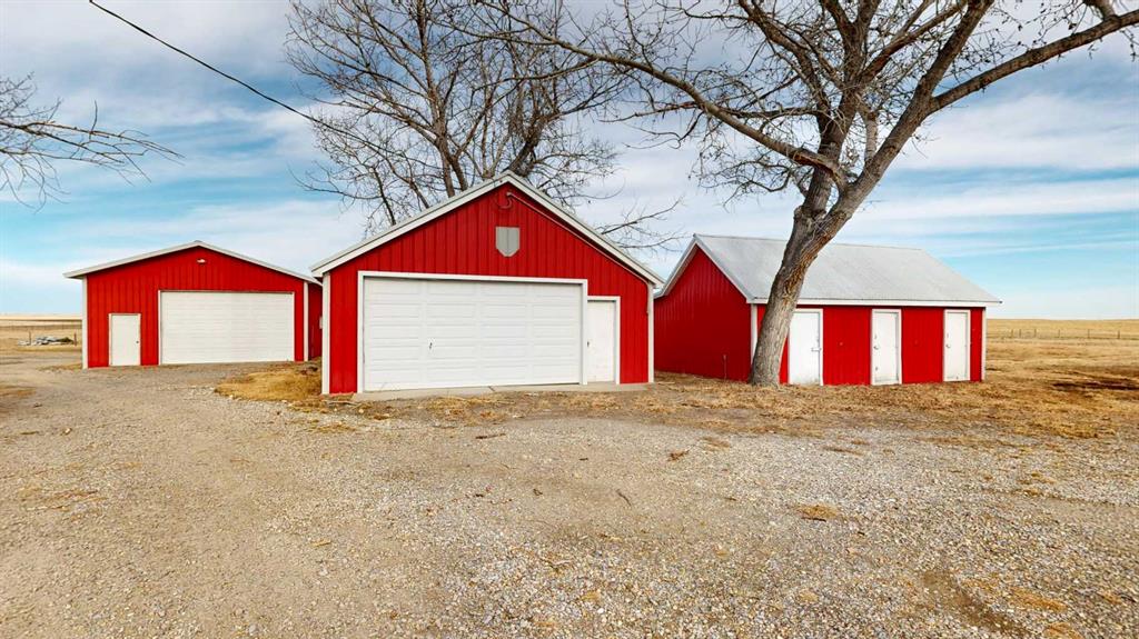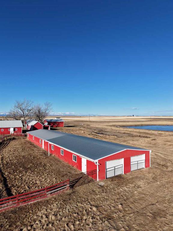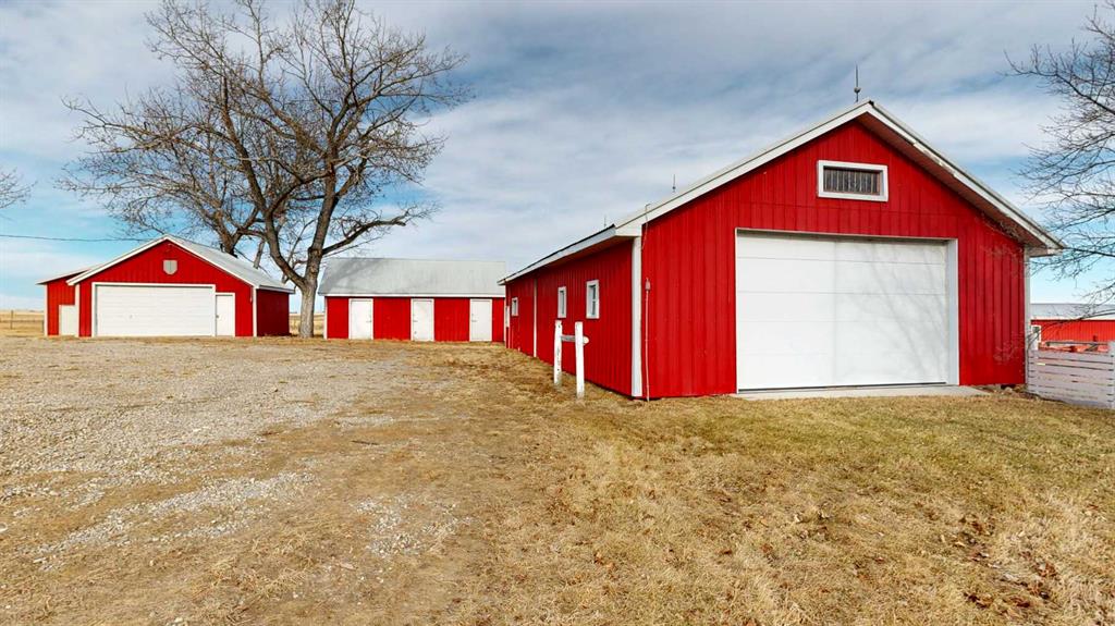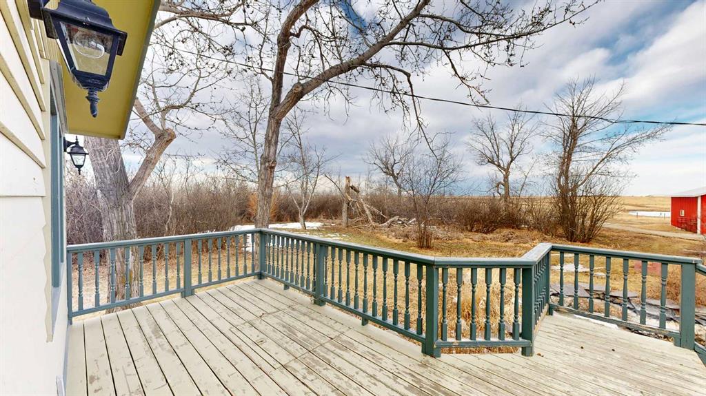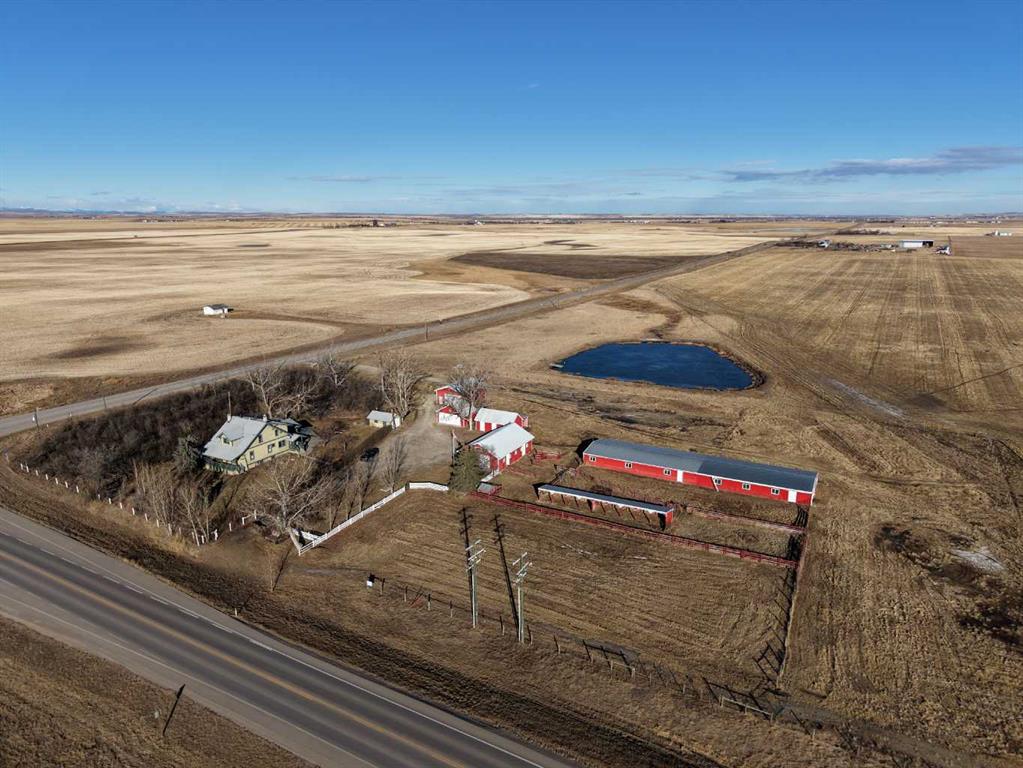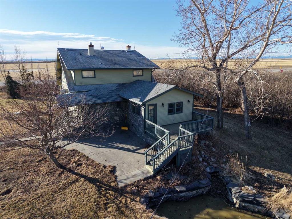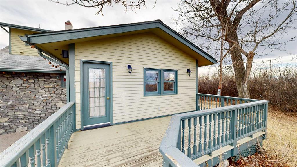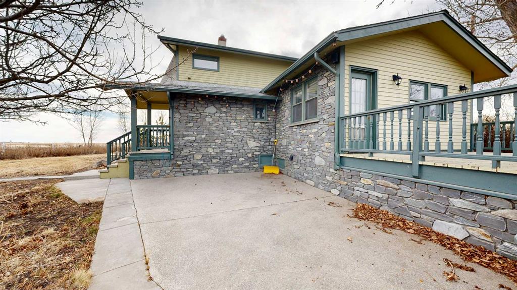 Built in 1910, this charming two-story farmhouse sits on 4.94 acres with easy paved access, blending timeless character with thoughtful updates. A welcoming covered front verandah and spacious back deck overlook a mature yard complete with shelterbelt, established trees, patio area, and a picturesque pond feature. The main-floor primary bedroom is a later addition, offering a private ensuite bath and direct access to the deck. Inside, the home features five bedrooms in total, two laundry areas (main floor and upper level), a cozy breakfast nook, and both formal and casual dining spaces. Crown molding, French doors, and a wood-burning fireplace add warmth and elegance, with French door access into the inviting living room. The fully perimeter-fenced property includes new fencing and an impressive array of outbuildings—garages, workshops, barns, and corrals—ideal for hobby farming or country living. An amazing farmhouse setting with convenience in mind, located just 10 minutes from High River.
