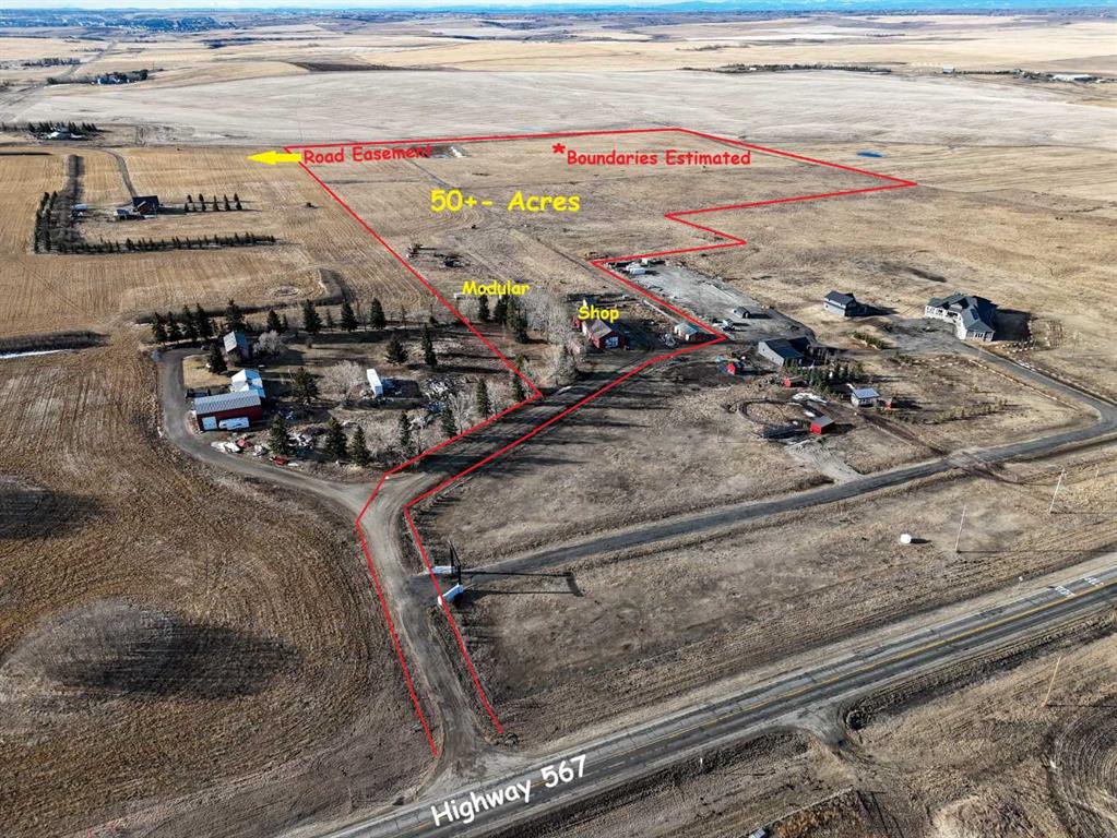 First time offered!! 50 acre opportunity property located at intersection of Symons Valley Road and HWY 567 (Big Hill Springs Road), straight west of Airdrie. Unbeatable mountain views, slightly rolling terrain, and convenience of paved road to the driveway. 1040 sq.ft. , 2 bedroom, 2 bathroom, fully serviced Modular home on site (could be sold and moved, with new home built to replace it). 105′ x 35′ 3-section shop plus another 23′ x 38′ storage building. Fenced and cross-fenced.. Approximately 15 minutes to Airdrie and North Calgary, and 25 minutes to Calgary International Airport. Site is zoned A-SML,, but location would suggest future property development opportunities, with existing road easement to Symons Valley Road. Approximately 4-acre lease generates $4,500/year revenue for the property. Planted grazing lands are organic, with no applied chemicals for past 20 years. Multiple walk-out building sites with unrestricted mountain views Available with short notice!