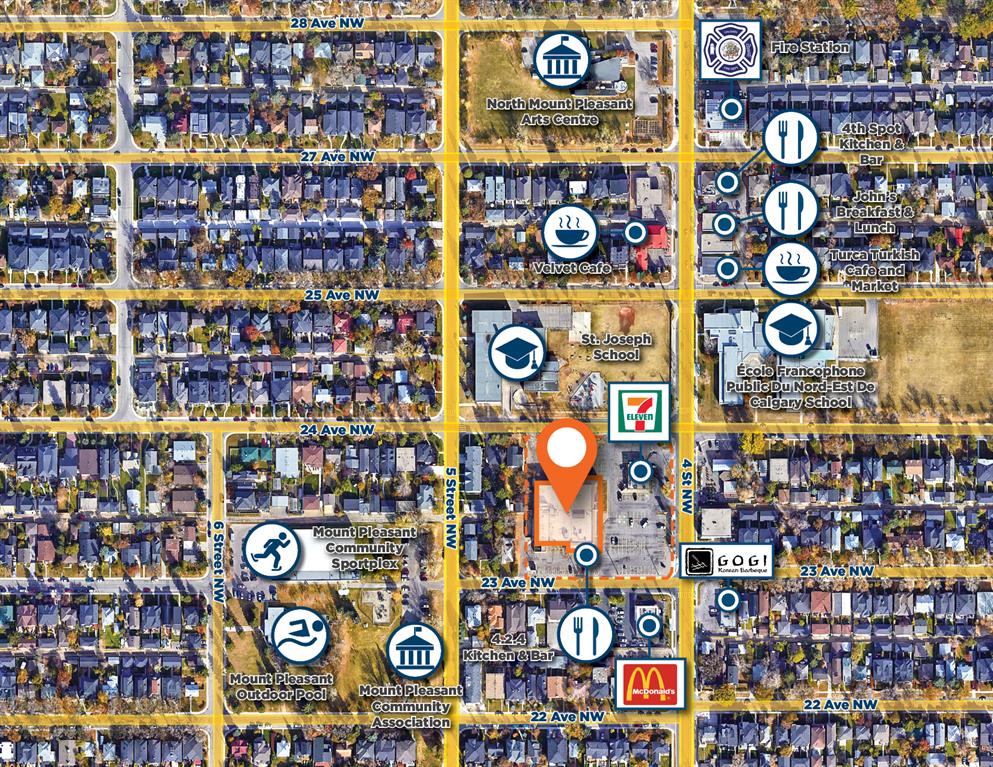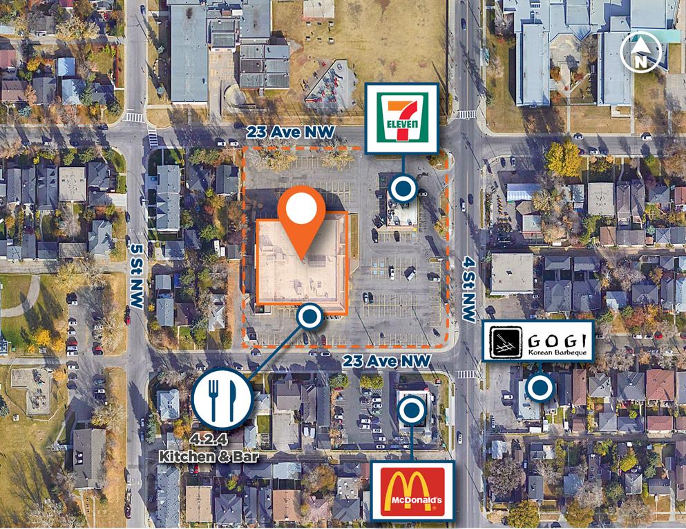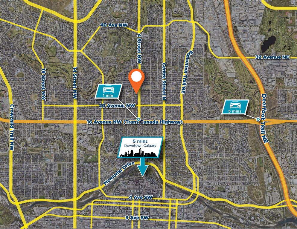 A commercial restaurant and bar, as well as a child education facility, are located on the main floor. Walking distance to cafés, restaurants, sports complexes, and parks. Public transportation is available on 4th Street NW, including bus routes #2 and #404. Close proximity to 16 Avenue NE and Centre Street. Just 5 minutes to Downtown Calgary and 5 minutes to Deerfoot Trail SE via 16 Avenue NE.